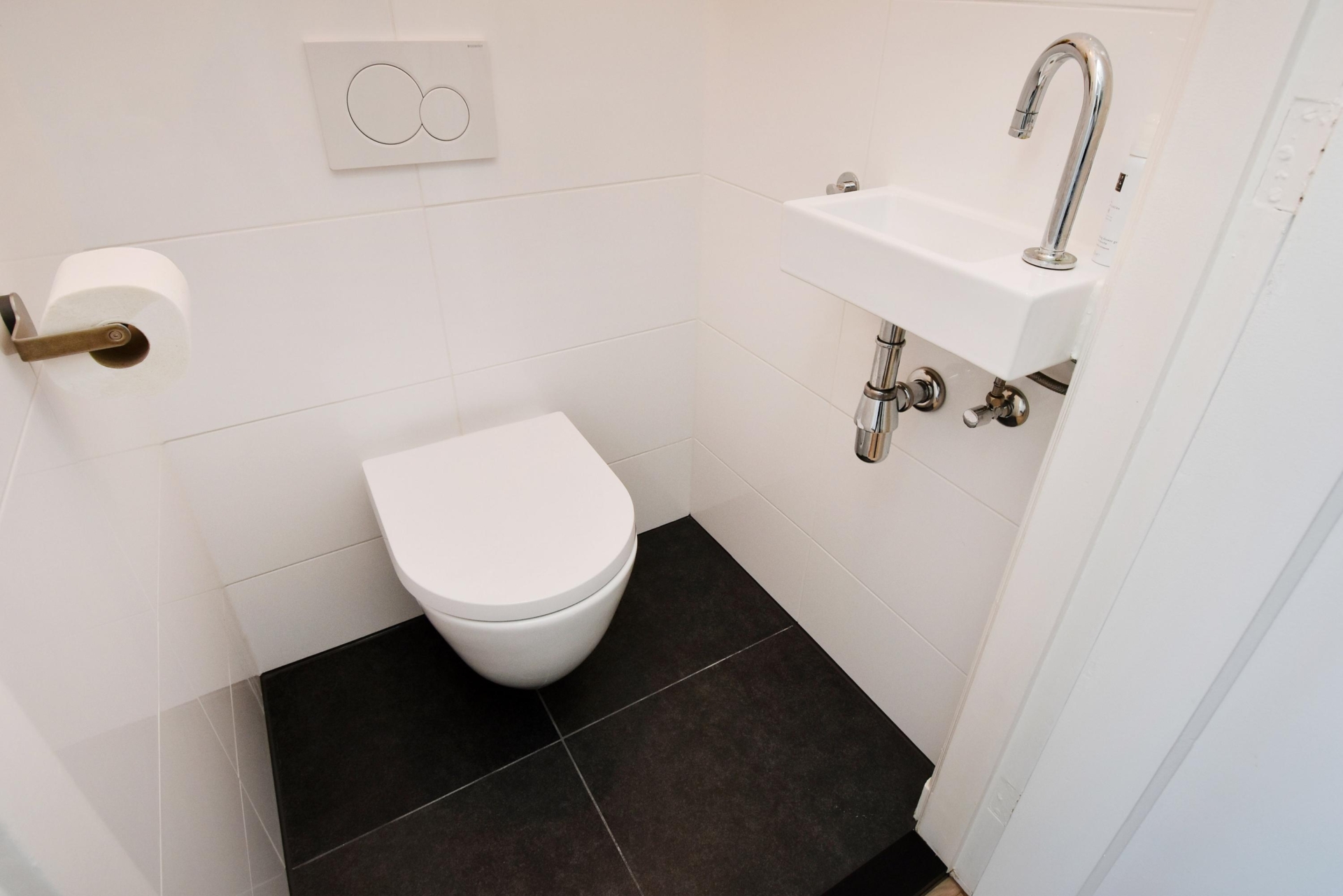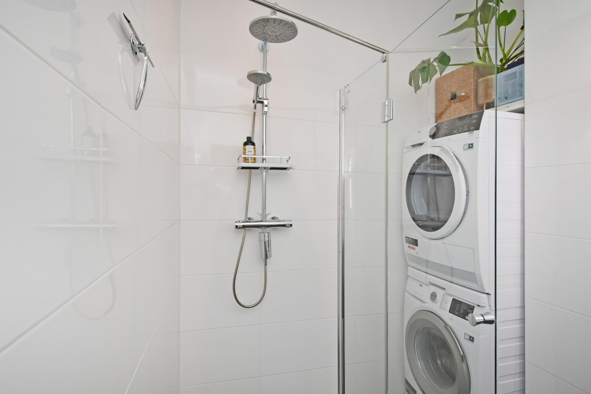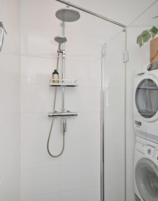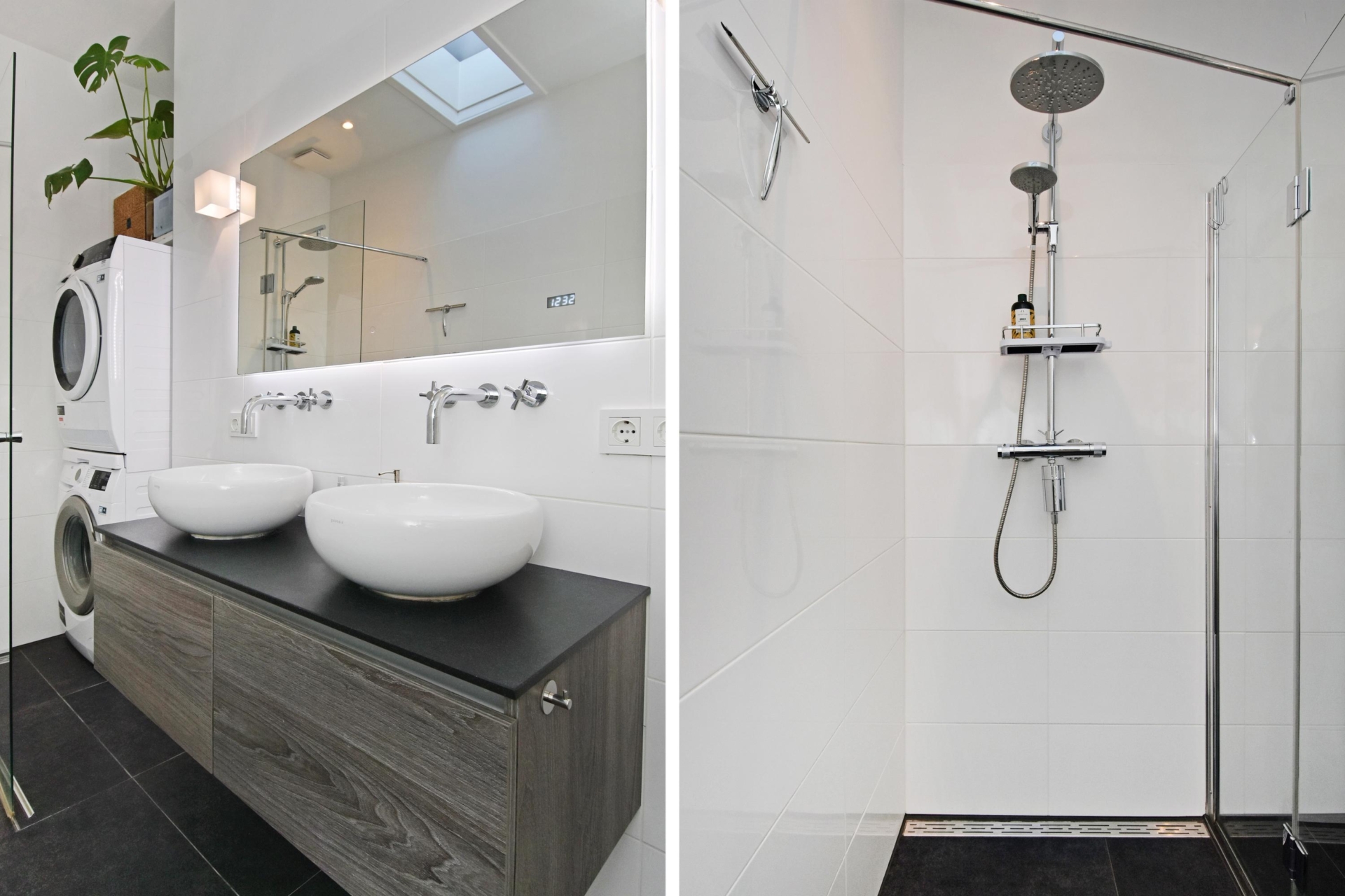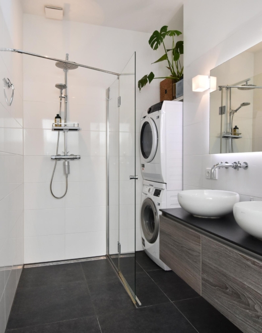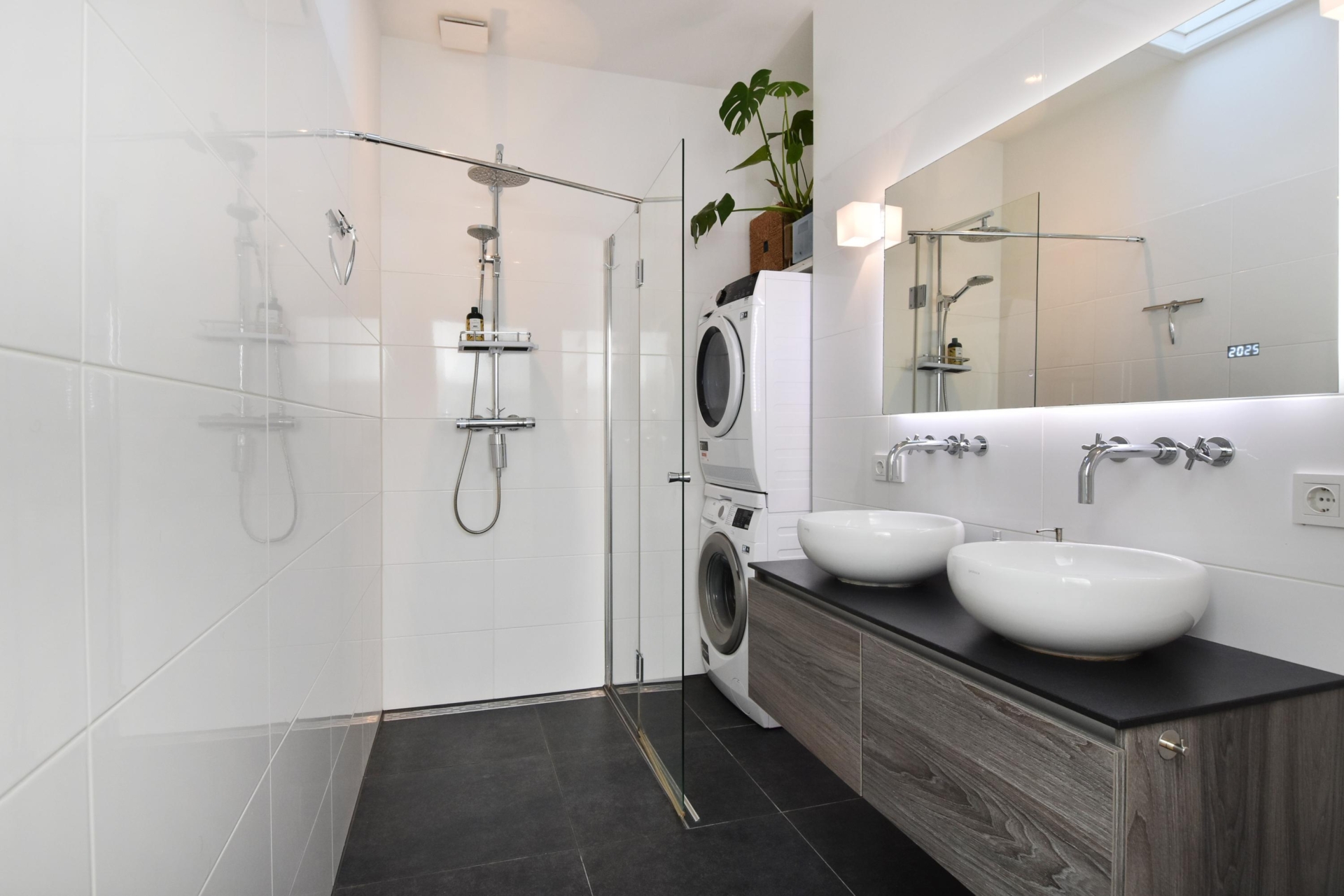 the modern bathroom is fully equipped, featuring a generous walk-in shower, double washbasin with cabinet, led-lit mirror and space for both a washing machine and dryer. the separate toilet is modern, fresh and neatly finished.