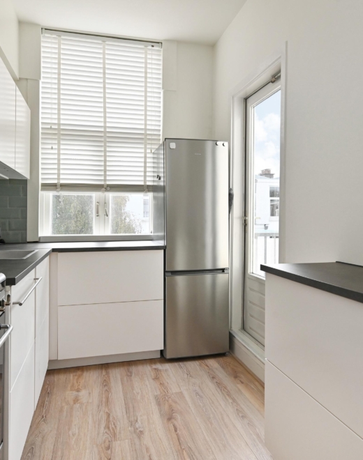 the modern l-shaped kitchen is fitted with a five-burner gas hob, dishwasher, freestanding fridge, and generous worktop space on both sides. from the kitchen, you also have direct access to the balcony. the central heating boiler is neatly concealed within a cupboard.