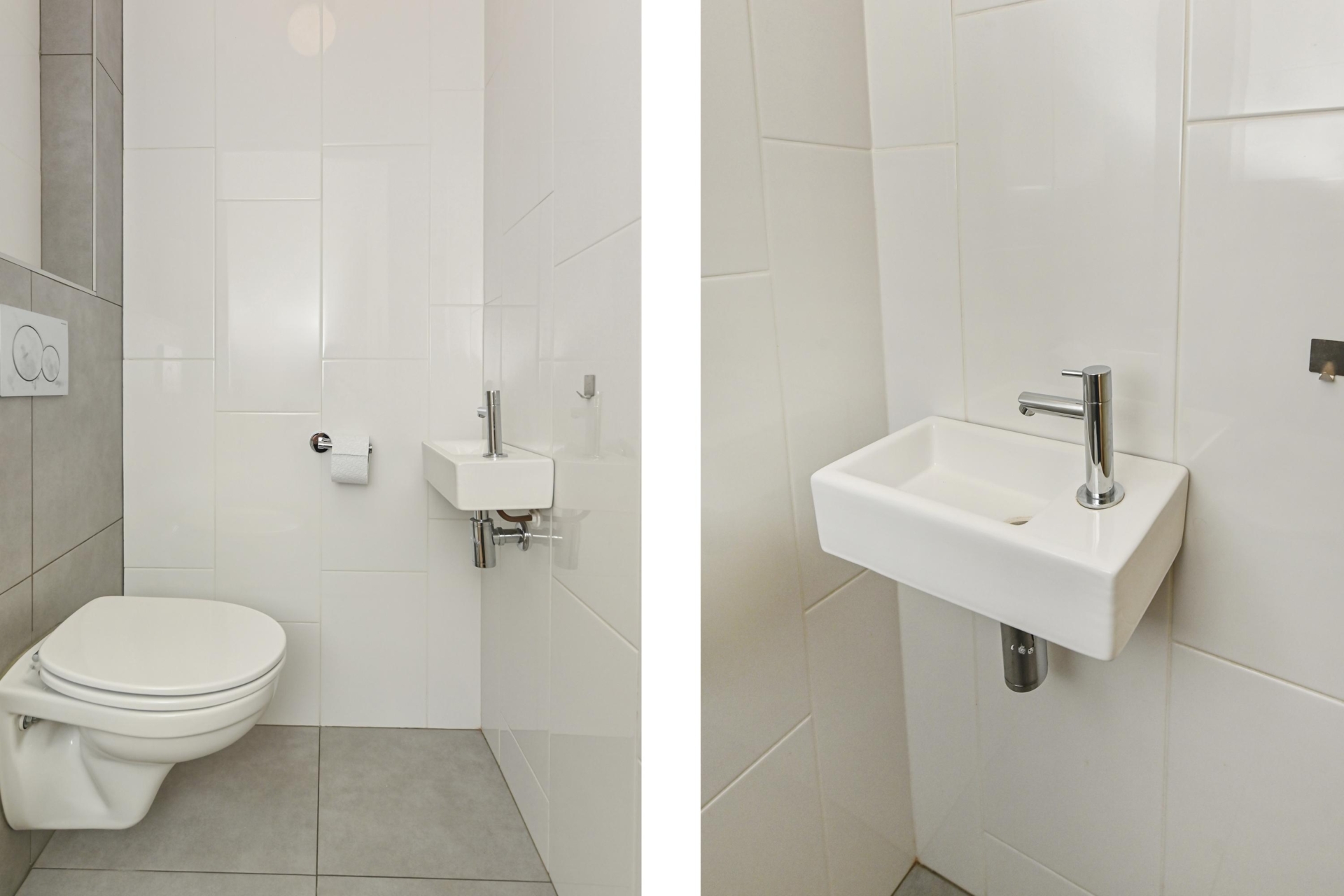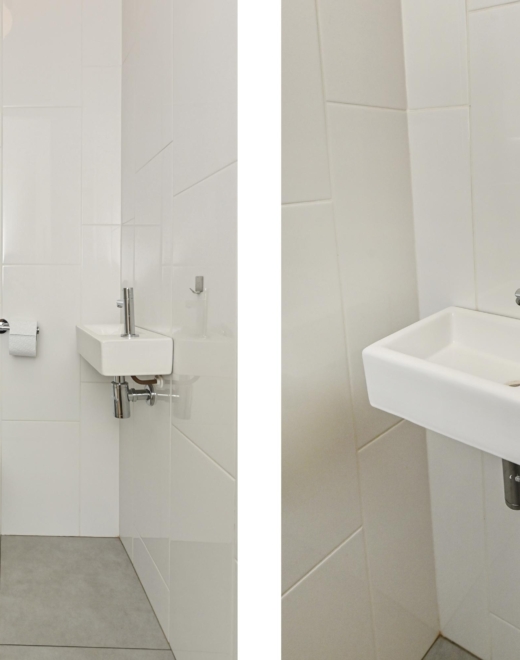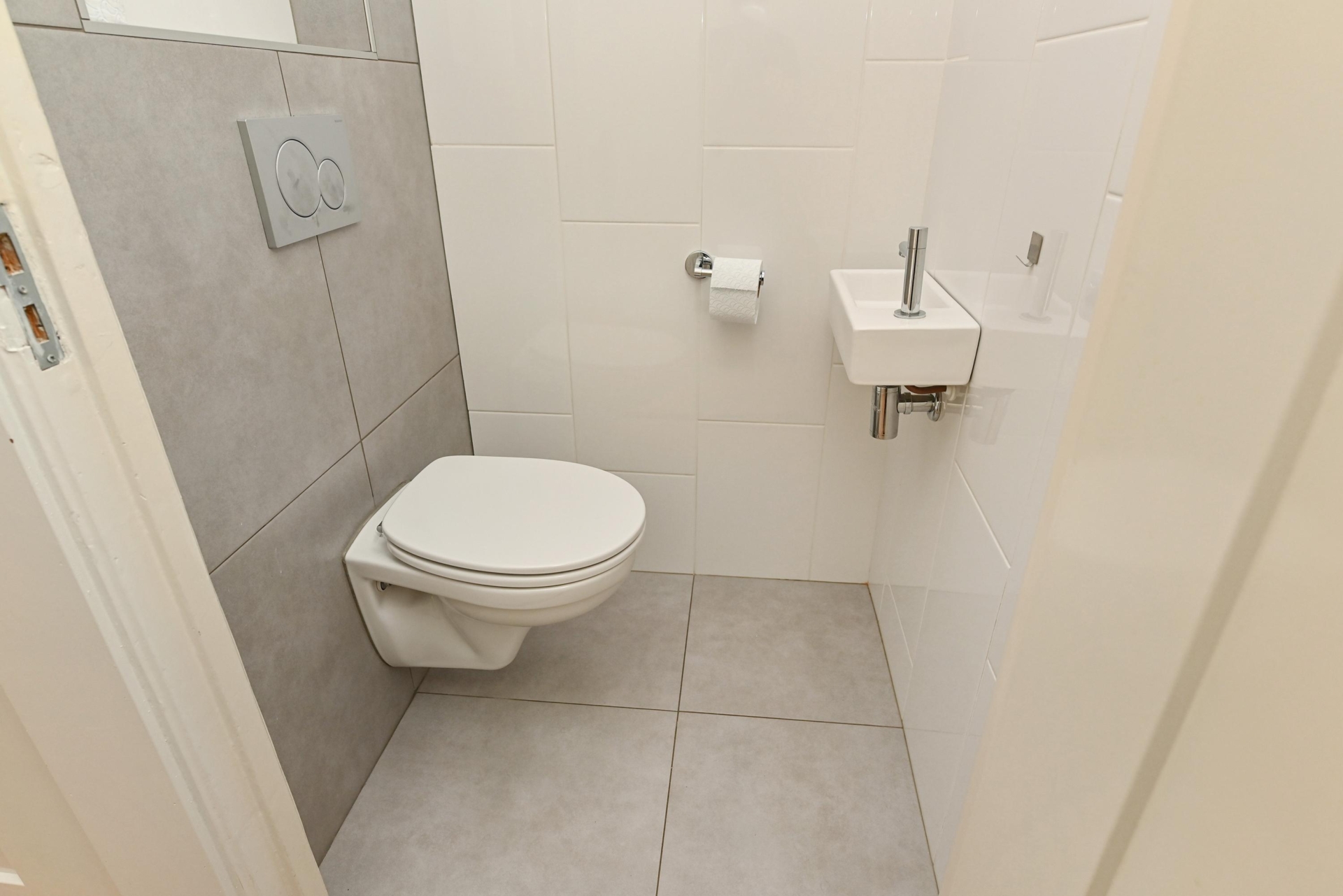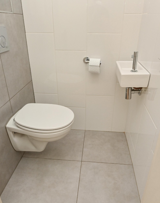 a spacious landing provides access to a built-in laundry cupboard (for washing machine and dryer) and a modern tiled guest toilet with wall-hung wc, hand basin, and ventilation.