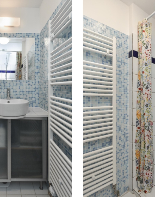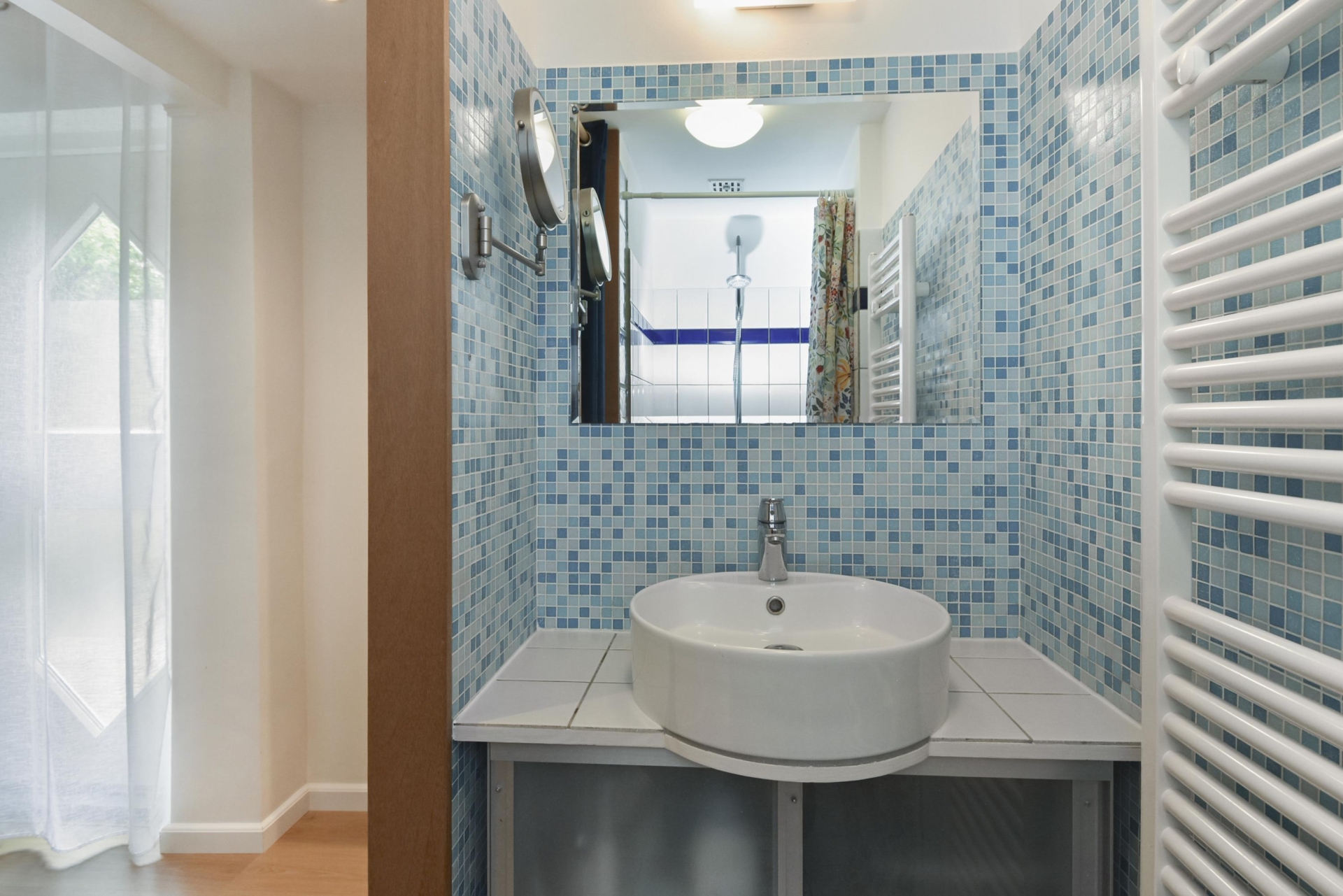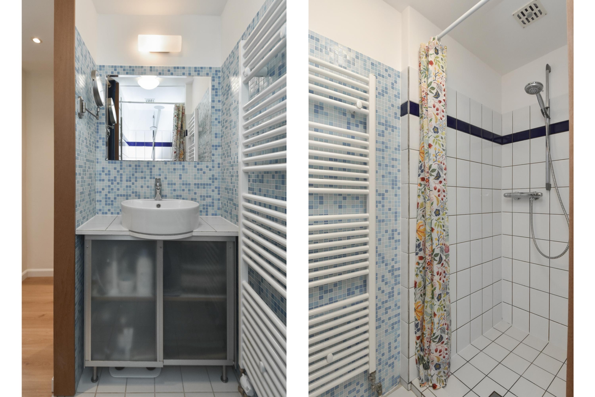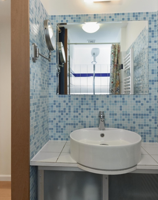 the centrally located bathroom is equipped with a walk-in shower and washbasin unit.