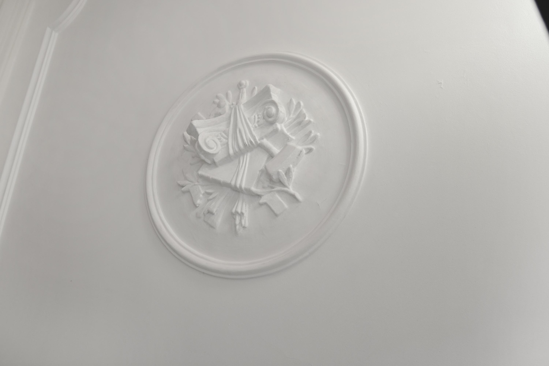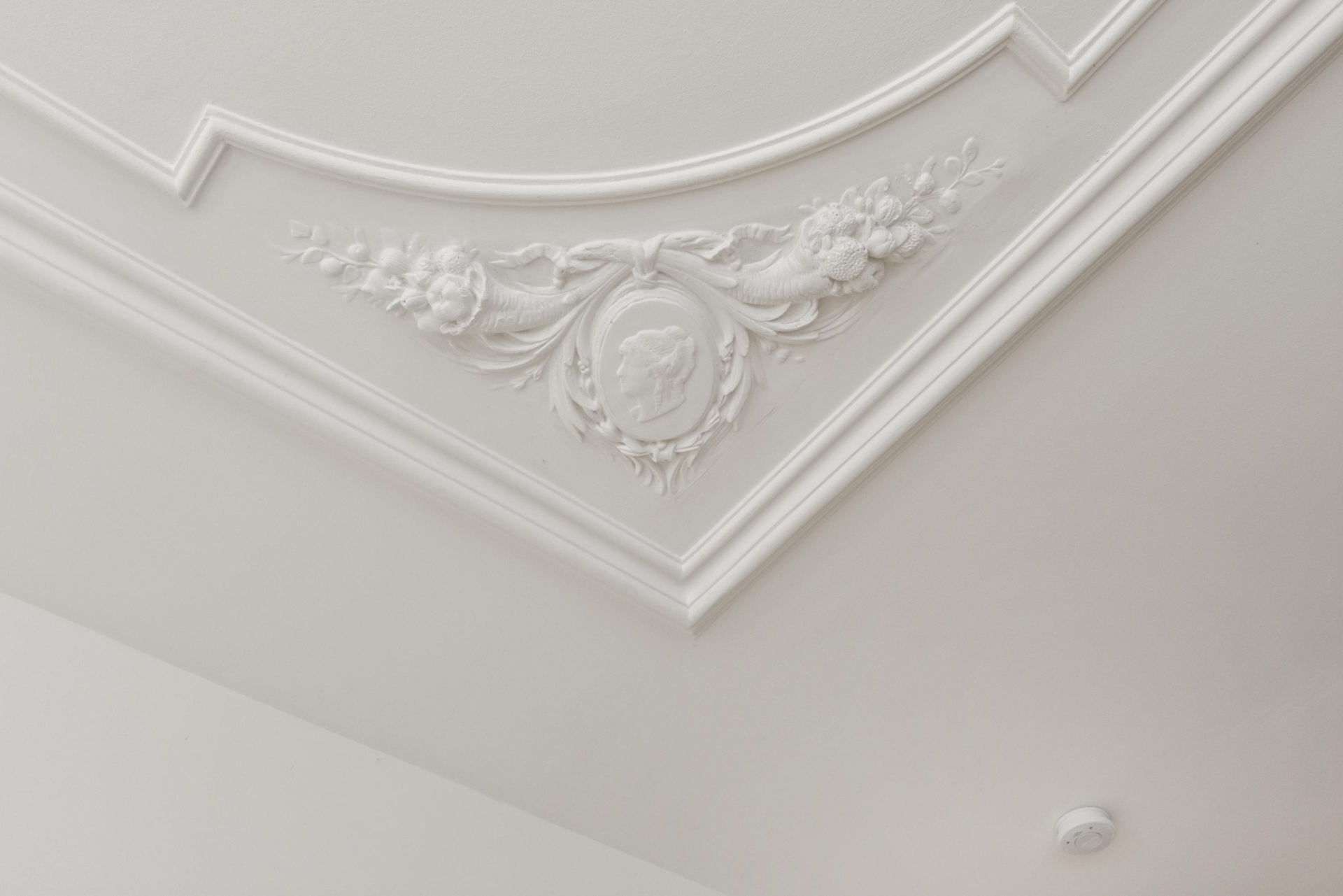 - features original authentic details, including stained glass, ornamental ceilings, and an original fireplace mantel;