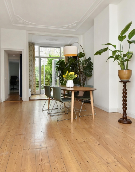 the spacious living/dining room is currently combined and is characterised by pleasant natural light, an attractive layout, and various authentic features, including an ornamental ceiling and an original mantelpiece at the front. the pine wooden flooring continues seamlessly into the kitchen.