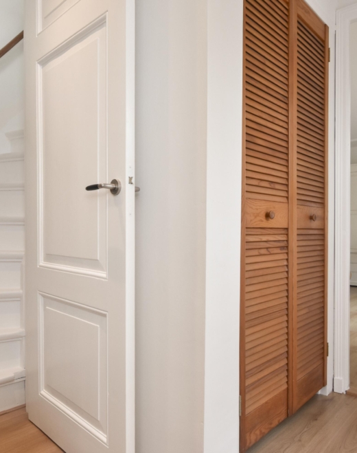 from the rear hallway, there is access to the extension with a vestibule, built-in storage cupboard (with space for a washing machine), and access to the generous rear bedroom overlooking the garden.