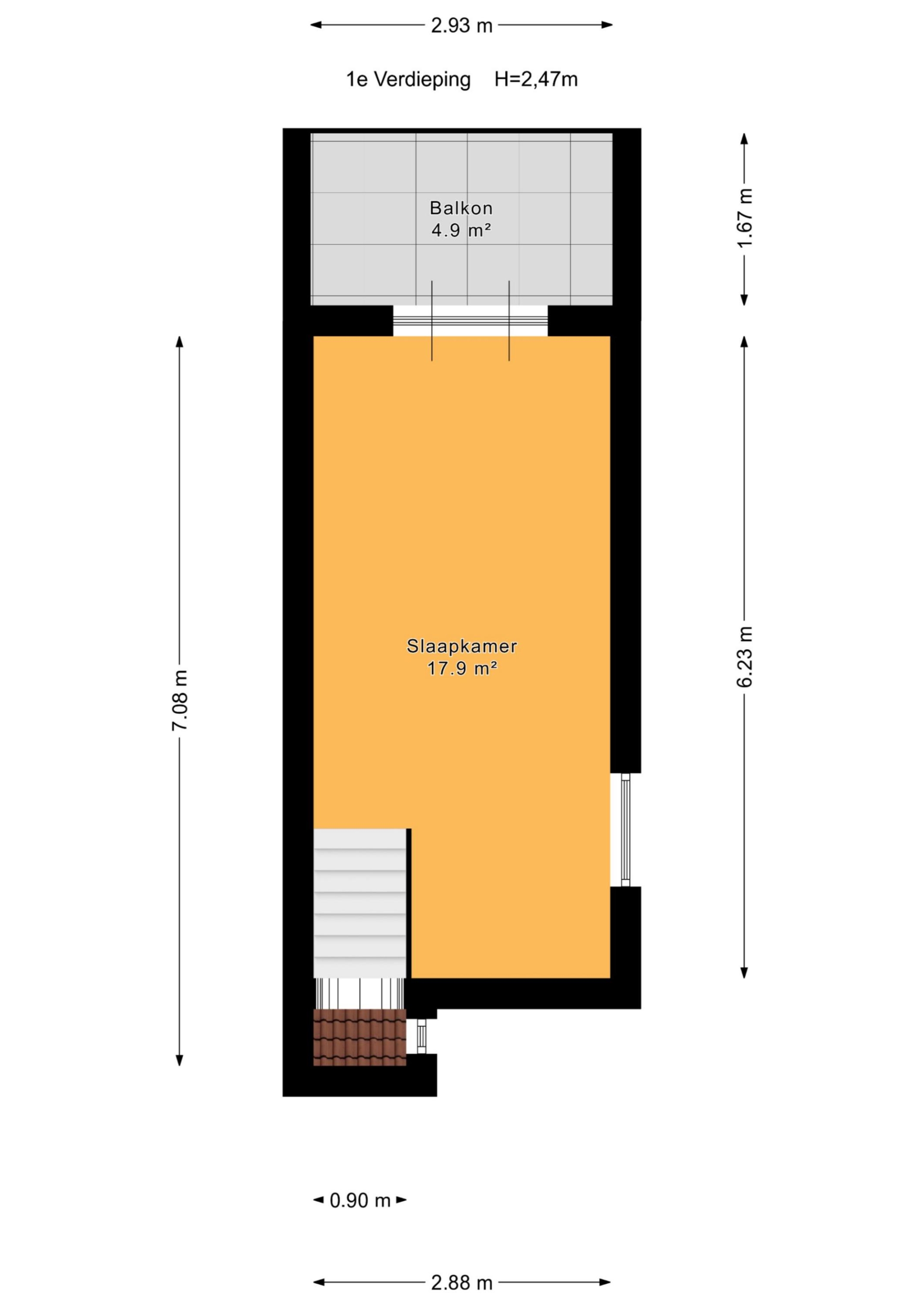 a staircase leads to the second bedroom on the first floor, featuring french doors opening onto the rear-facing balcony.