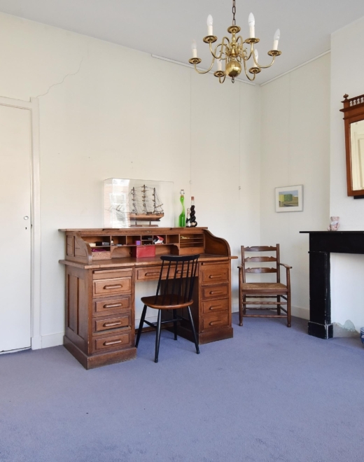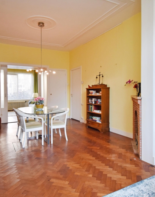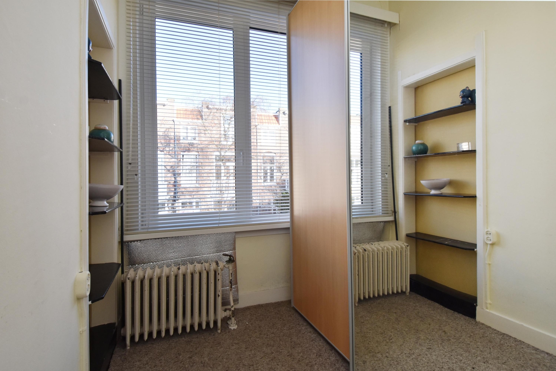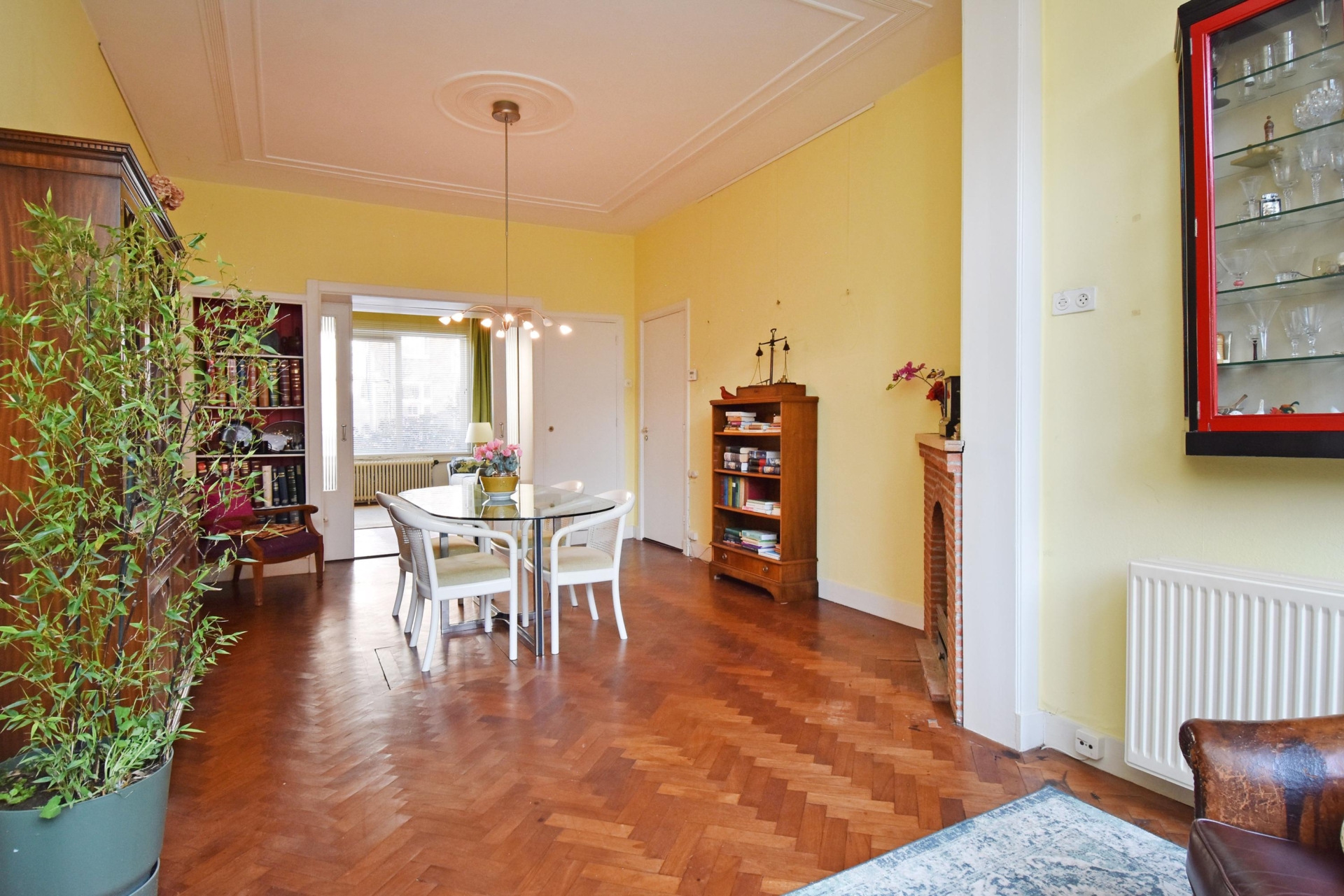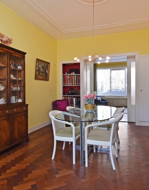 De prachtige kamer en suite is een echte eyecatcher, met fraaie ornamenten plafonds, een klassieke suiteseparatie met 4 vaste kasten en een sfeervolle visgraat parketvloer in beide woonkamers.