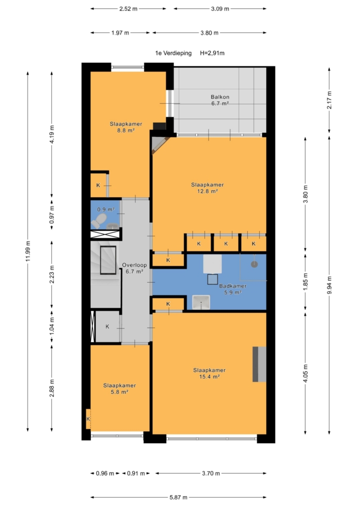 Deze verdieping heeft een ideale indeling met 4 slaapkamers, een zonnig balkon/terras en een grote badkamer.
