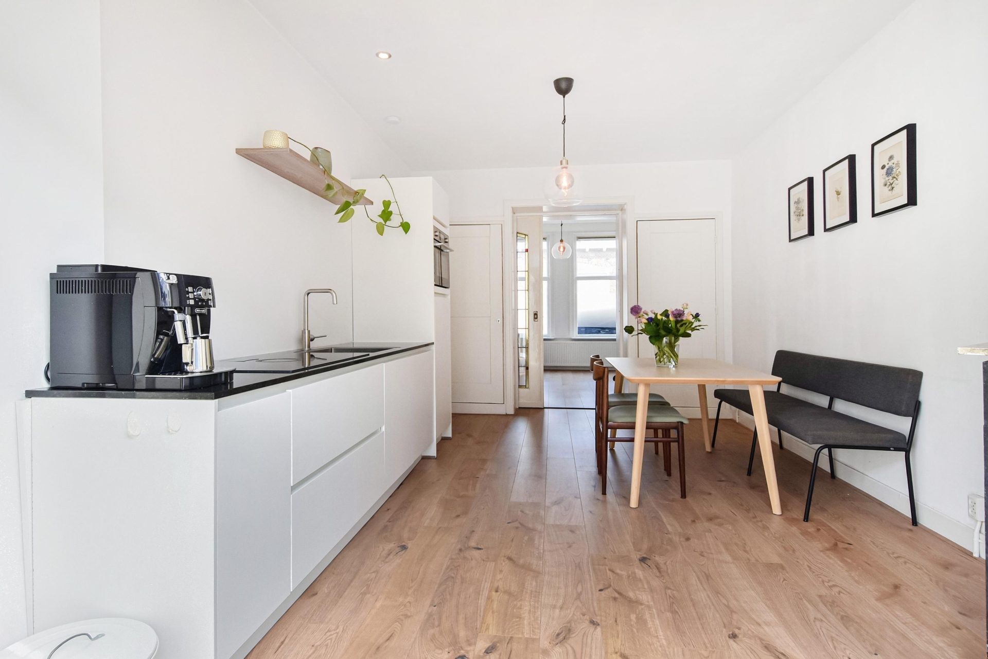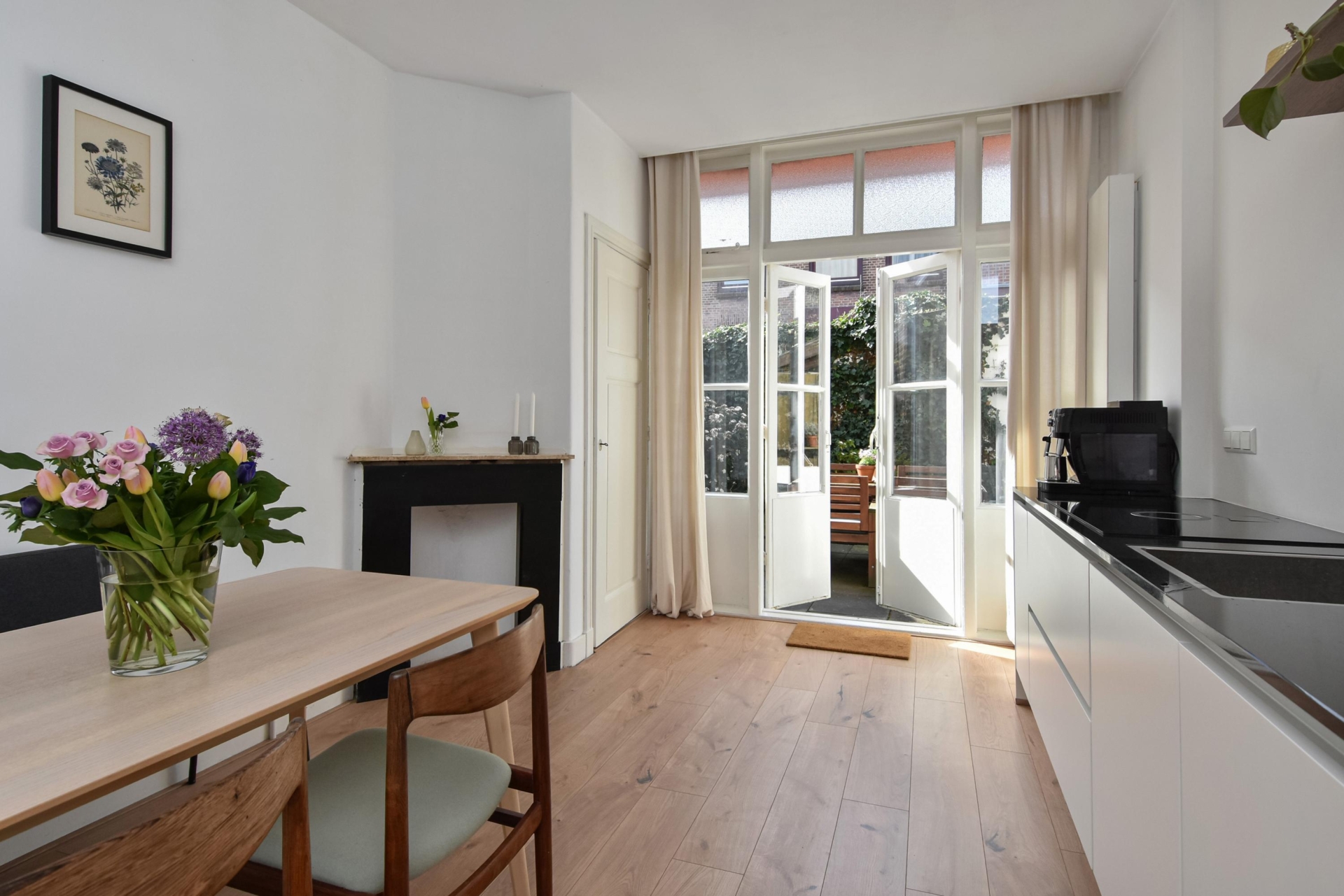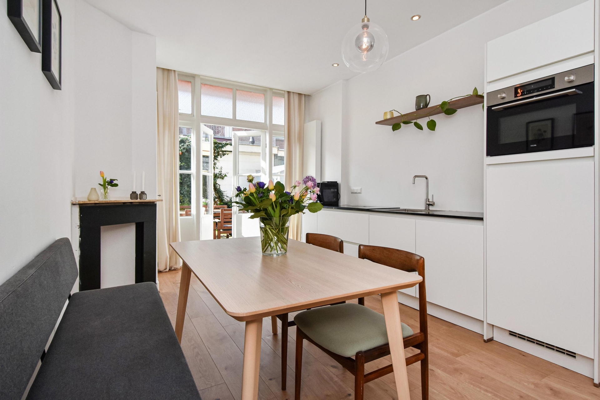 Aan de voorzijde bevindt zich de woonkamer. De ruimte wordt op een sfeervolle manier gescheiden door een schuifseparatie met glas-in-looddetails, wat een charmant karakter geeft. Aan de achterzijde ligt de eetkamer en de moderne open keuken, die is uitgerust met diverse inbouwapparatuur, waaronder een koelkast, combimagnetron, vaatwasser en een inductiekookplaat met geïntegreerde afzuiging. Daarnaast vind je hier drie vaste kasten en een schouw, wat extra sfeer en bergruimte biedt.