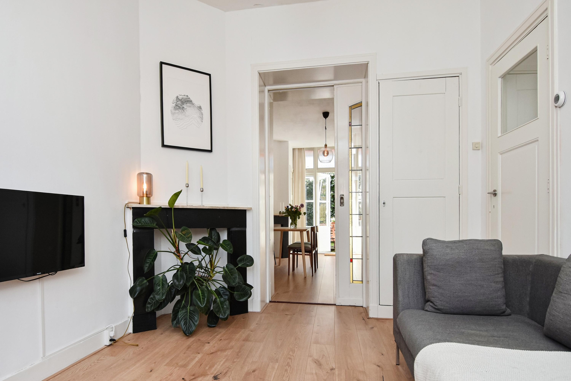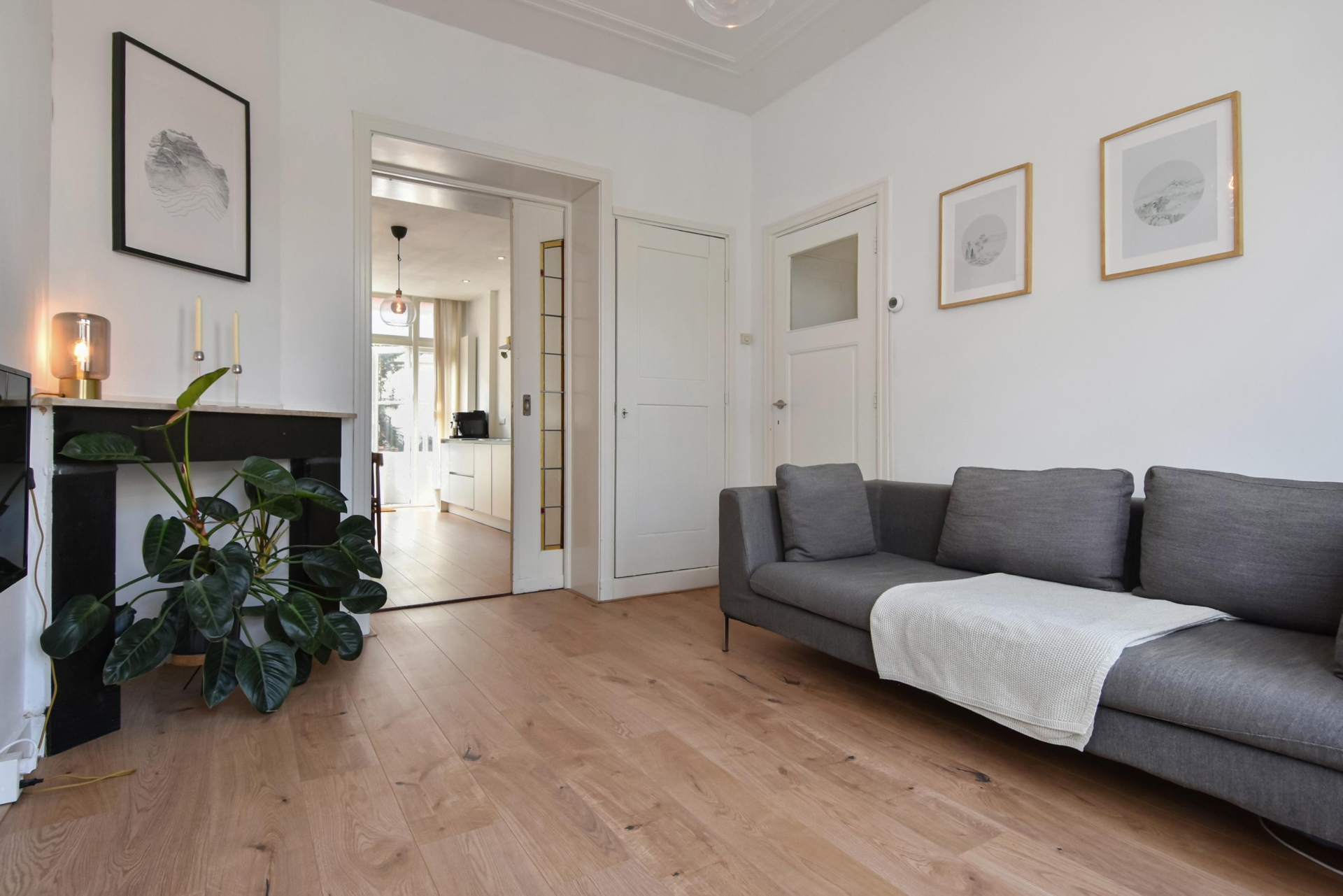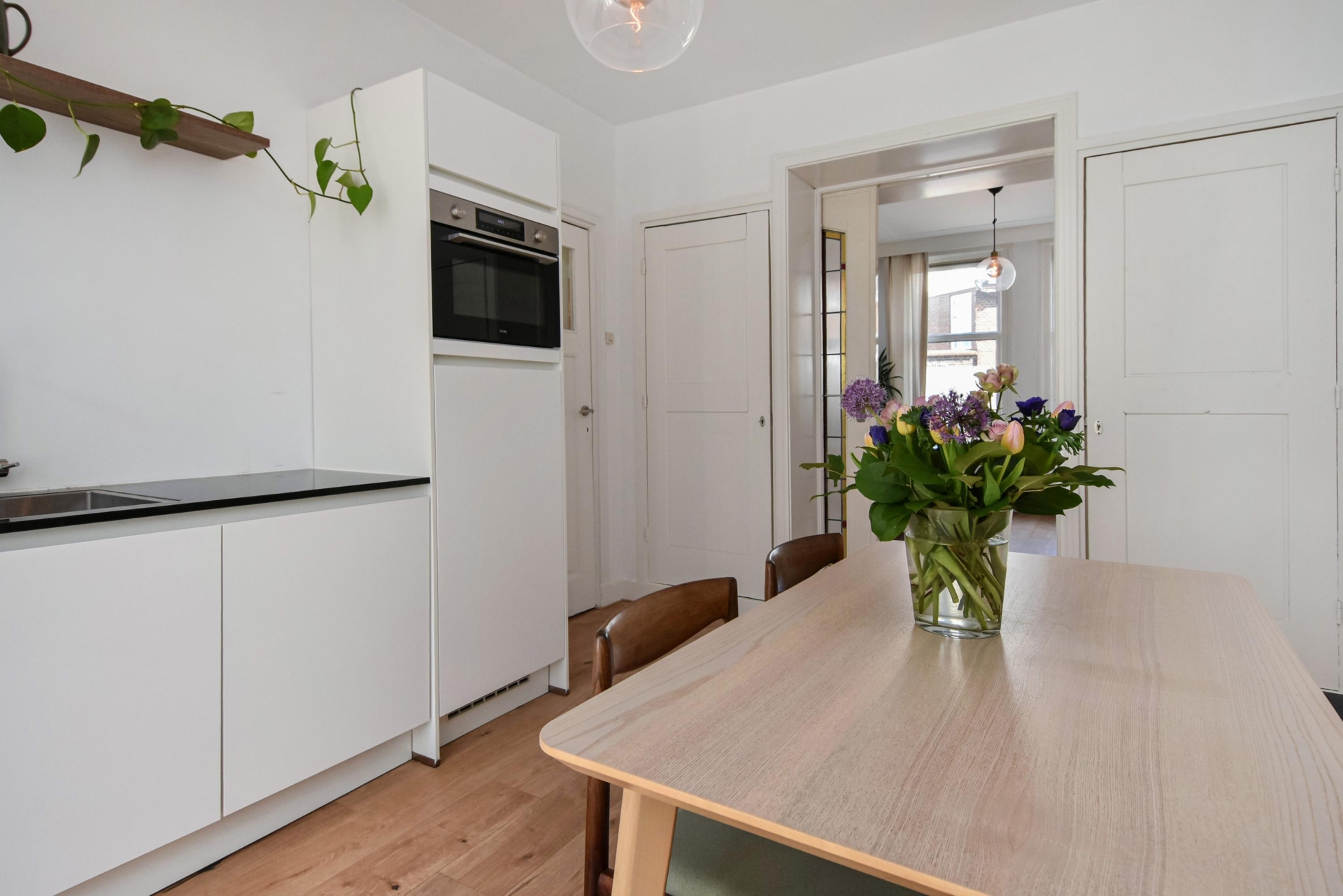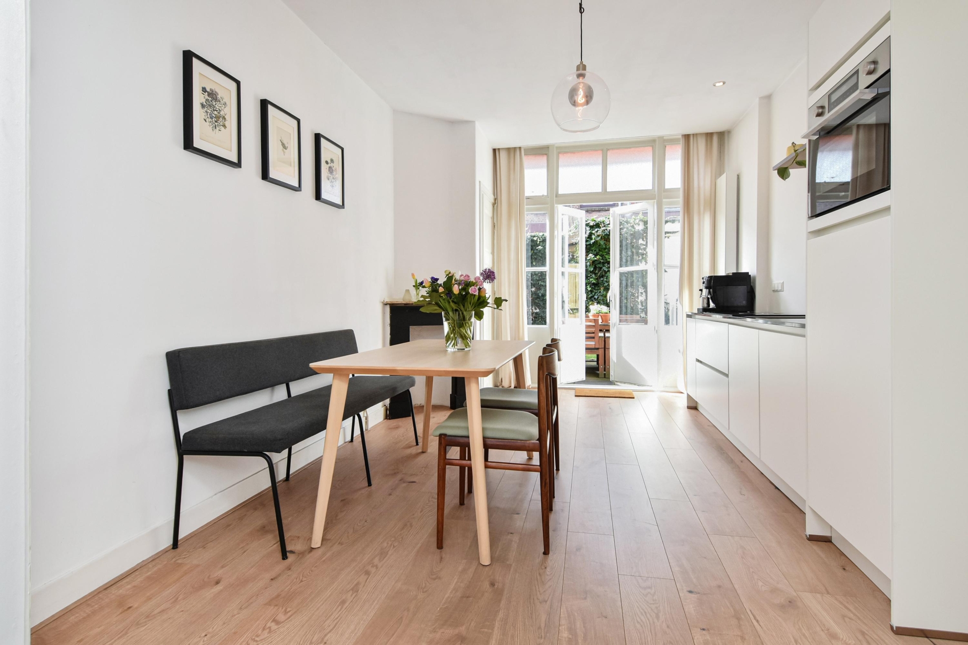 Aan de voorzijde bevindt zich de woonkamer. De ruimte wordt op een sfeervolle manier gescheiden door een schuifseparatie met glas-in-looddetails, wat een charmant karakter geeft. Aan de achterzijde ligt de eetkamer en de moderne open keuken, die is uitgerust met diverse inbouwapparatuur, waaronder een koelkast, combimagnetron, vaatwasser en een inductiekookplaat met geïntegreerde afzuiging. Daarnaast vind je hier drie vaste kasten en een schouw, wat extra sfeer en bergruimte biedt.