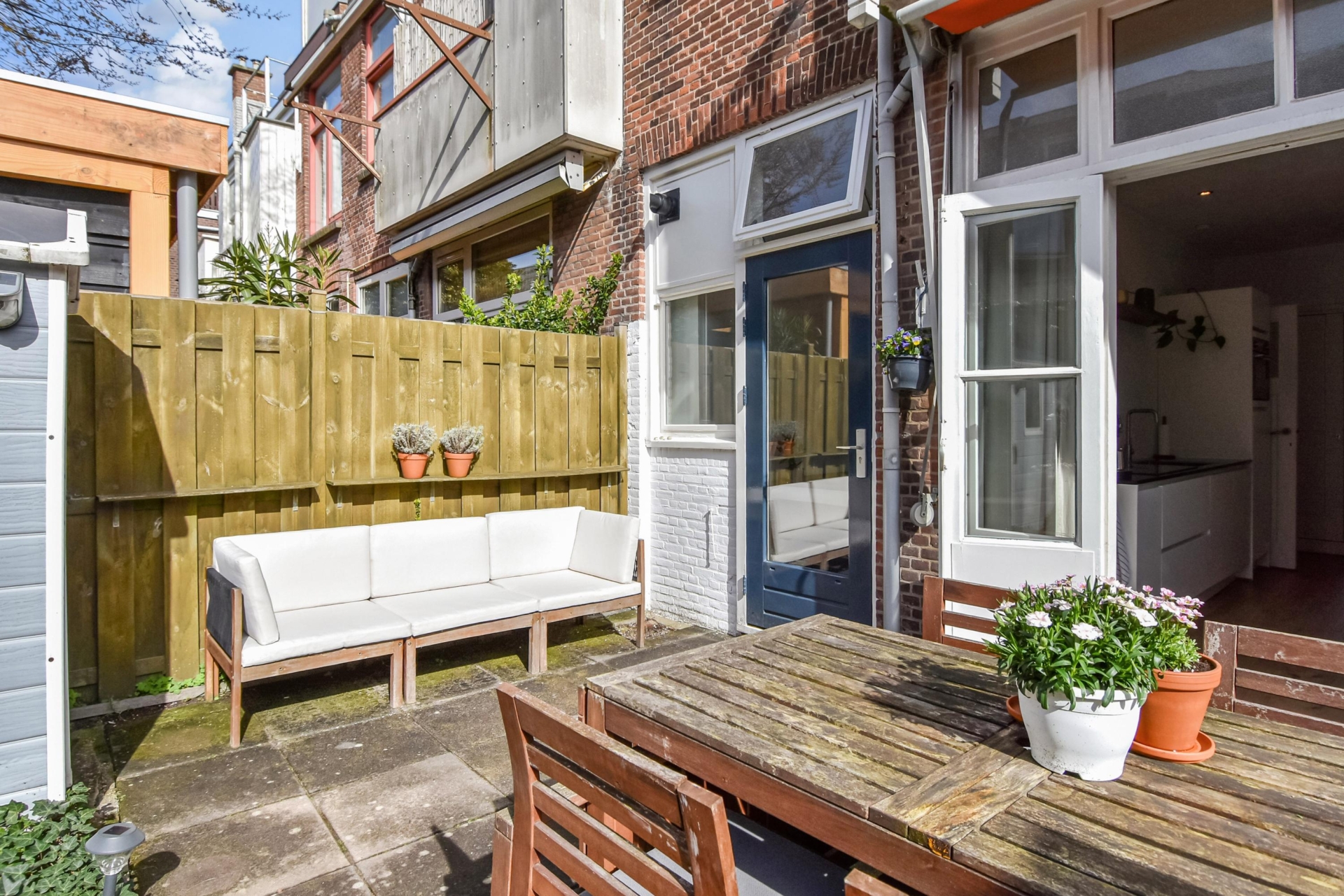 Via de openslaande deuren loop je zo de achtertuin in. Deze is gelegen op het westen, met de middag- en avond zon. Het is hier heerlijk vertoeven.