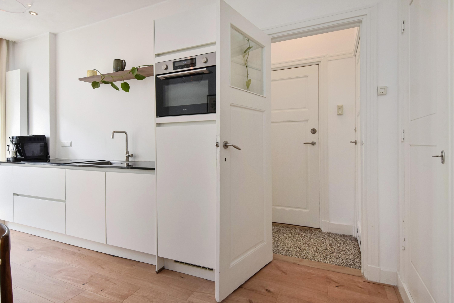 Via een afsluitbaar halletje aan de achterzijde bereik je de achterkamer en vind je tevens een praktische ruimte met de aansluiting voor de wasmachine.