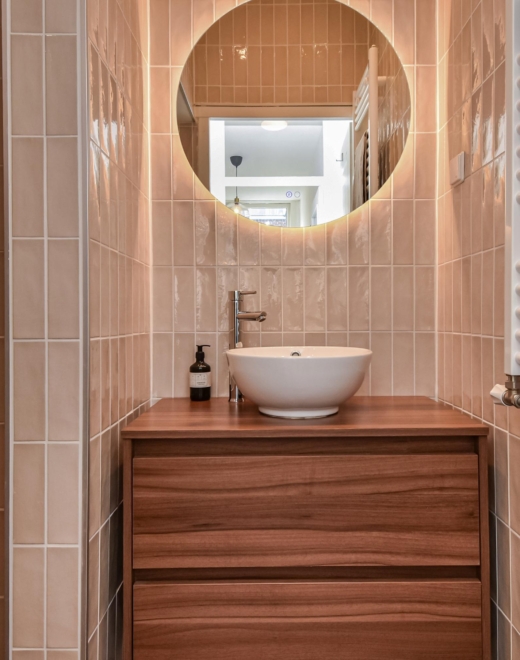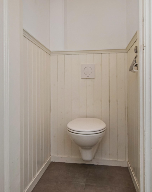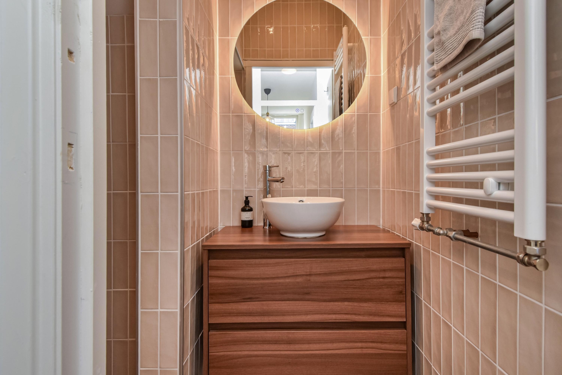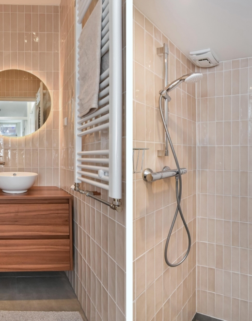 In dit halletje bevindt zich ook een separaat toilet en een moderne badkamer, voorzien van een designradiator, een dubbele wastafel en een ruime inloopdouche met afzuiging.