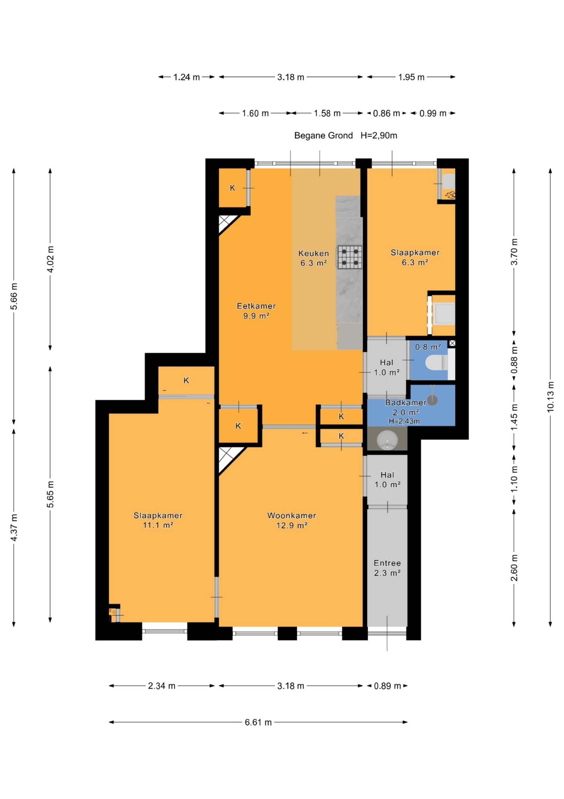 – woonoppervlakte: 61 m² volgens de branchebrede meetinstructie (afgeleid van de NEN 2580-methode);