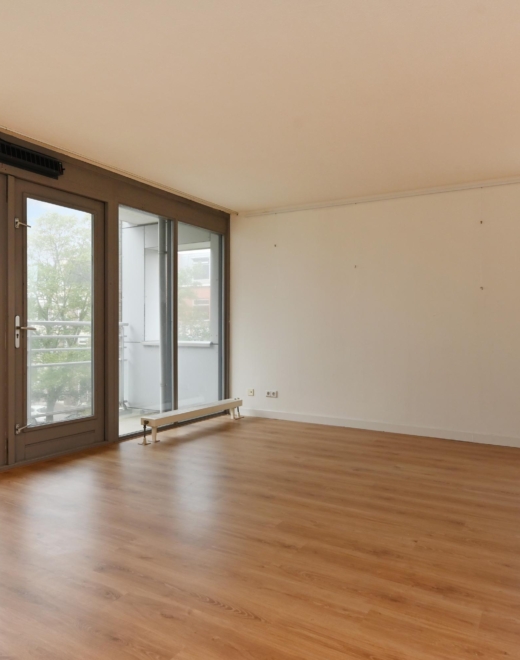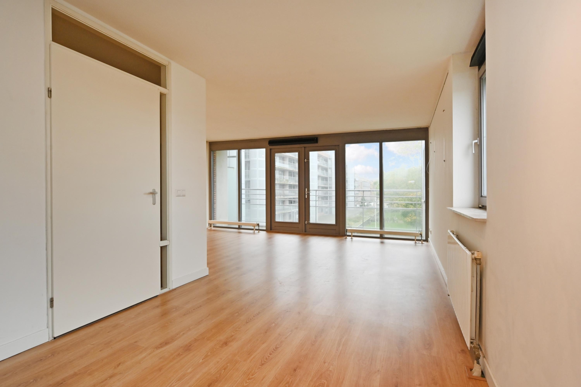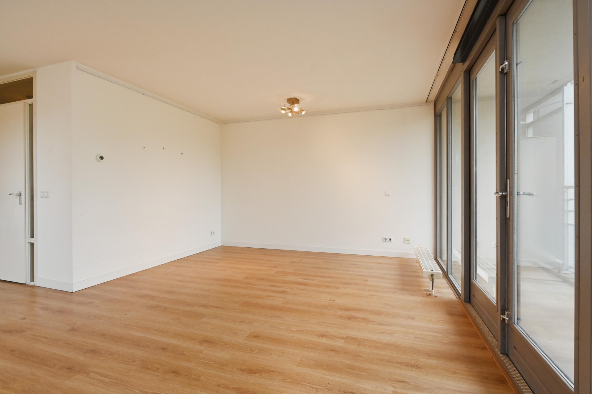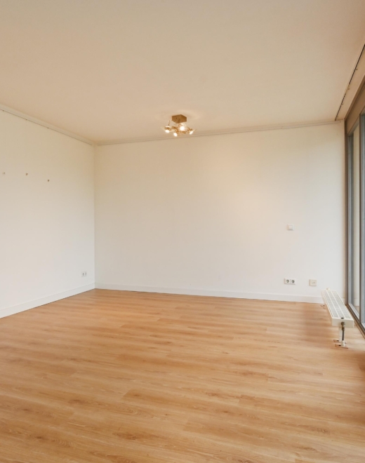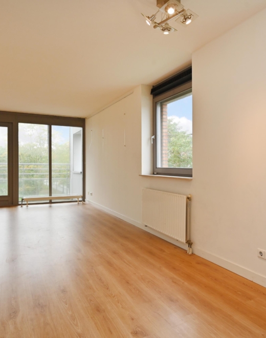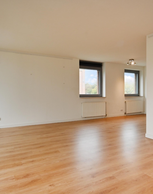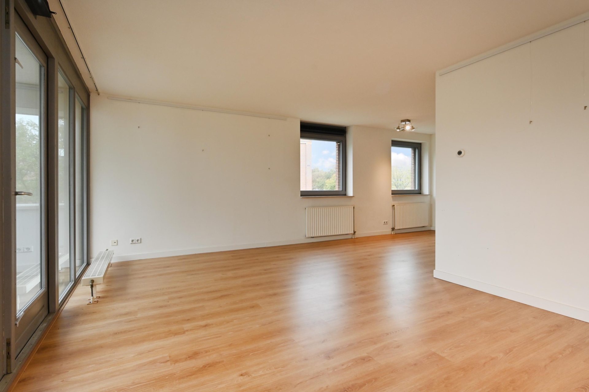 De riante woonkamer heeft een schitterend vrij uitzicht en toegang tot het balkon dat gelegen is op het zuidwesten!