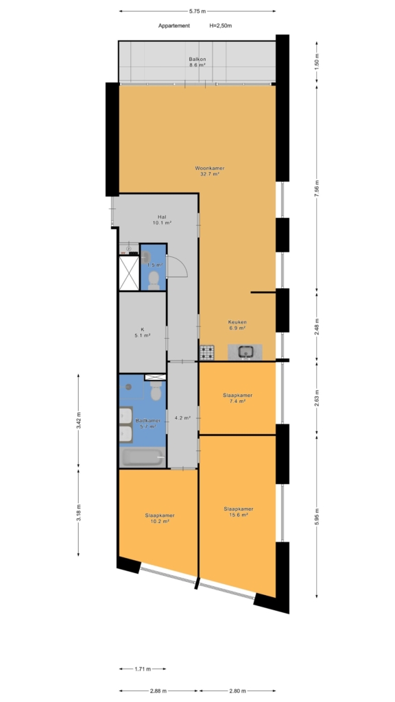 - Badkamervoorzieningen Ligbad, toilet, dubbele wastafel