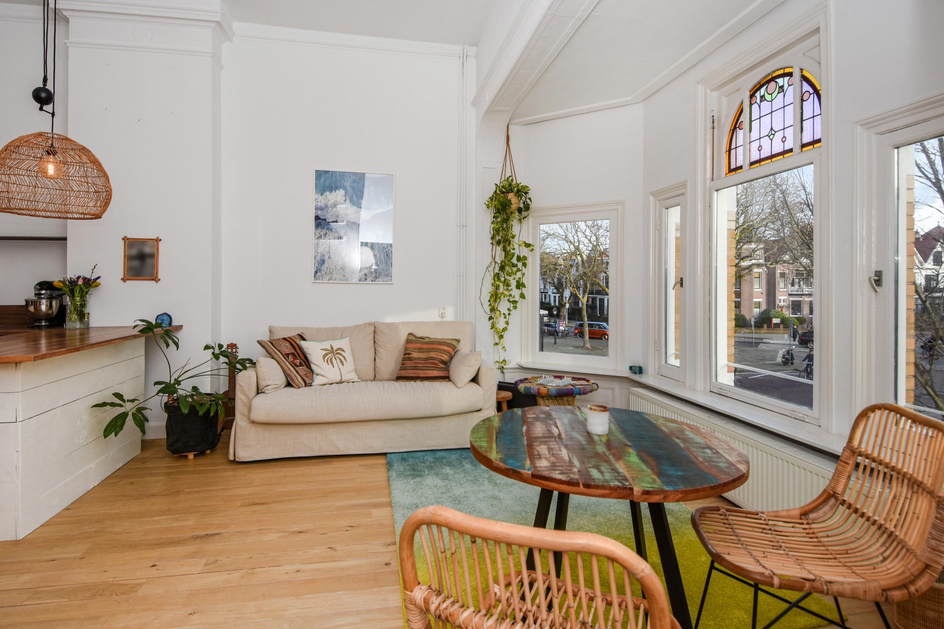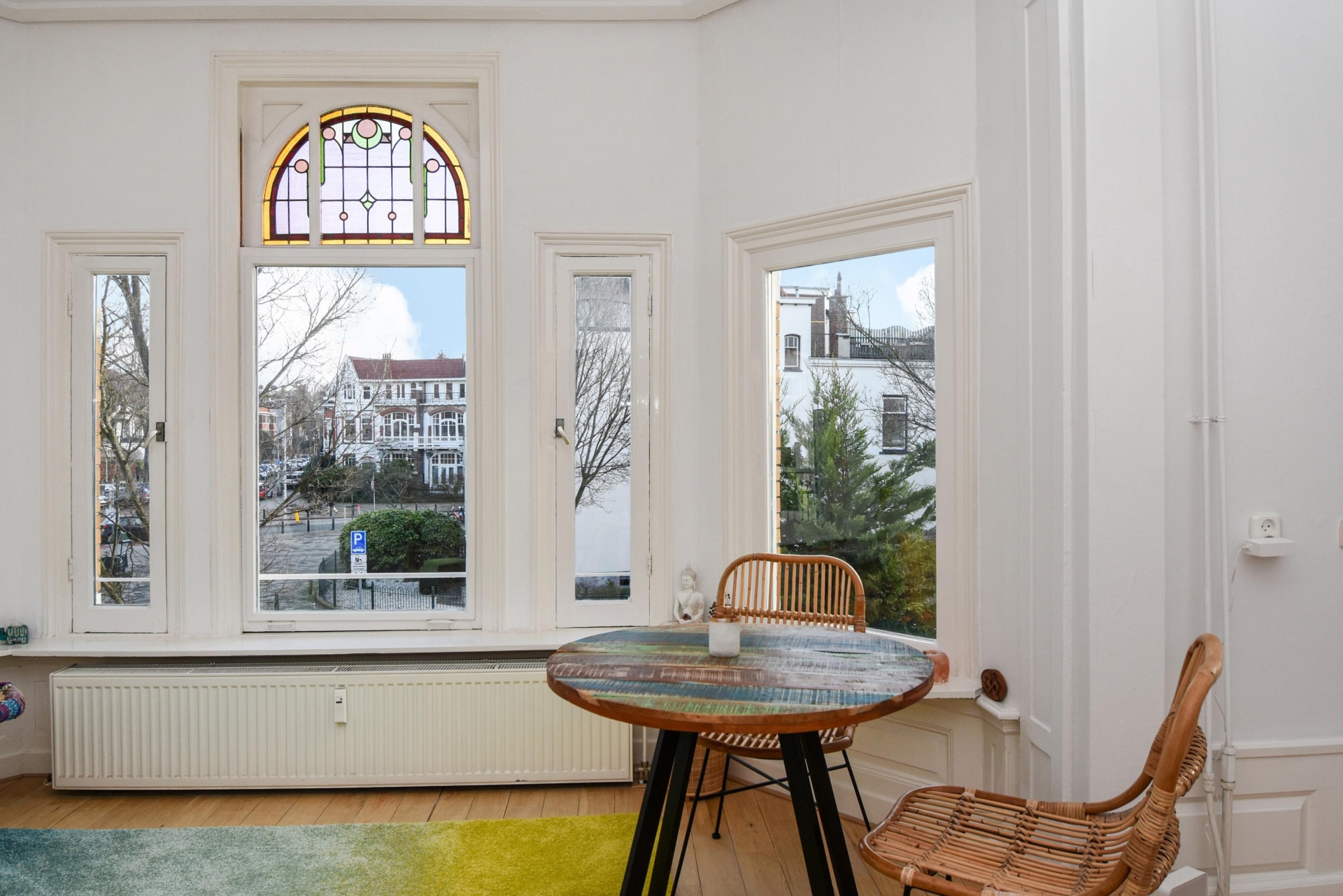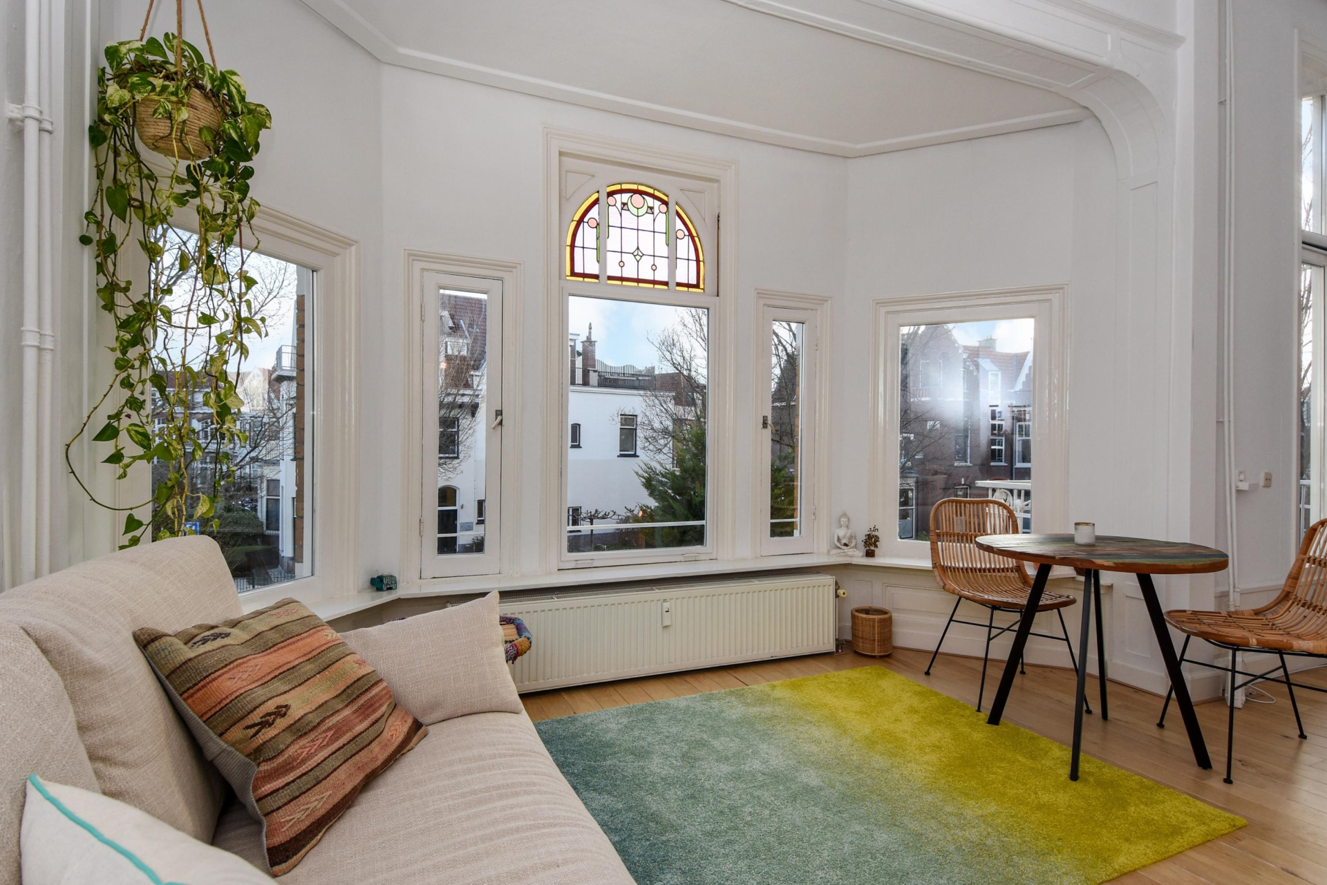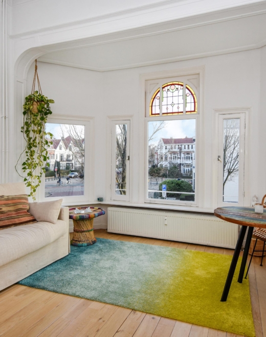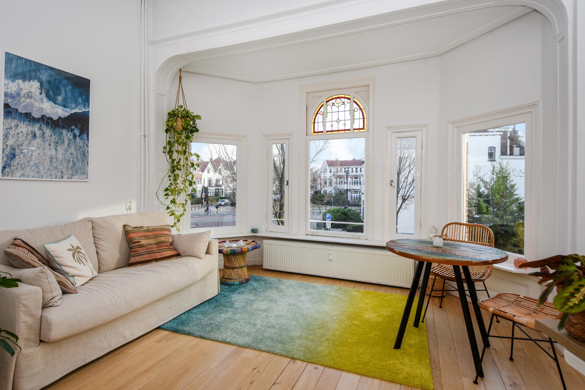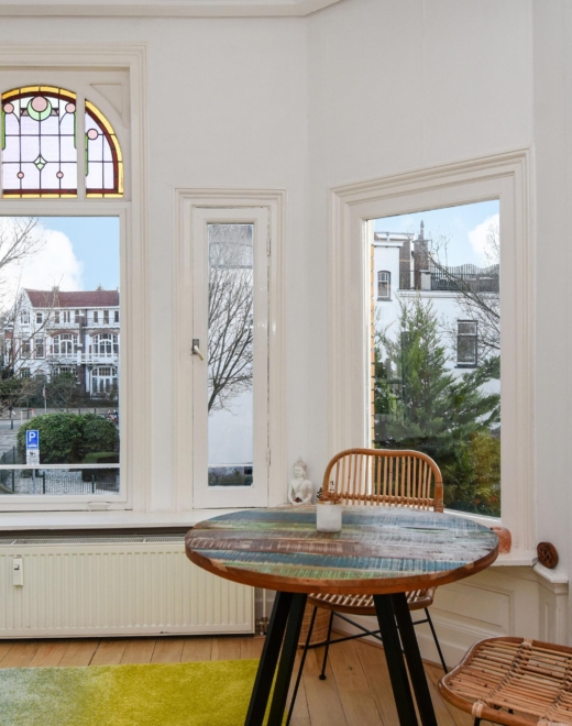 Upon entering, you step into a bright, open living space featuring a continuous wooden floor, high ceilings, and beautiful characteristic details. The bay window with stained glass provides panoramic views over the street and shopping avenue, creates a playful natural light effect, and adds timeless charm.