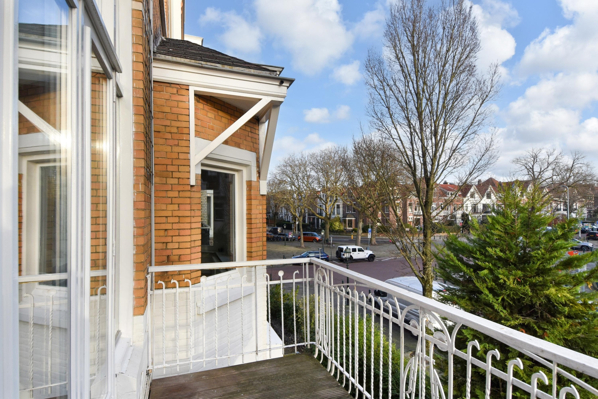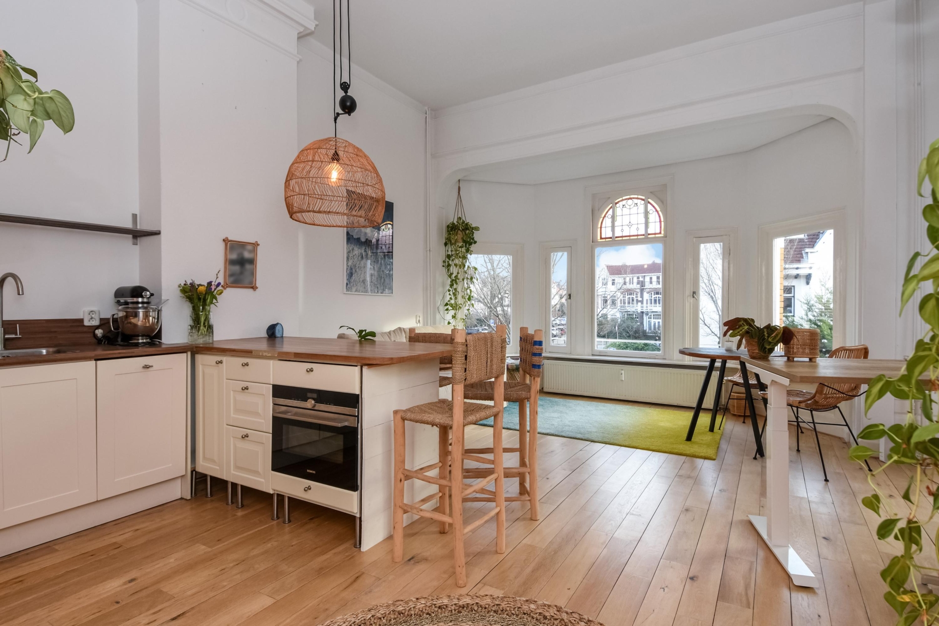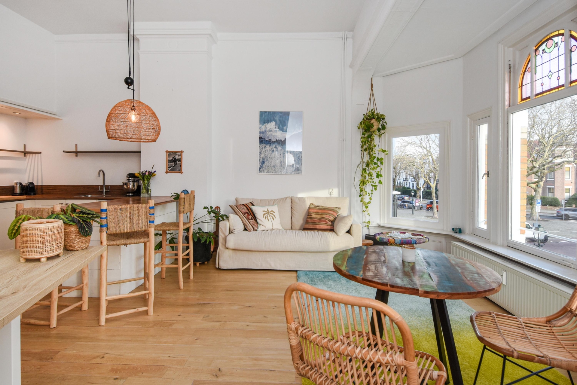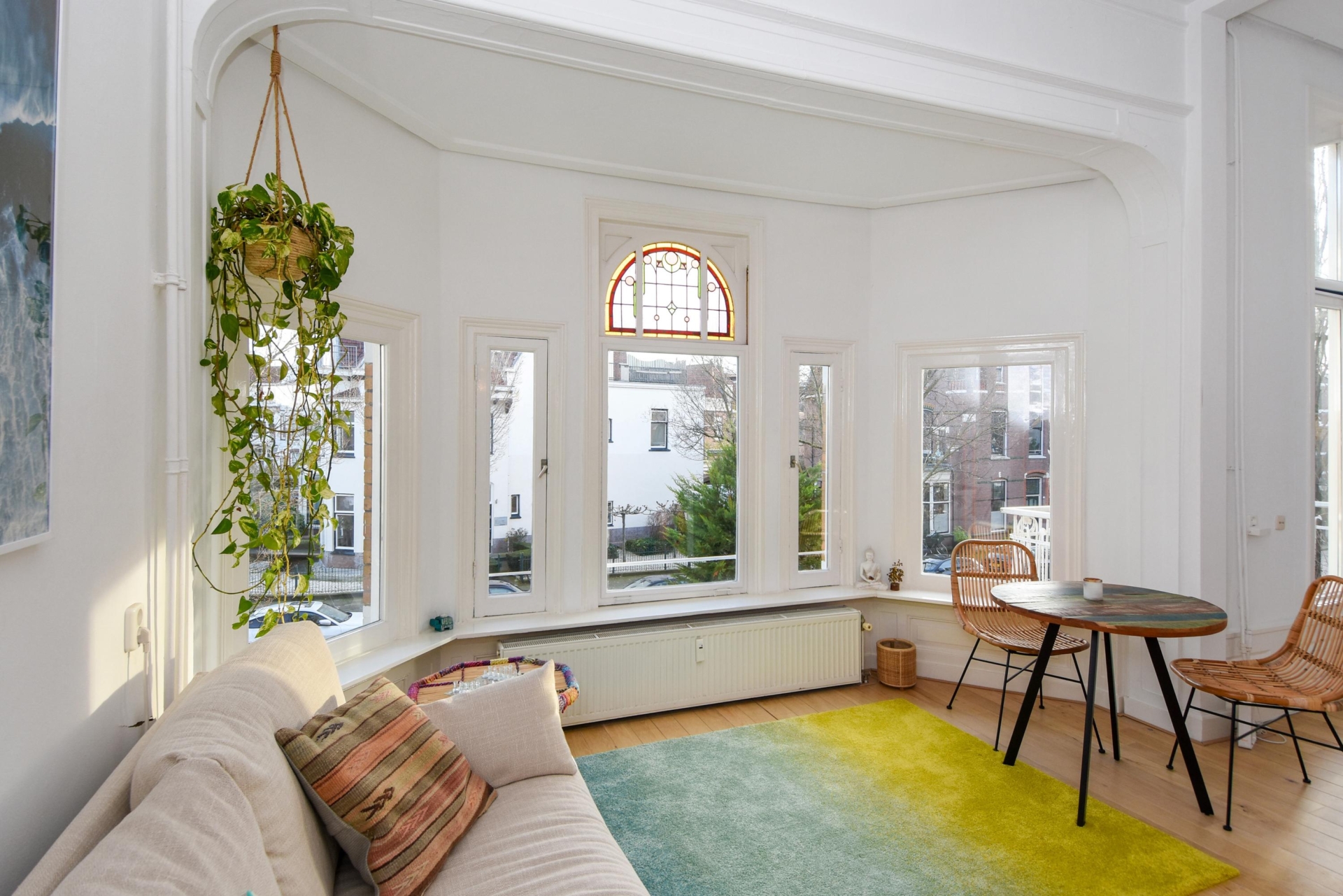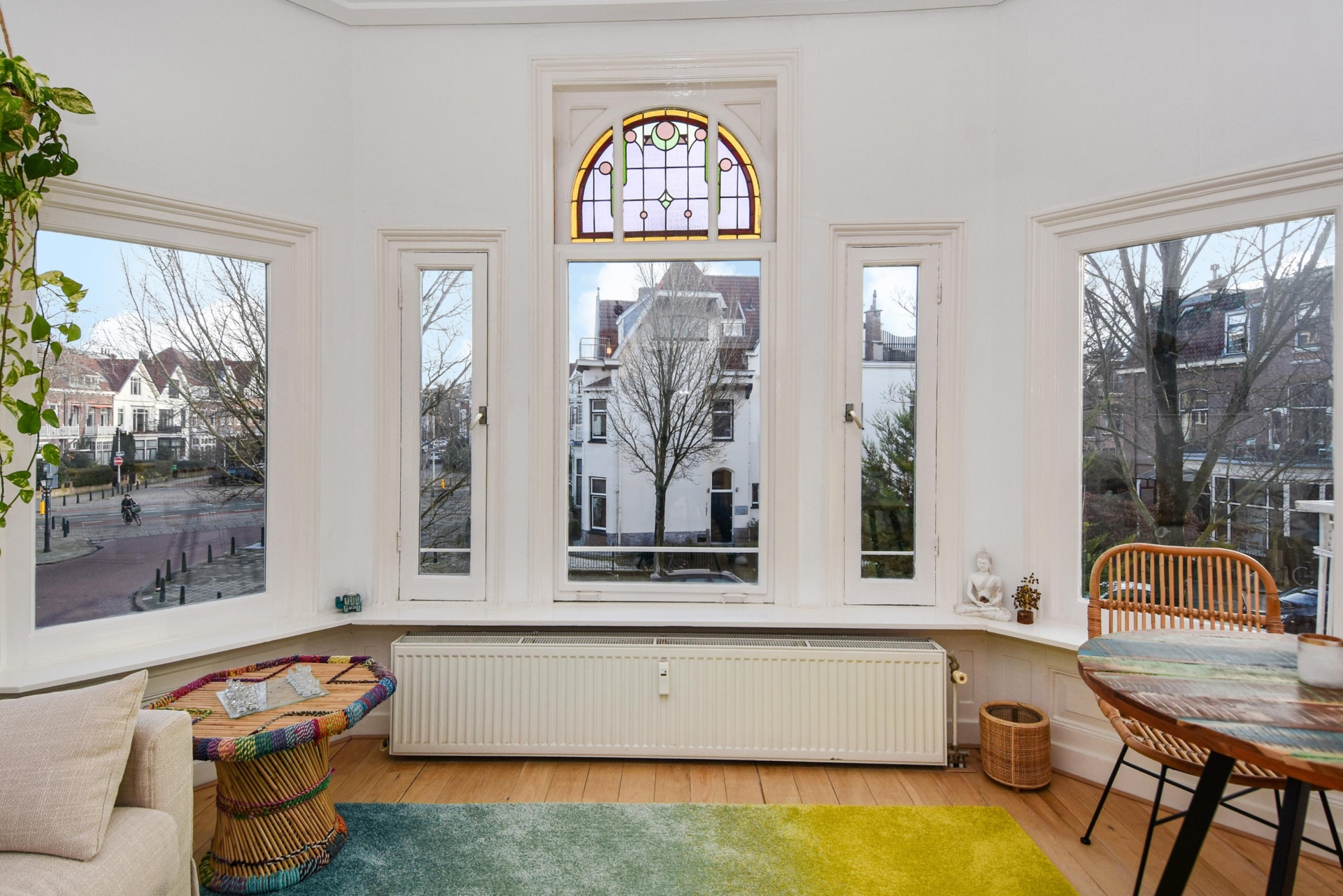 Upon entering, you step into a bright, open living space featuring a continuous wooden floor, high ceilings, and beautiful characteristic details. The bay window with stained glass provides panoramic views over the street and shopping avenue, creates a playful natural light effect, and adds timeless charm.