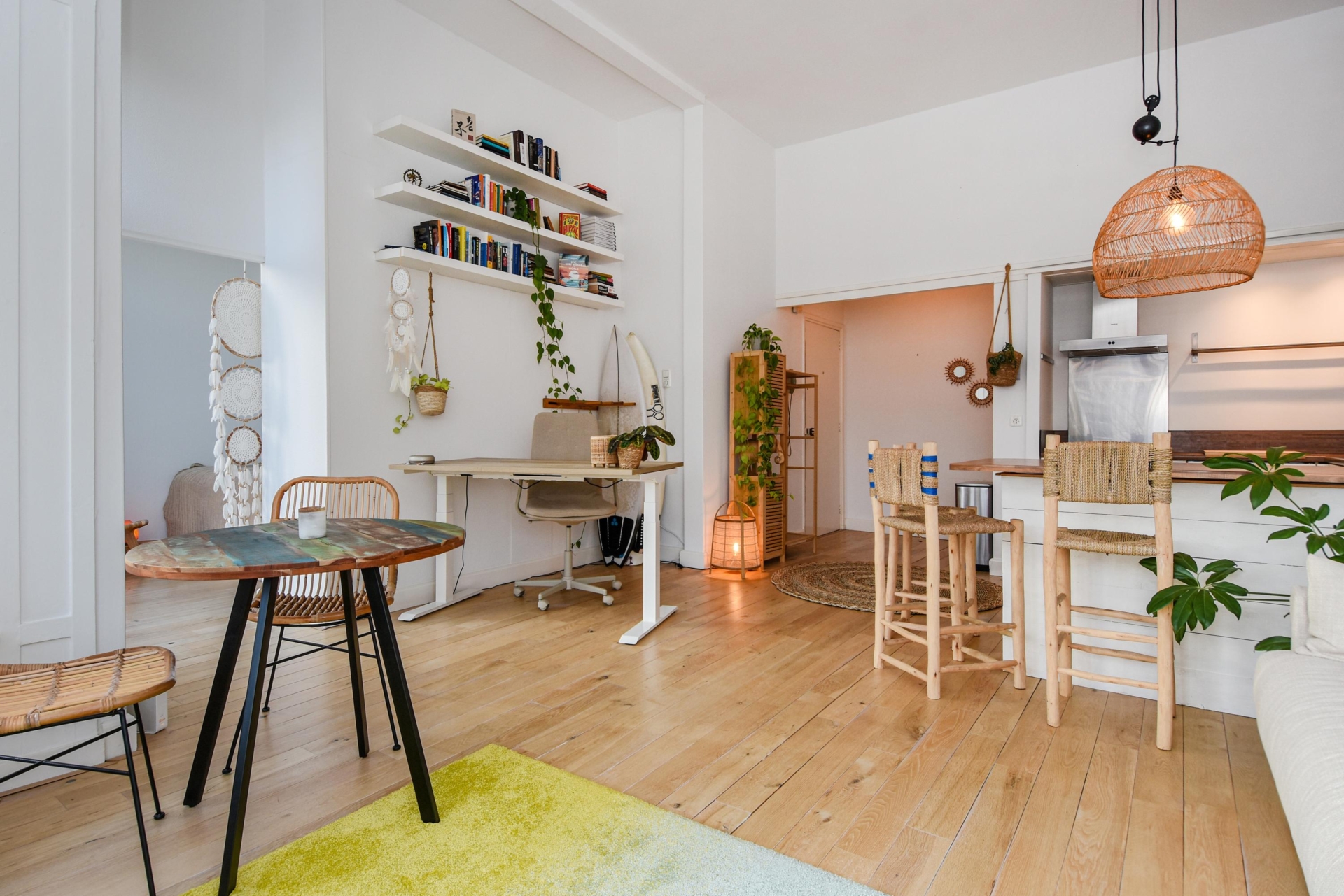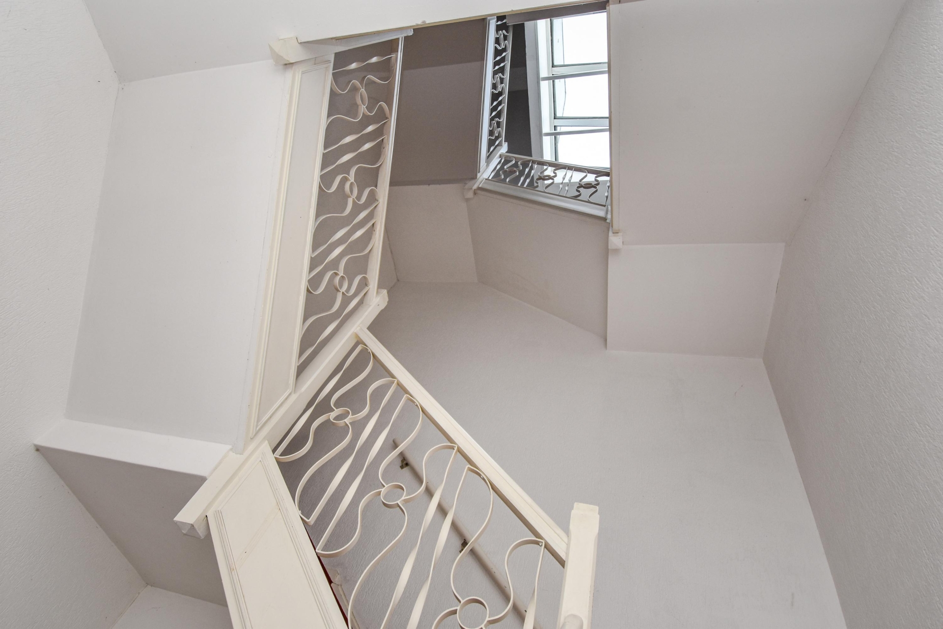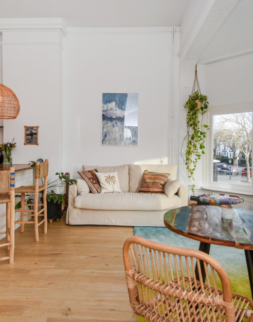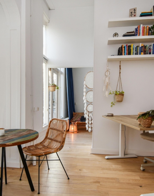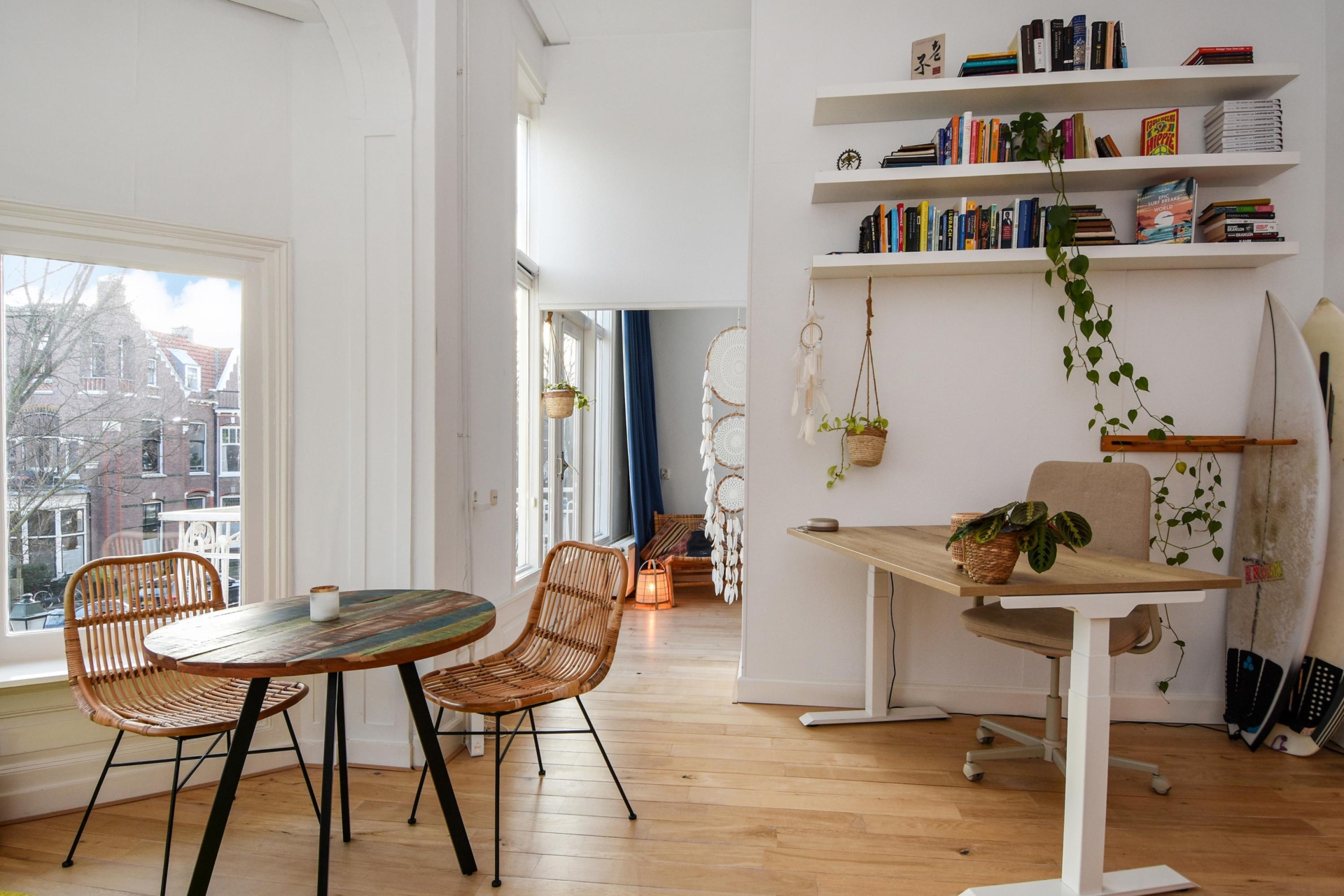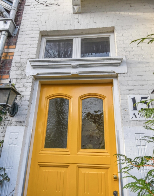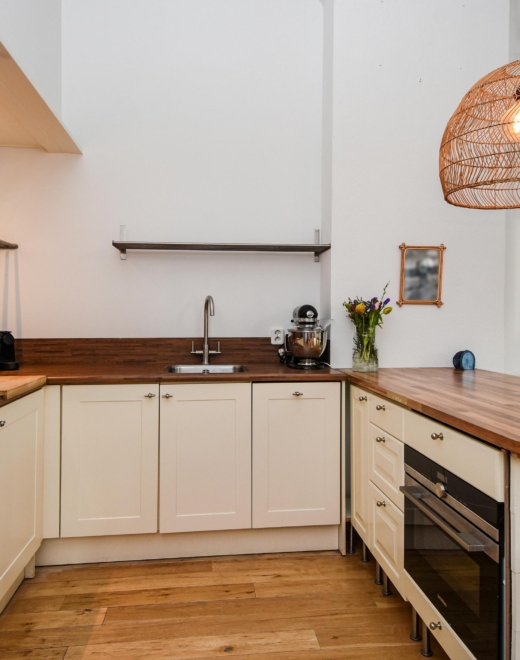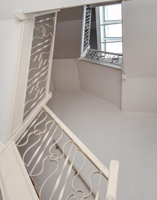 Upon entering, you step into a bright, open living space featuring a continuous wooden floor, high ceilings, and beautiful characteristic details. The bay window with stained glass provides panoramic views over the street and shopping avenue, creates a playful natural light effect, and adds timeless charm.