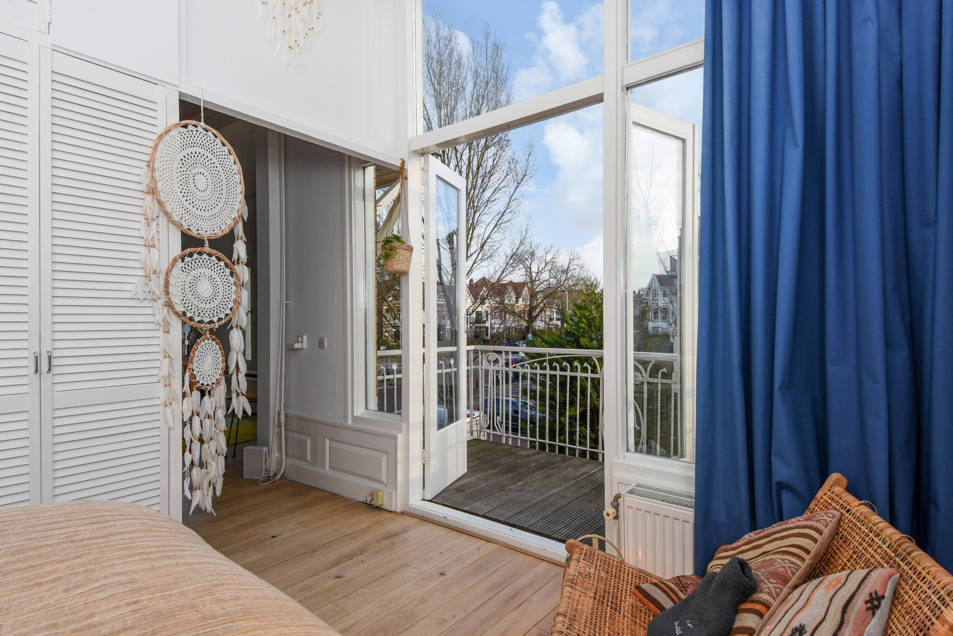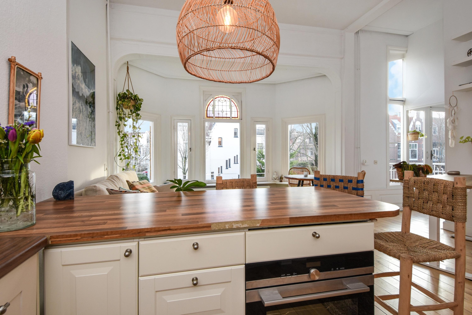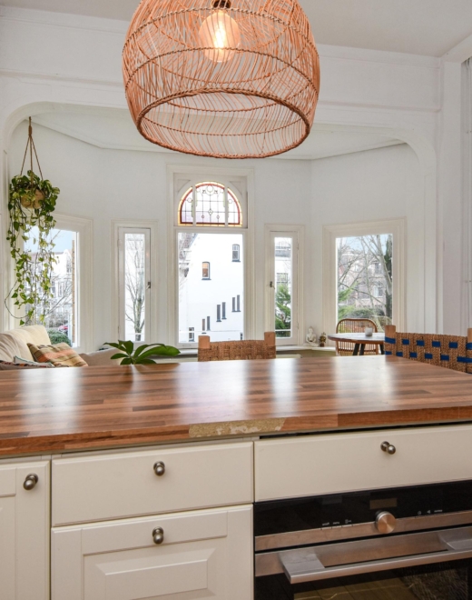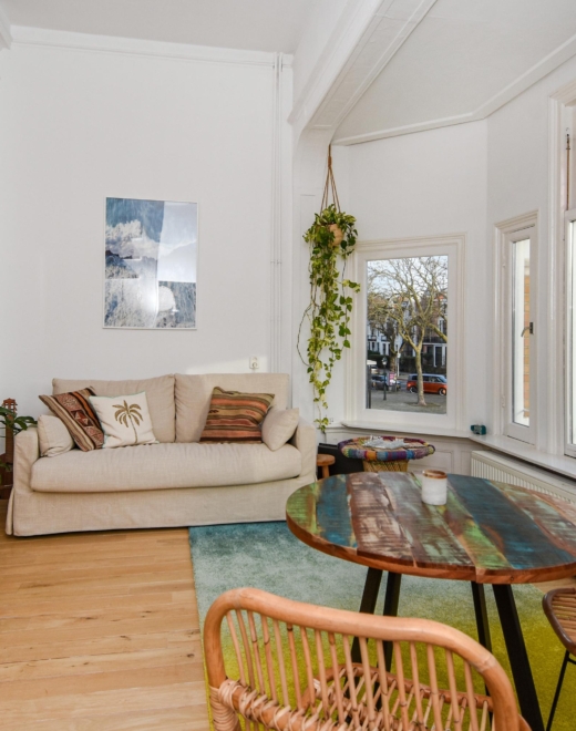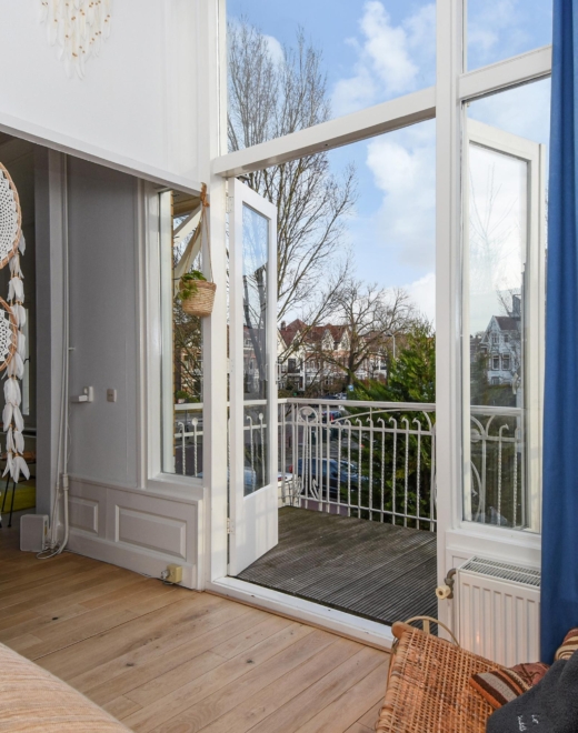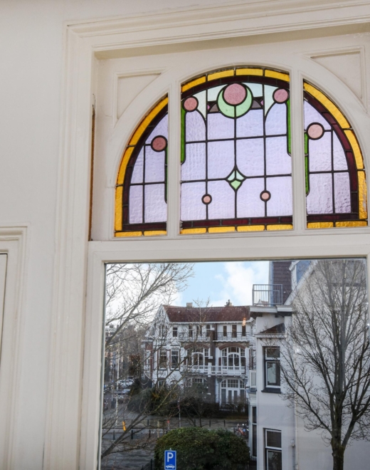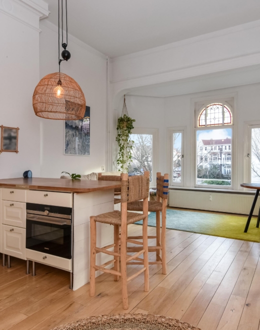 Bij binnenkomst stap je in een lichte, open ruimte met doorlopende houten vloer, hoge plafonds en prachtige, karakteristieke details. De erker met glas-in-lood raam biedt panoramisch uitzicht over de Frankenslag en de Frederik Hendriklaan, verzorgt een speelse lichtval en geeft het geheel een tijdloze charme.