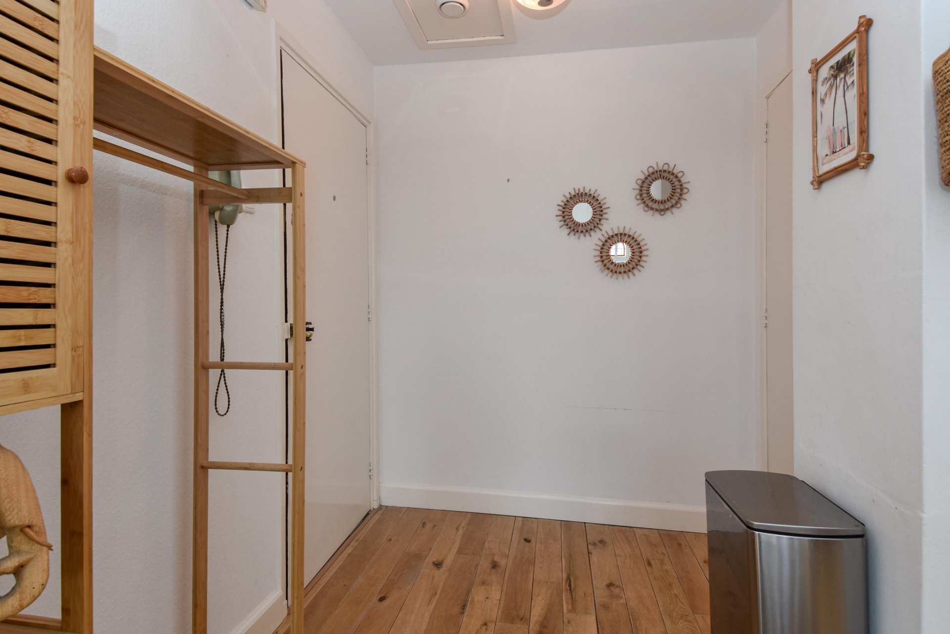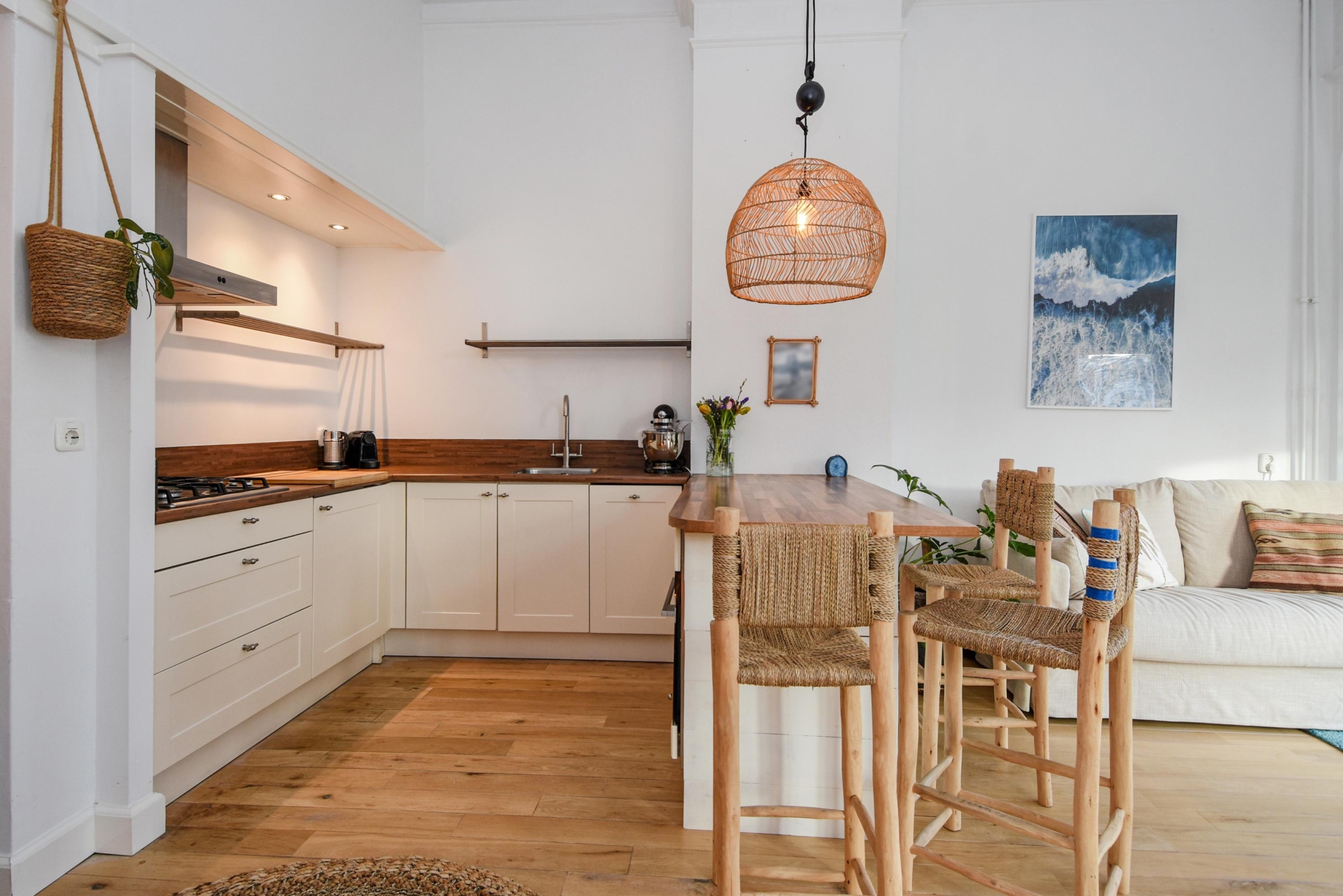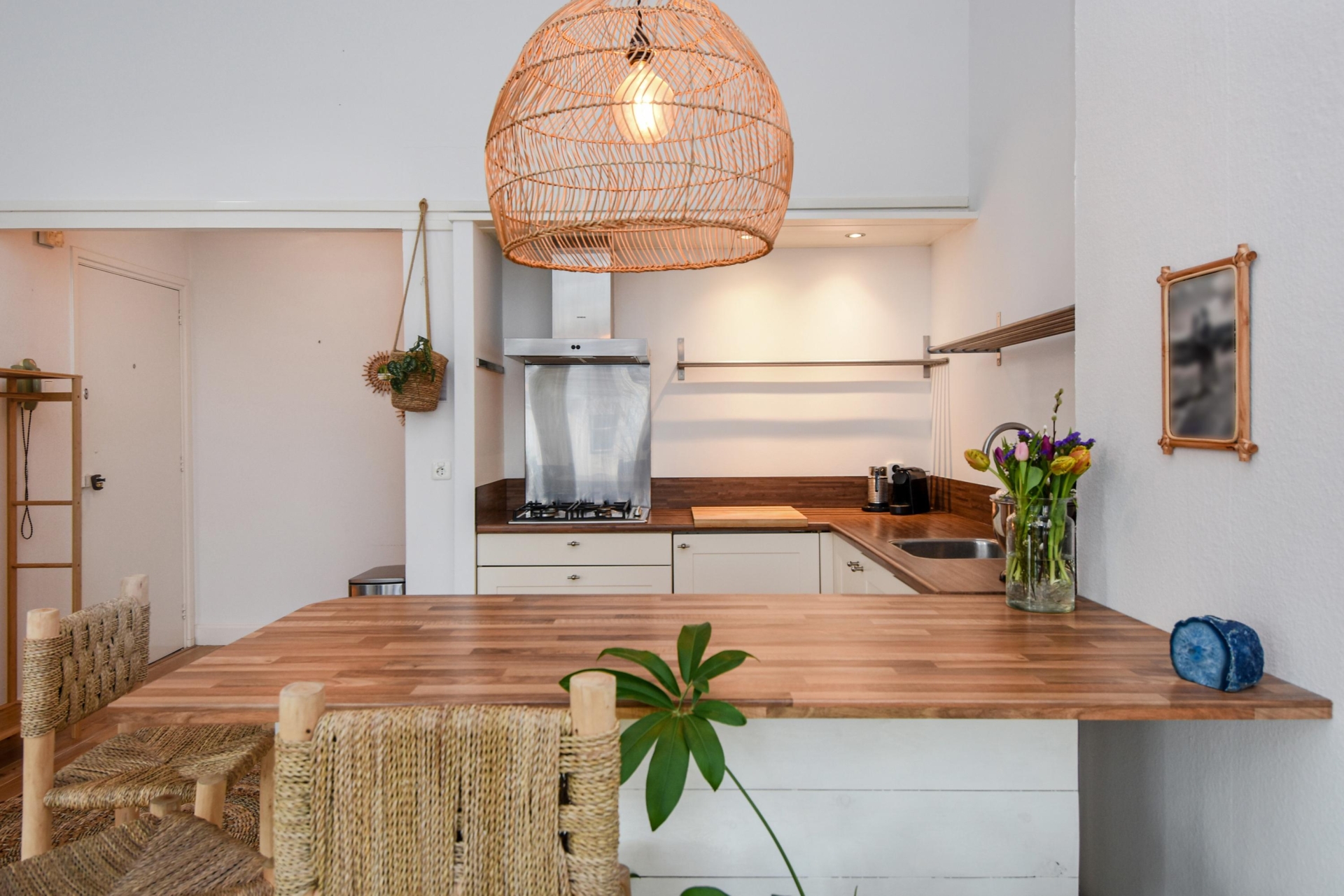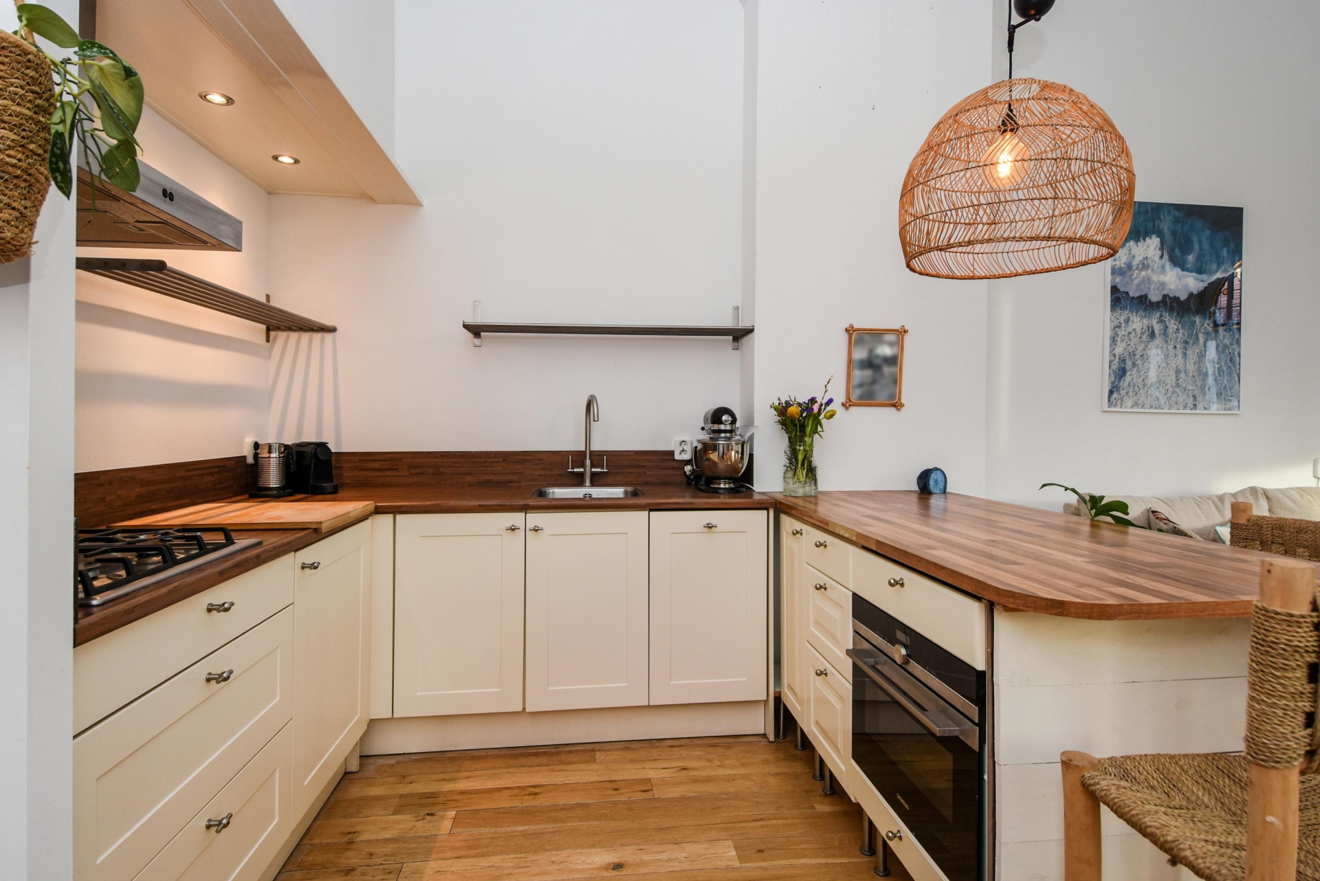 Bij binnenkomst stap je in een lichte, open ruimte met doorlopende houten vloer, hoge plafonds en prachtige, karakteristieke details. De erker met glas-in-lood raam biedt panoramisch uitzicht over de Frankenslag en de Frederik Hendriklaan, verzorgt een speelse lichtval en geeft het geheel een tijdloze charme.