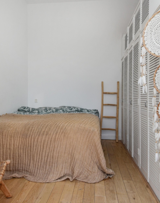 The large, bright bedroom features a practical built-in wardrobe wall. From the bedroom, you have access to the delightful south-facing balcony — a perfect spot to enjoy the sun.