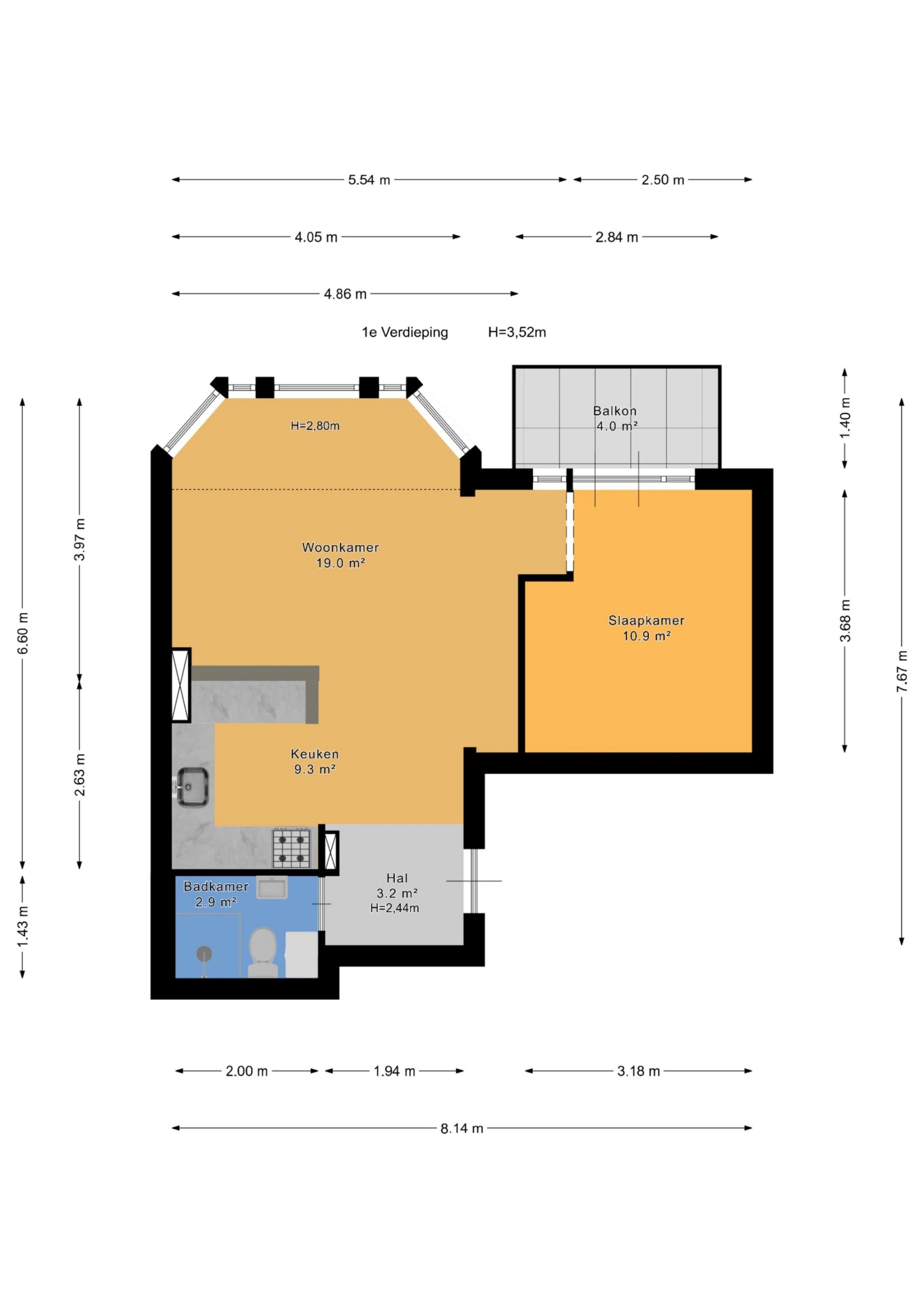• Woonoppervlakte ca. 47 m², gemeten volgens de branchebrede meetinstructie (afgeleid van de NEN 2580-methode);