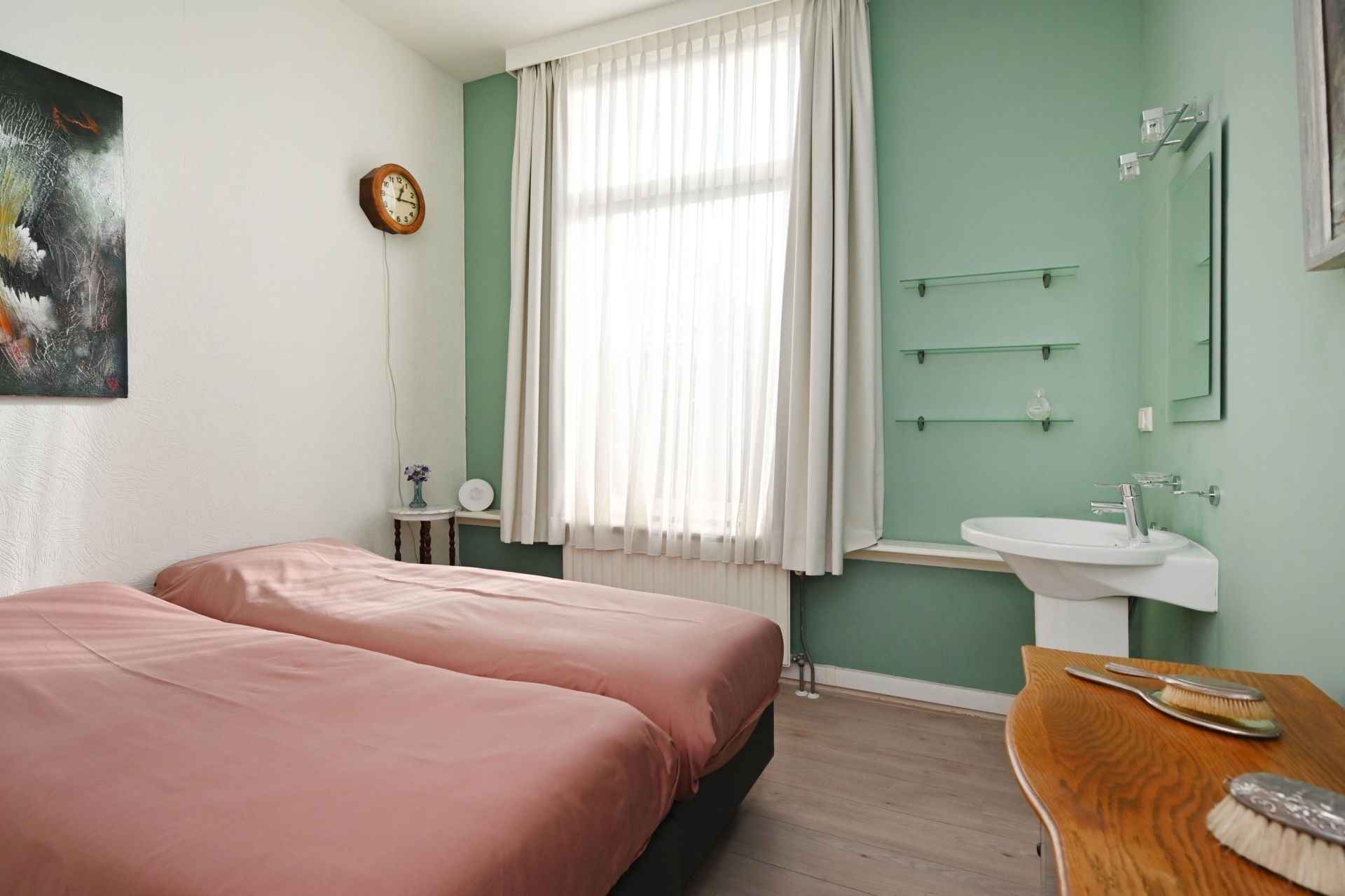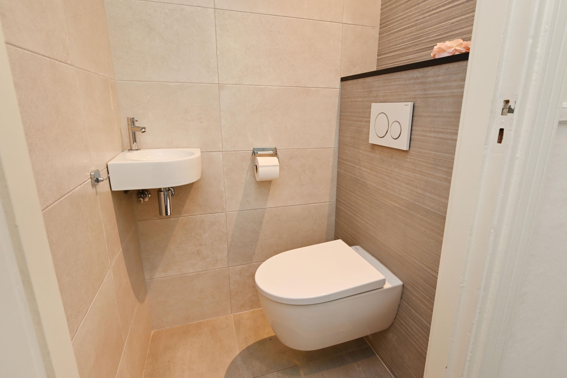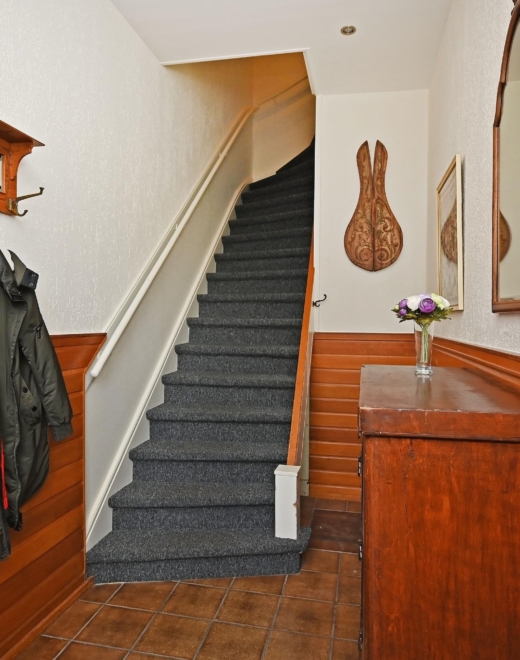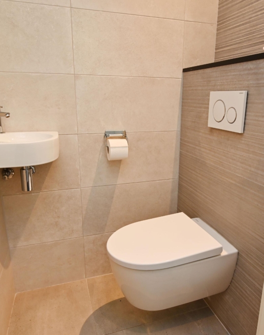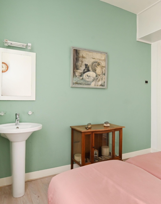 Through the private entrance, you arrive in the generous hallway. A staircase leads to the first floor, where the bright landing provides access to all rooms. At the front, there is a pleasant bedroom with a washbasin and vanity unit.