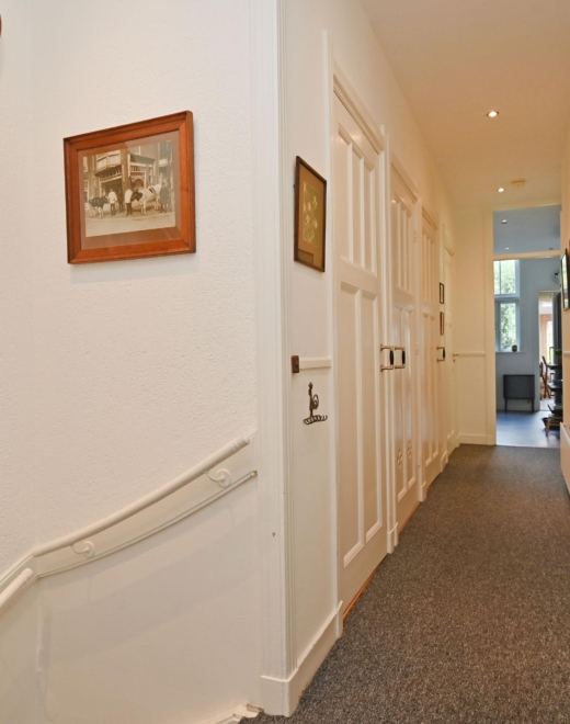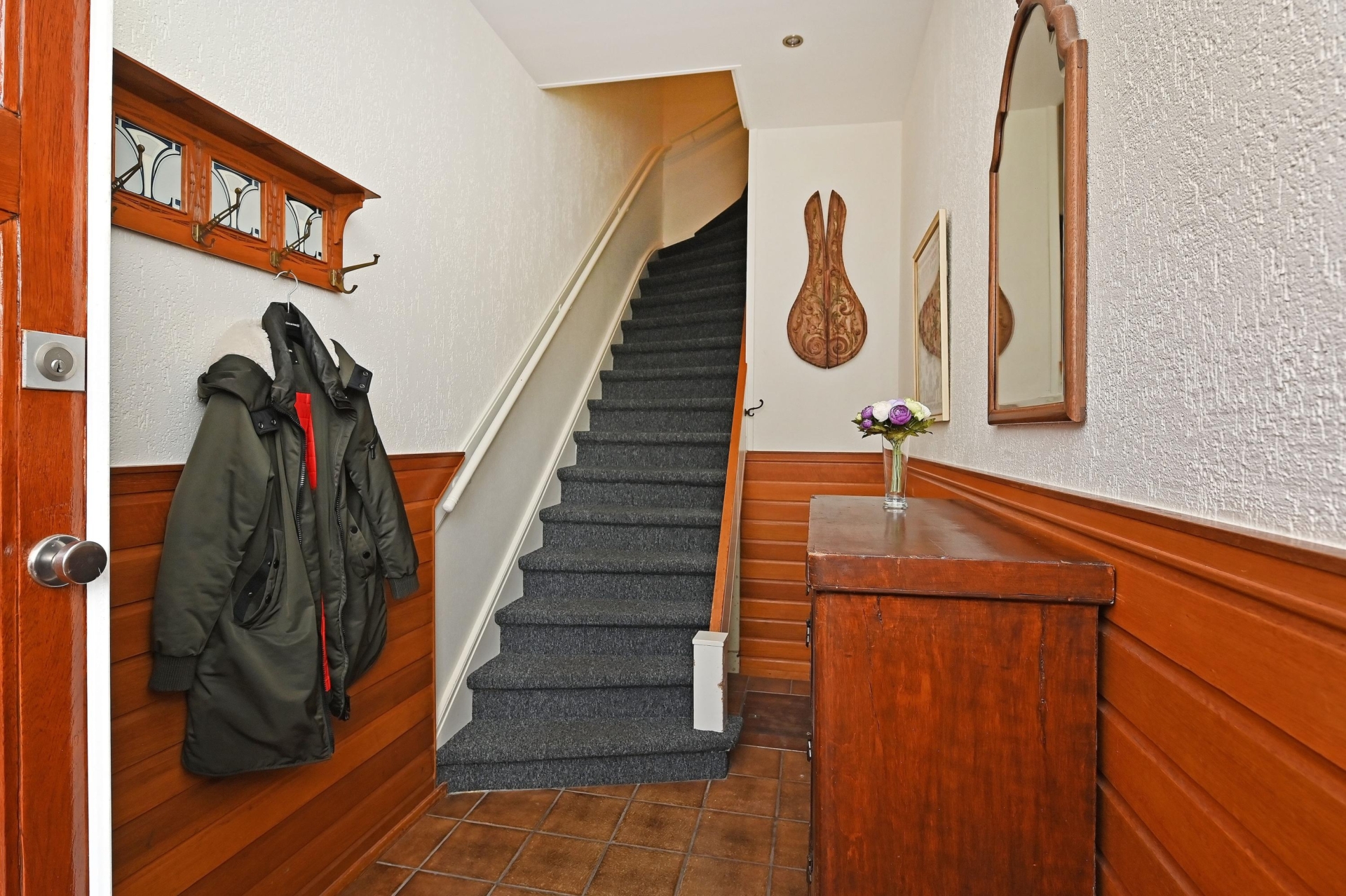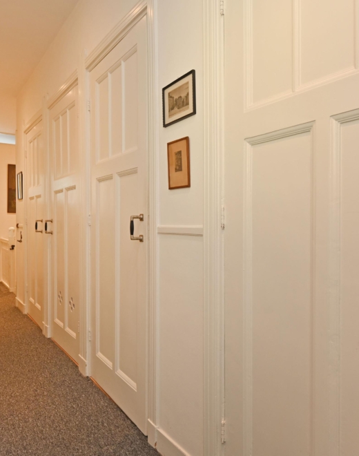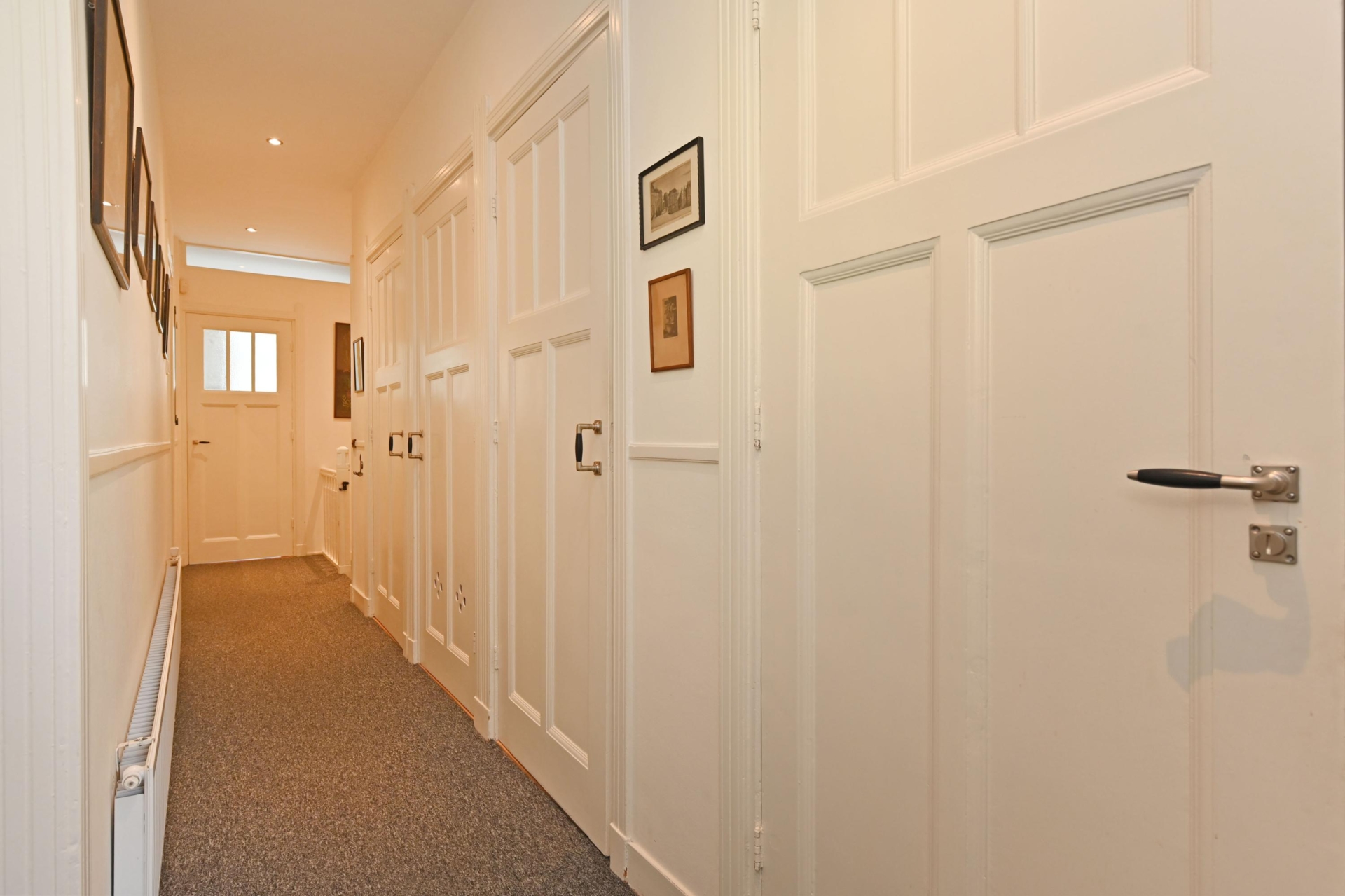 Through the private entrance, you arrive in the generous hallway. A staircase leads to the first floor, where the bright landing provides access to all rooms. At the front, there is a pleasant bedroom with a washbasin and vanity unit.