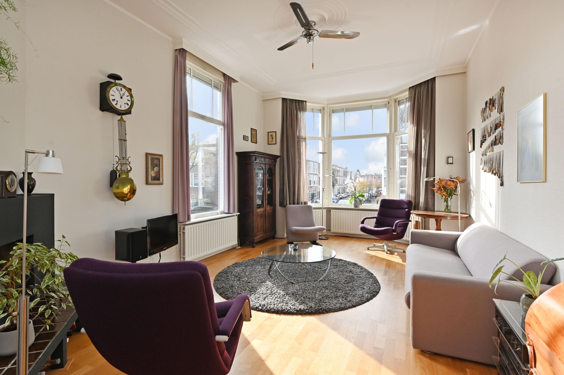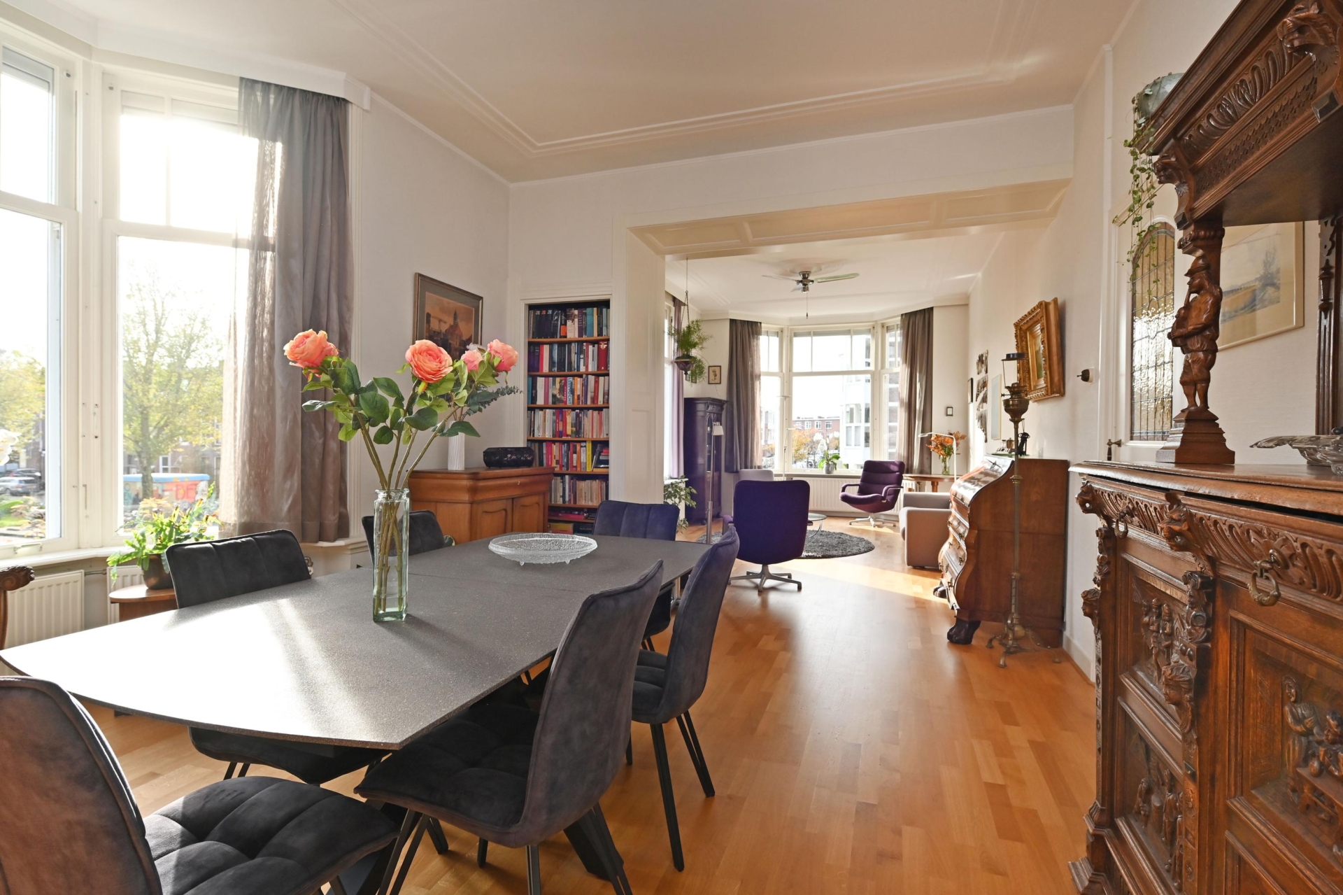 The spacious living/dining room benefits from the corner location, making it exceptionally bright and atmospheric, with beautiful bay windows and original ceilings.