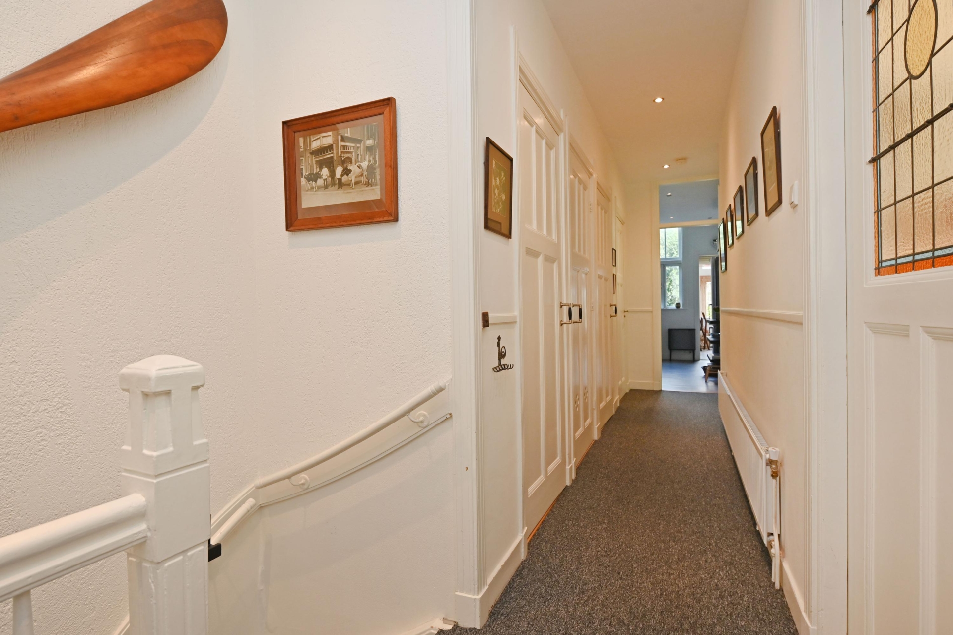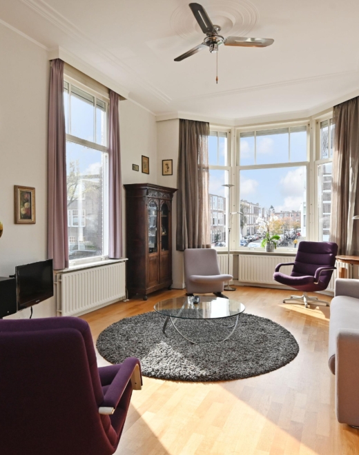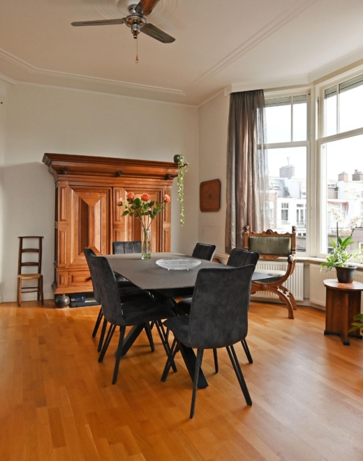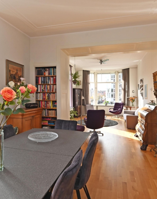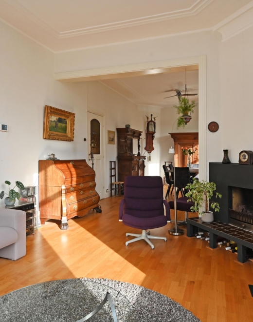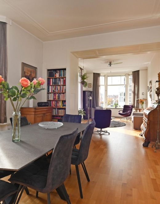 Via de eigen voordeur kom je in de ruime hal. De trap leidt naar de 1e etage waar de lichte overloop toegang geeft tot alle vertrekken. Aan de voorzijde ligt een prettige slaapkamer met wastafel met -meubel. De riante woon-/eetkamer is dankzij de hoekligging uitzonderlijk licht en sfeervol, met fraaie erkers en mooie originele plafonds.
