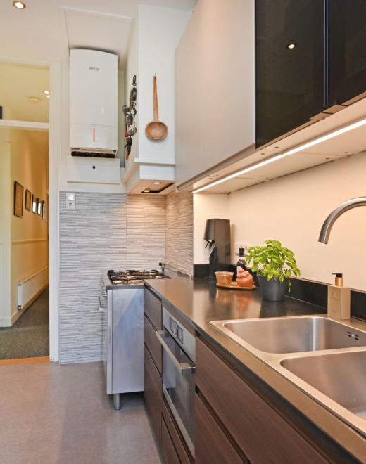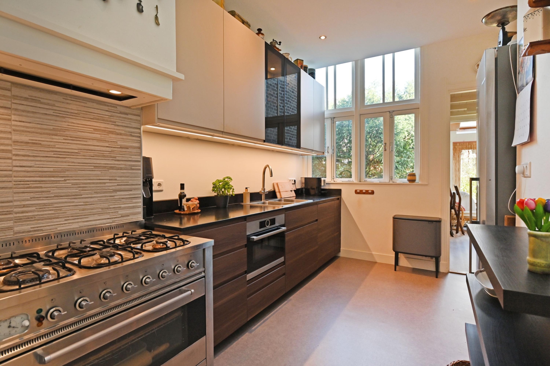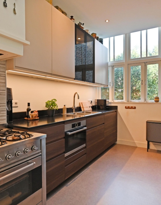 De luxe keuken aan de achterzijde is compleet uitgevoerd met o.a. een Boretti 6-pits gaskookplaat met elektrische oven, een 2e oven-/magnetroncombinatie, vaatwasser en heetwaterkraan. De openslaande ramen bieden een heerlijk groen uitzicht. Aansluitend bevindt zich de derde slaapkamer.