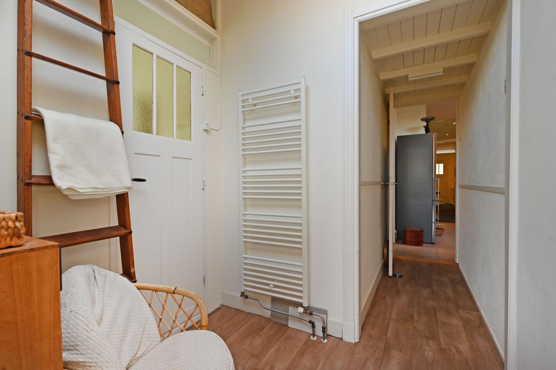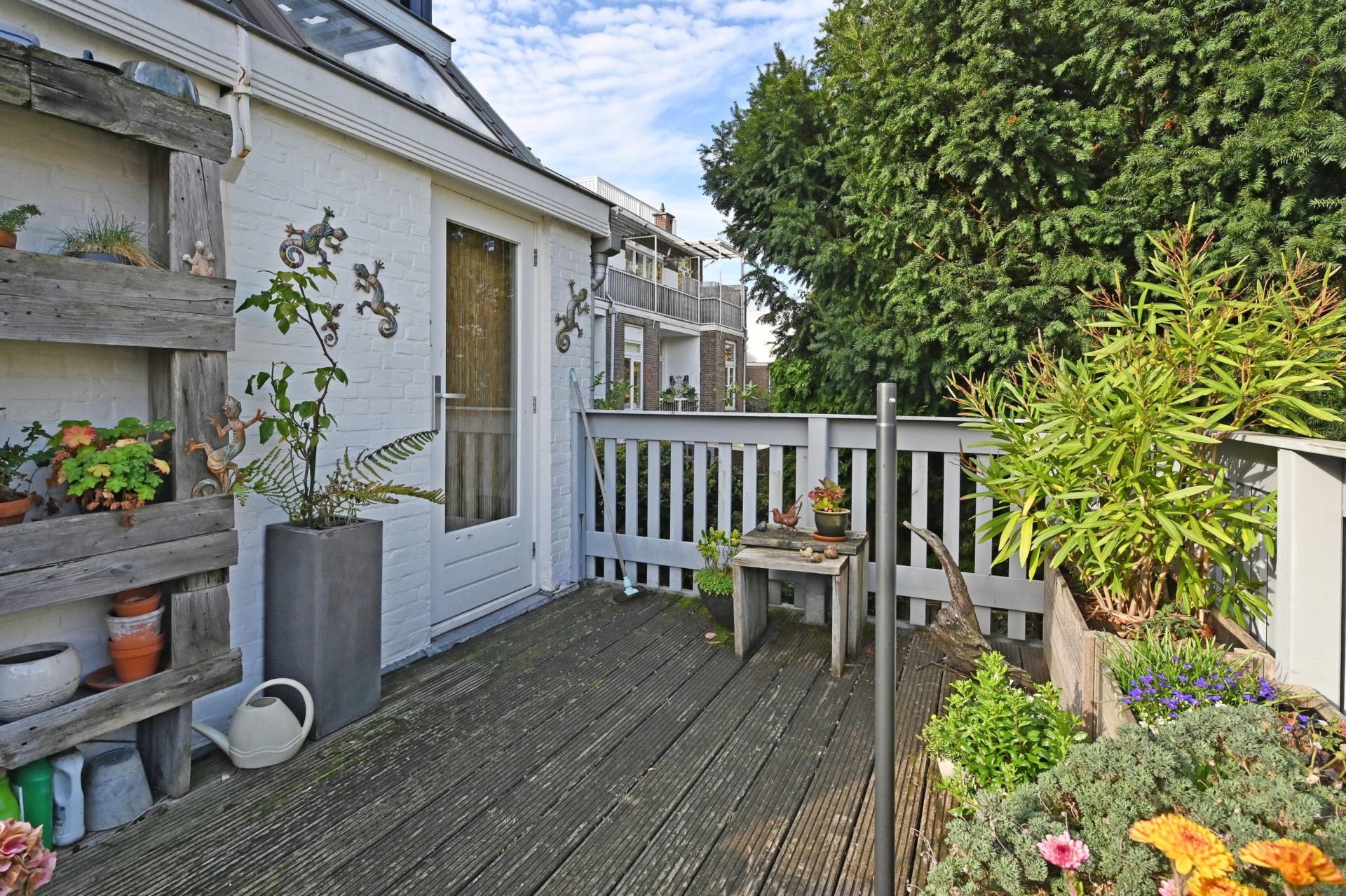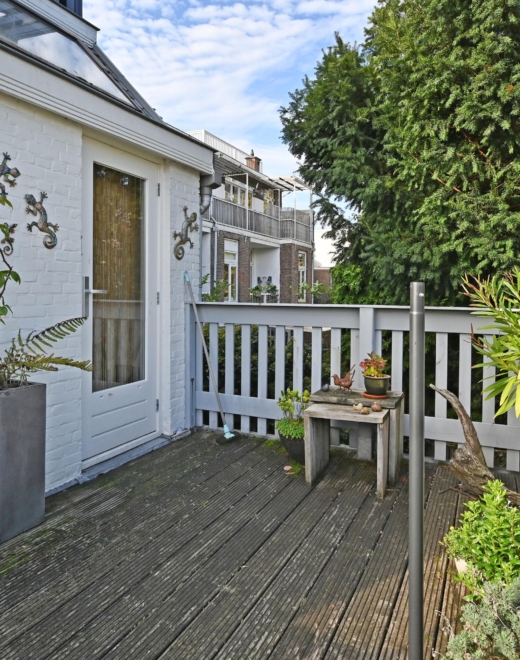 Via een lichte ruime gang – ideaal als werk- of zithoek en met veel extra bergruimte – bereik je het zonnige en verrassend ruime terras op het noordoosten, een heerlijke plek om in alle rust buiten te genieten.