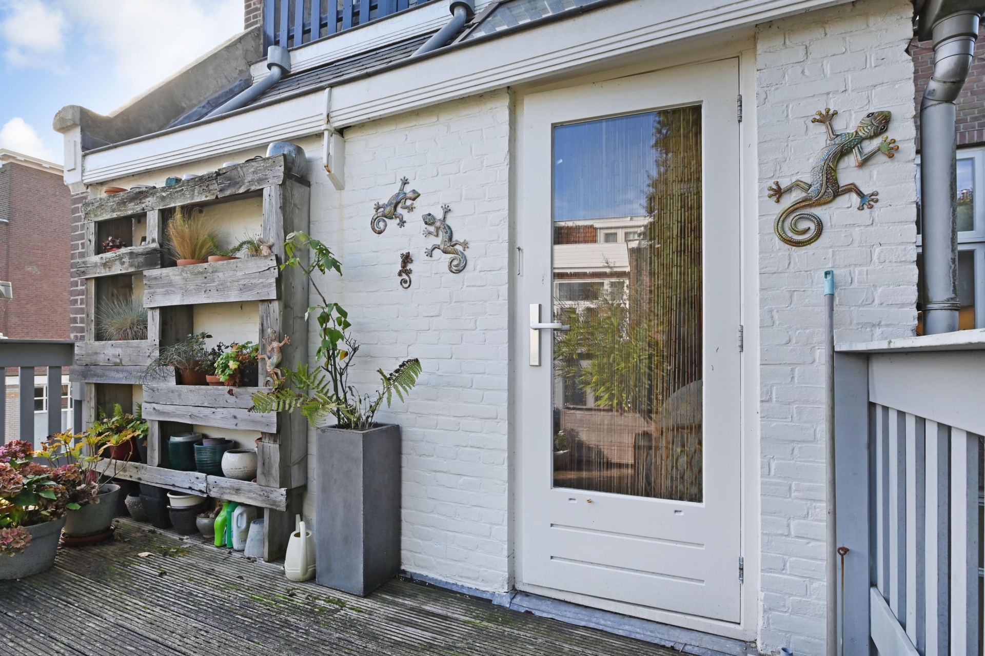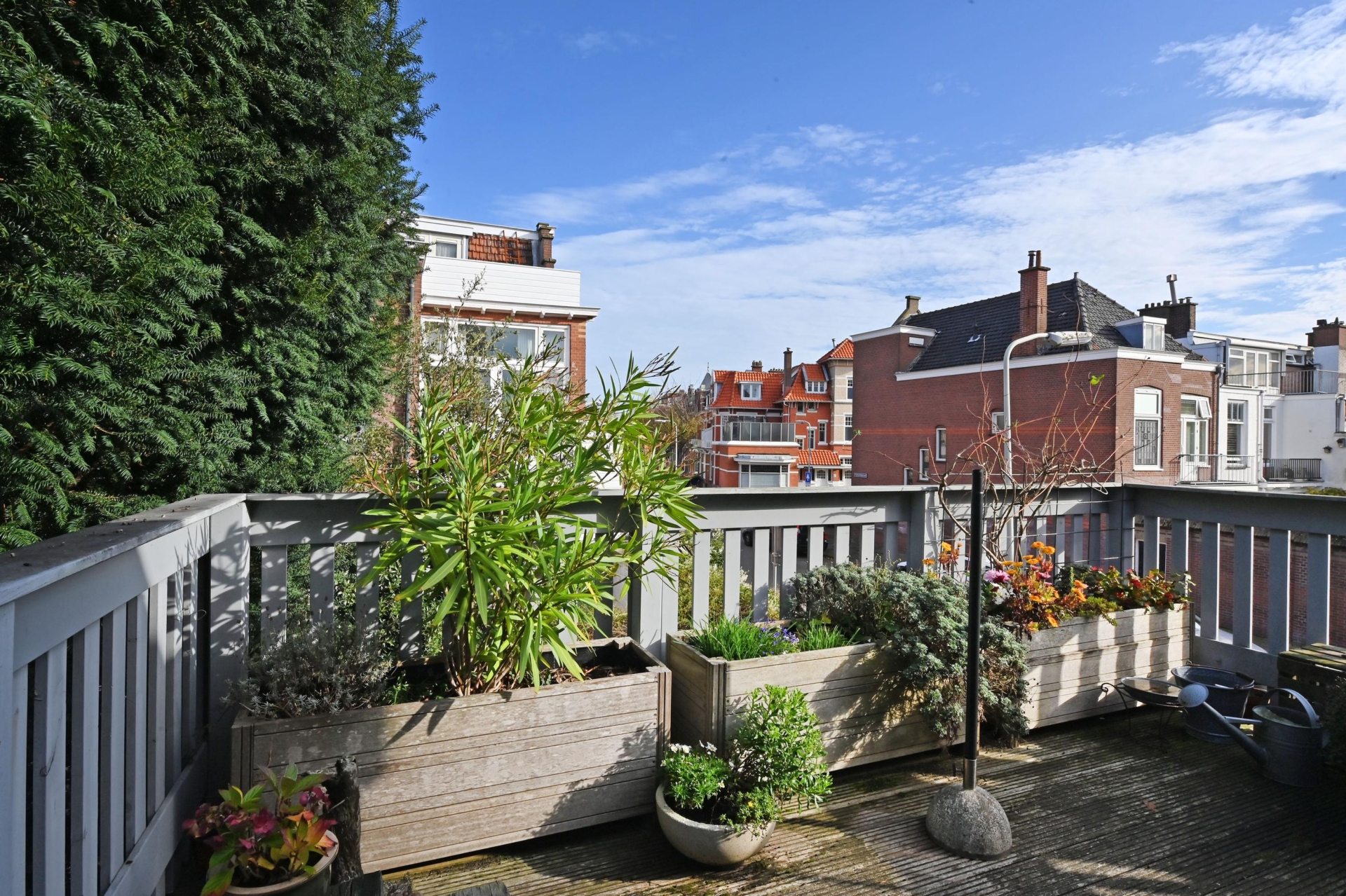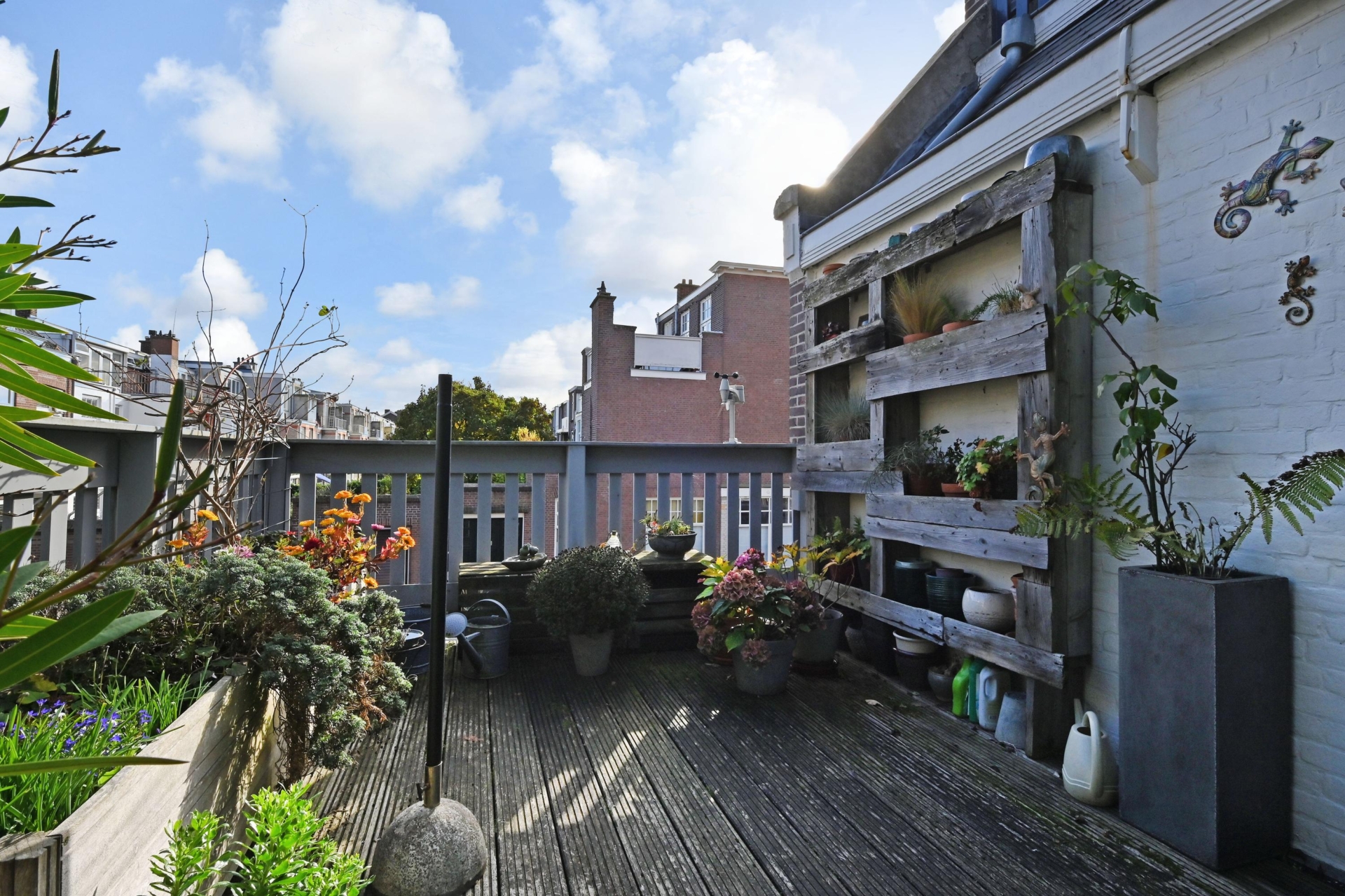 Via een lichte ruime gang – ideaal als werk- of zithoek en met veel extra bergruimte – bereik je het zonnige en verrassend ruime terras op het noordoosten, een heerlijke plek om in alle rust buiten te genieten.