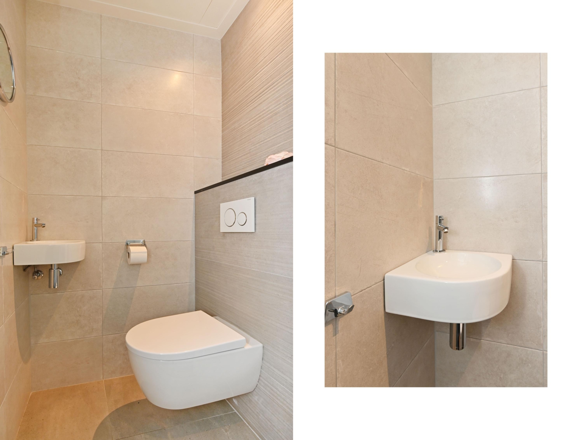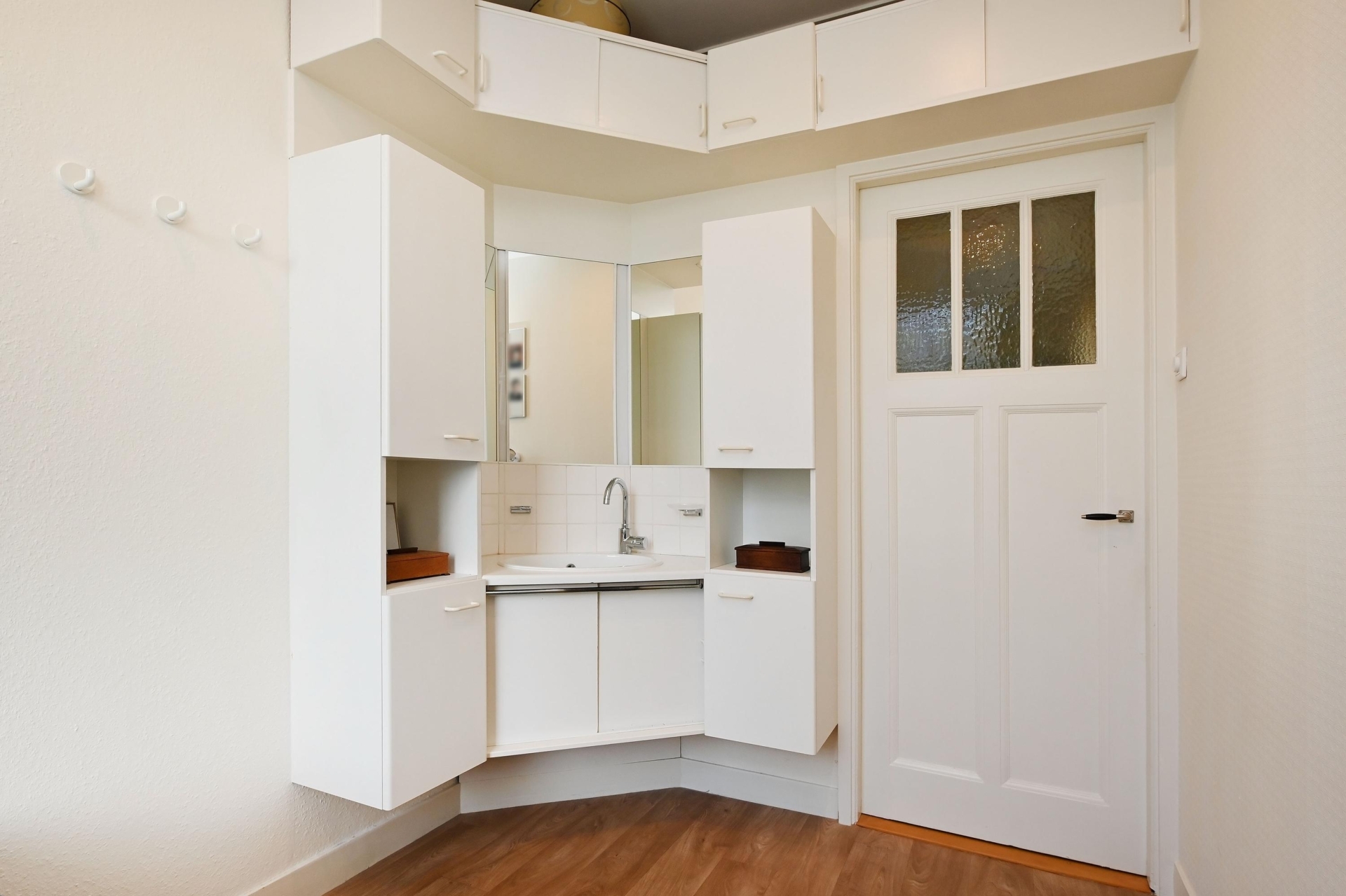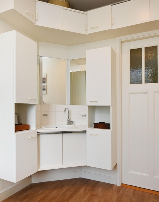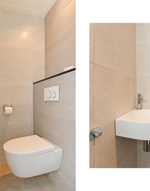 In de gang bevinden zich 3 grote, praktische opbergkasten en een luxe toilet met fontein. Daarnaast is er een royale slaapkamer met inbouw-garderobekast en wastafel.