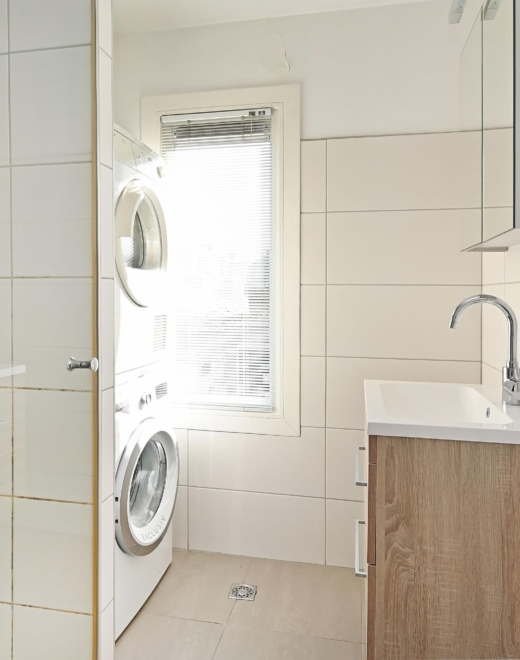The modern bathroom is fitted with a designer radiator, vanity unit, shower cabin, and connections for a washing machine and dryer.
