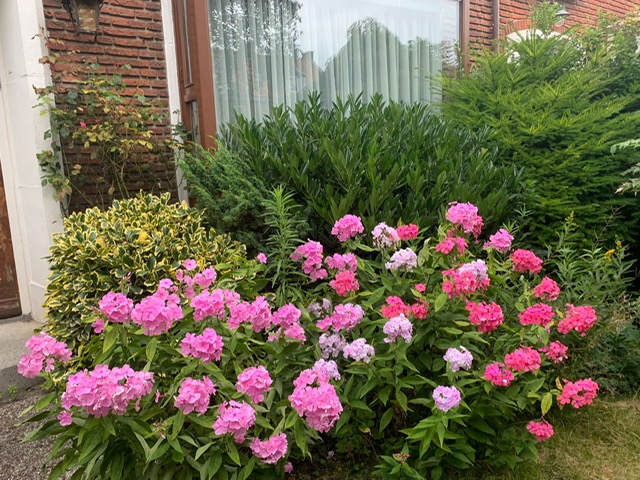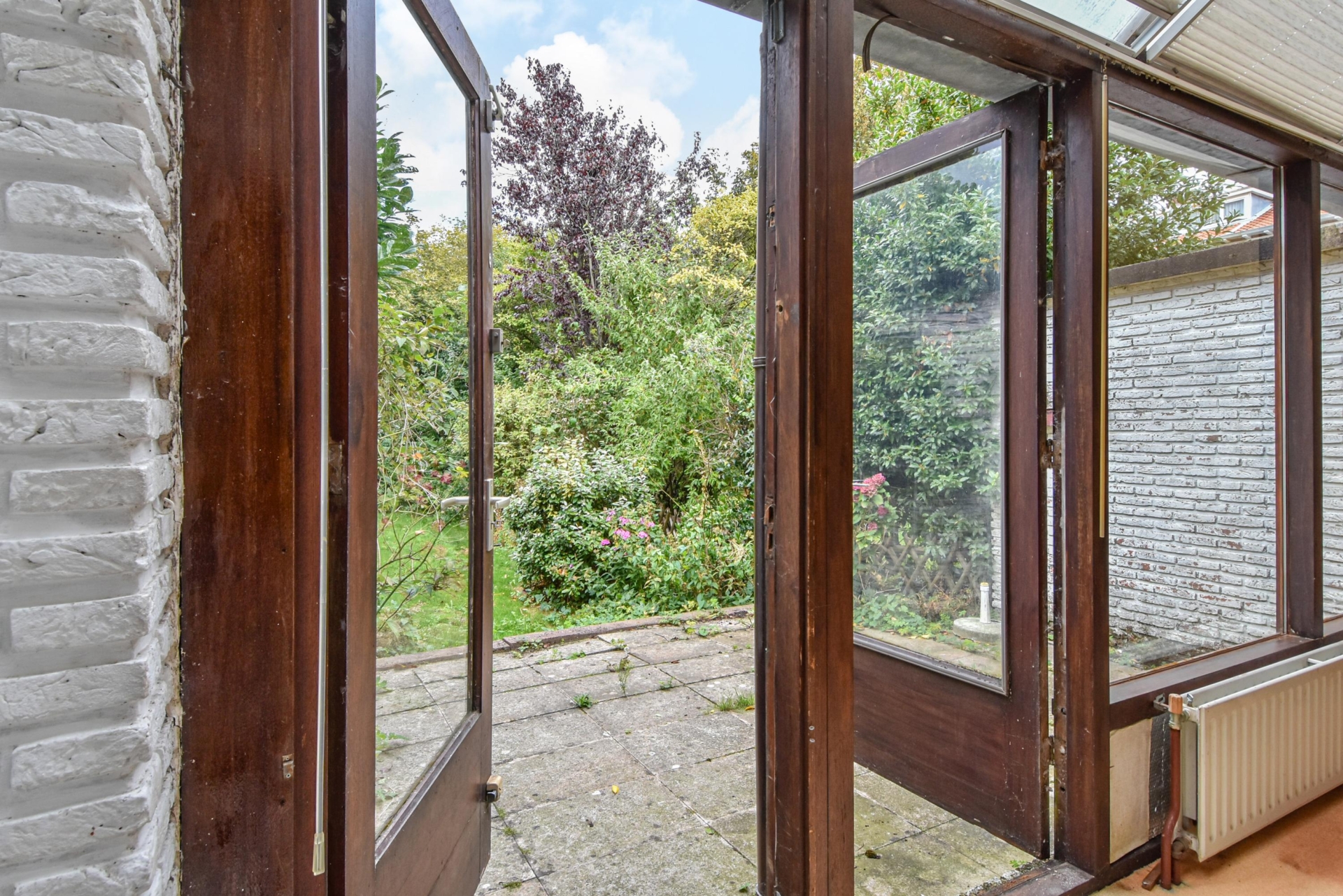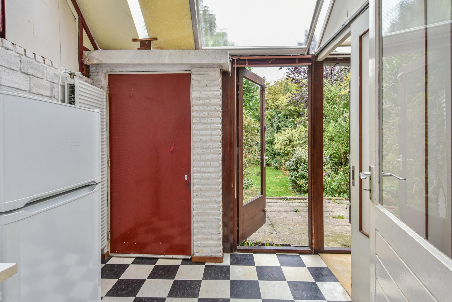 Vanuit de serre is er toegang tot de stenen schuur en de heerlijke, besloten achtertuin met een royaal terras, gazon en plantenborders. Achterin de tuin staat een oude houten schuur.