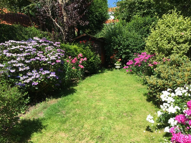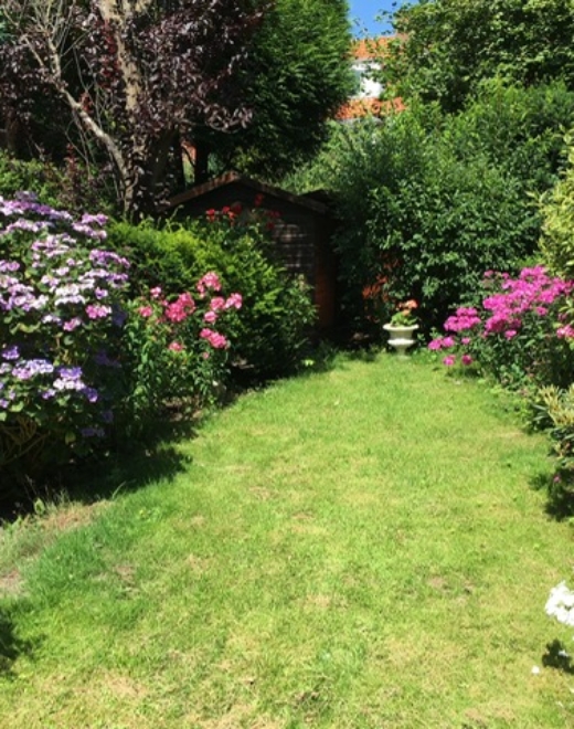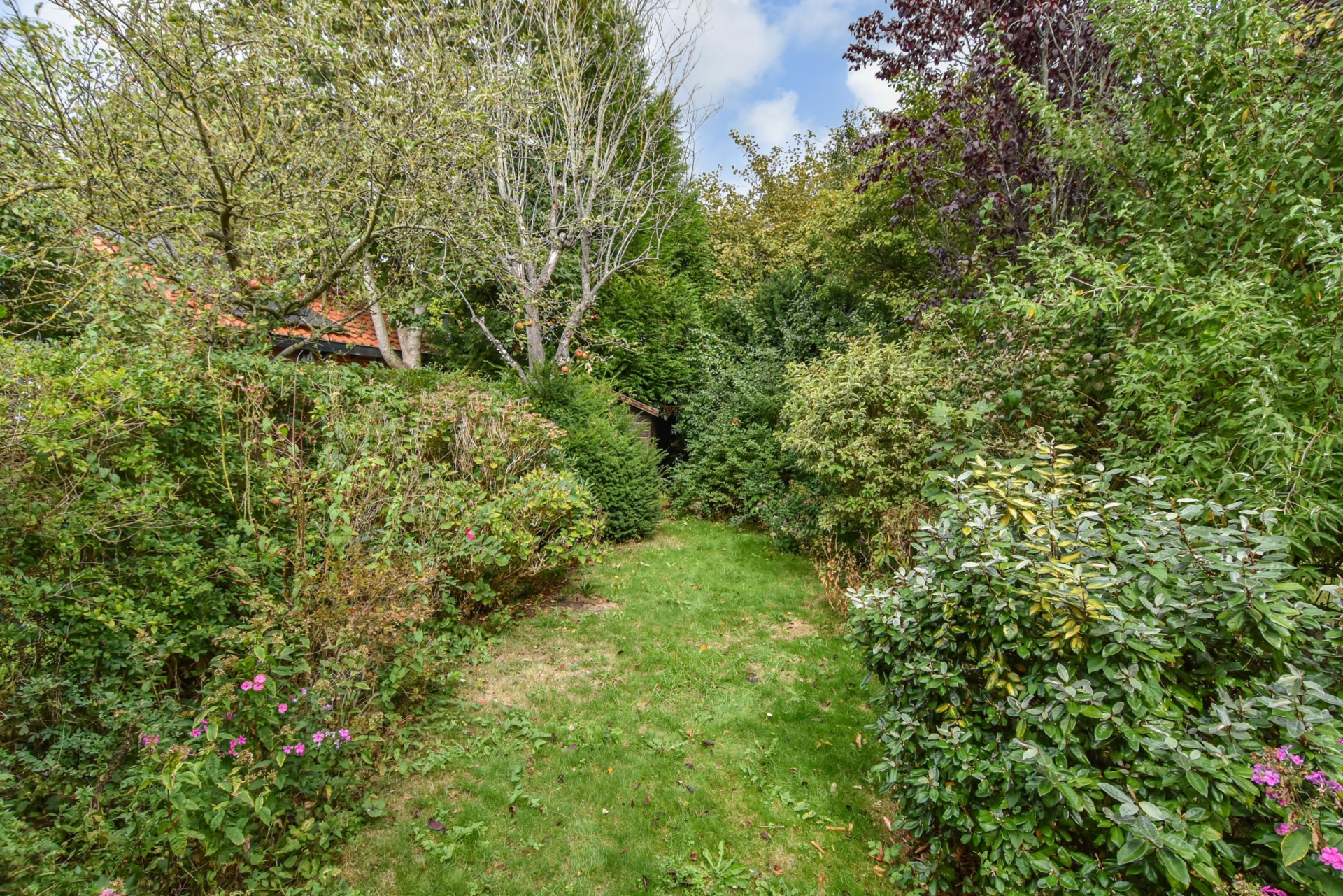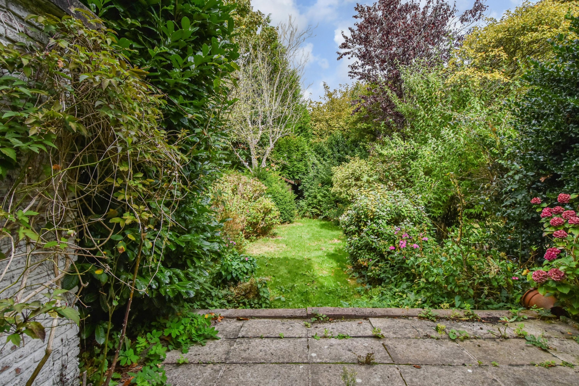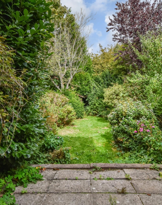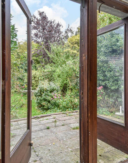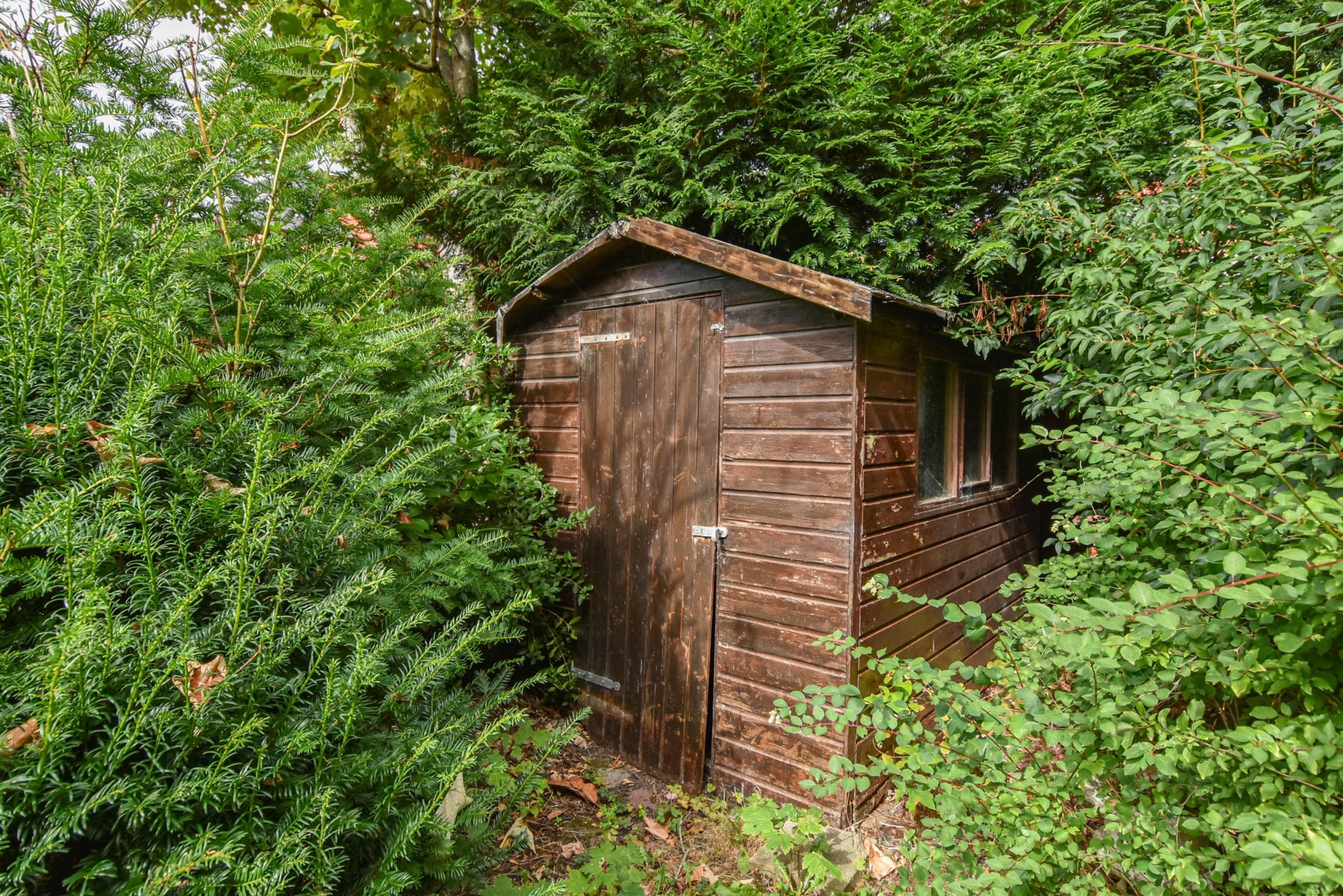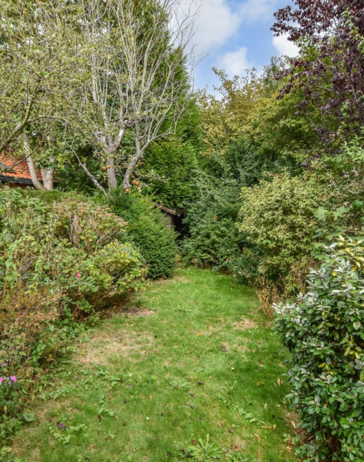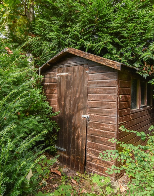 From the conservatory, there is access to a stone shed and the delightful, secluded back garden with a large terrace, lawn, and mature planting borders. At the rear of the garden is an old wooden shed.