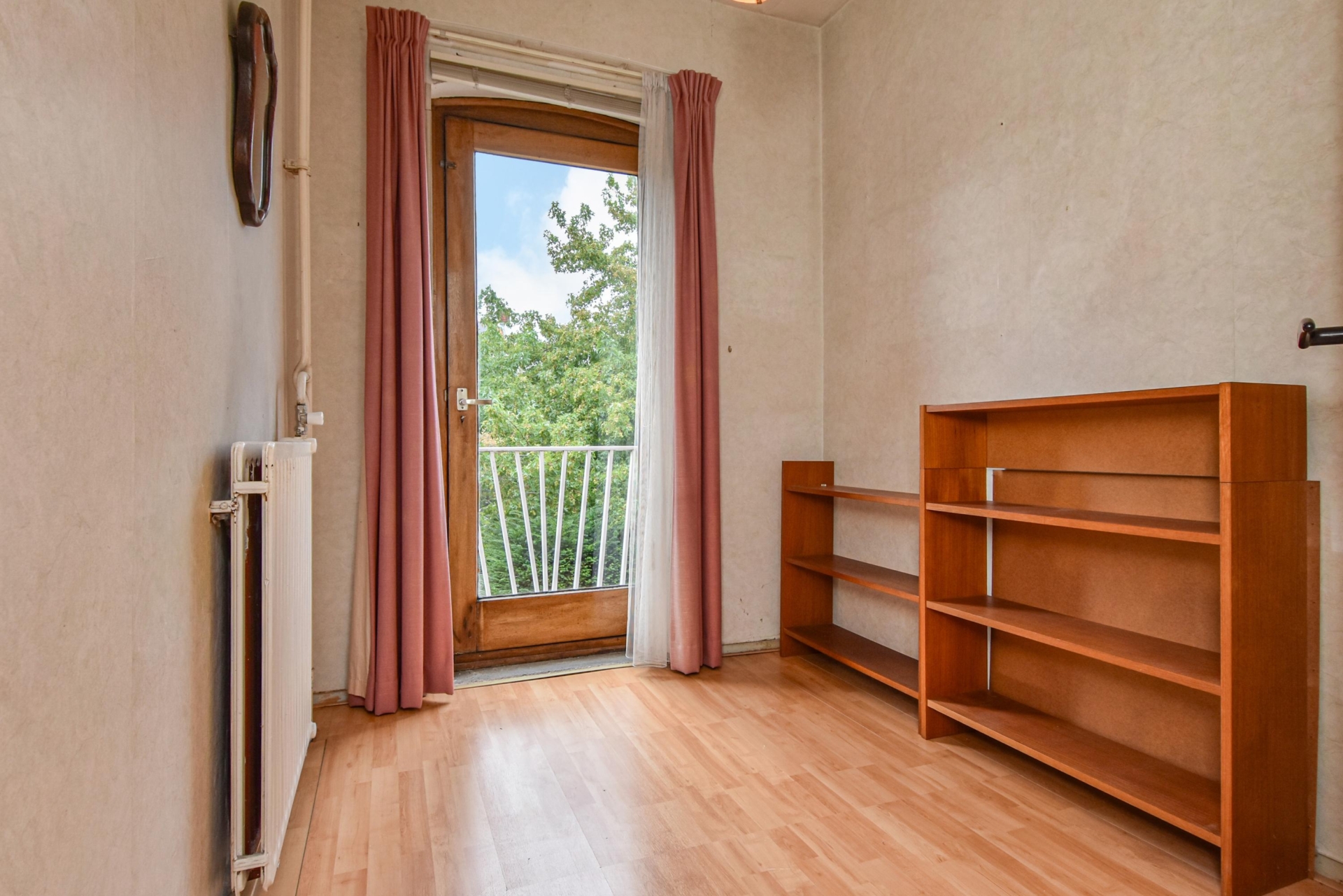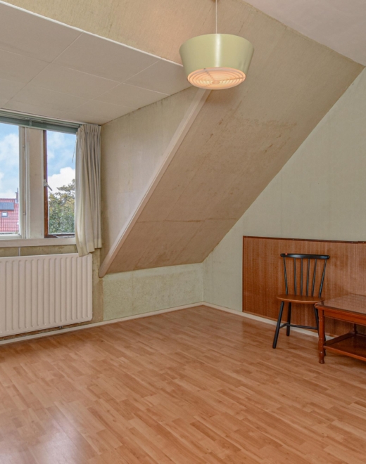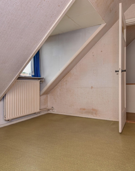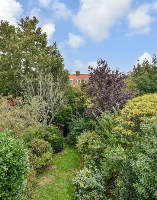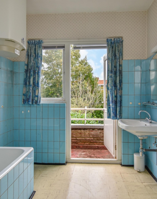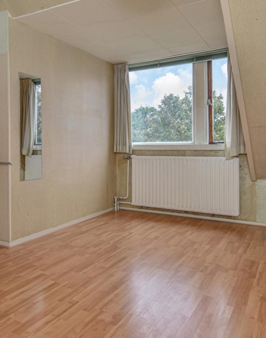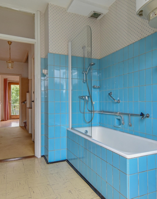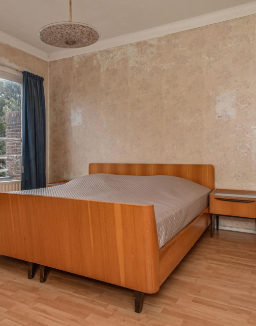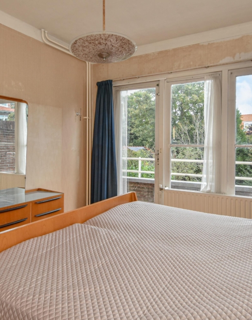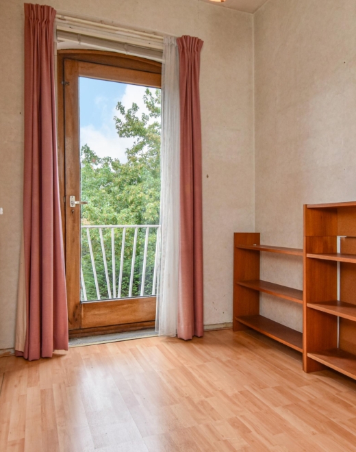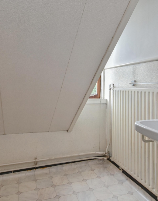The second floor offers a large landing with ample storage space at the front. There are two charming bedrooms — one at the front and one at the rear — both with built-in wardrobes. The rear bedroom enjoys beautiful, unobstructed views over the gardens of the Vogelwijk. A second bathroom is also located on this floor and offers great potential for renovation.