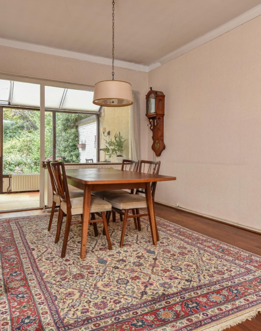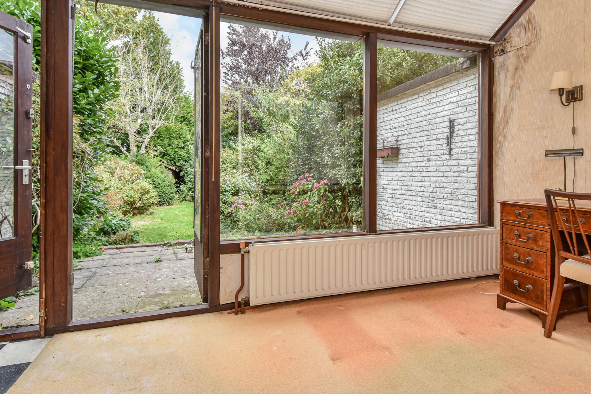 The generous living and dining rooms feature a charming parquet floor and a fireplace. The bright conservatory provides access to the basement — perfect for additional storage. The kitchen has a simple layout with a gas hob, and the fridge-freezer in the conservatory will remain.