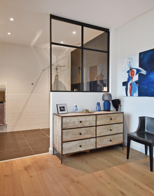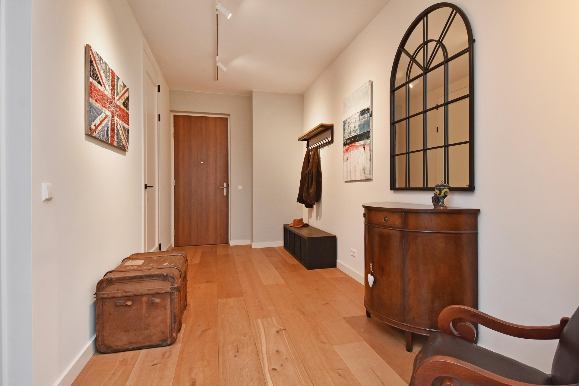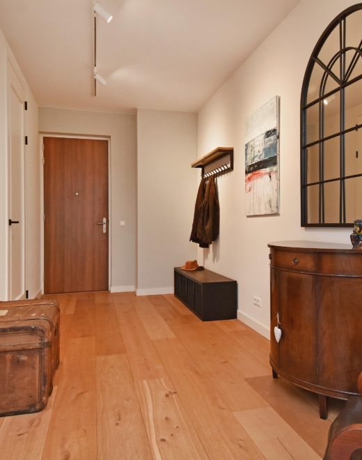 Elegant communal entrance with doorbell and mailbox panel and access to the lift leading to the third floor. Upon entering the apartment, the beautifully finished wooden floor immediately stands out, which is equipped throughout with comfortable underfloor heating. The water for the underfloor heating, supplied by the VGHE installation, is heated in winter and cooled in summer, ensuring a pleasant and constant indoor temperature all year round.