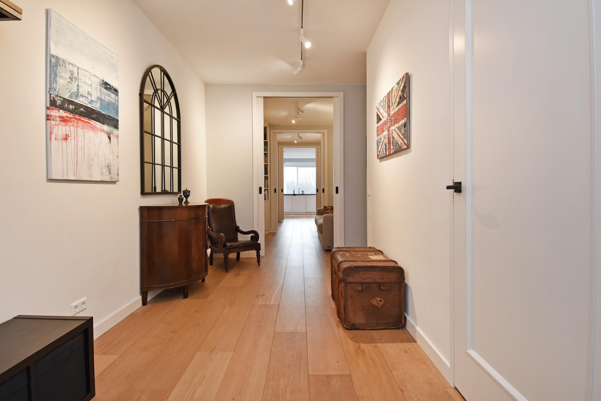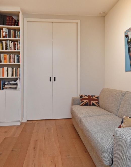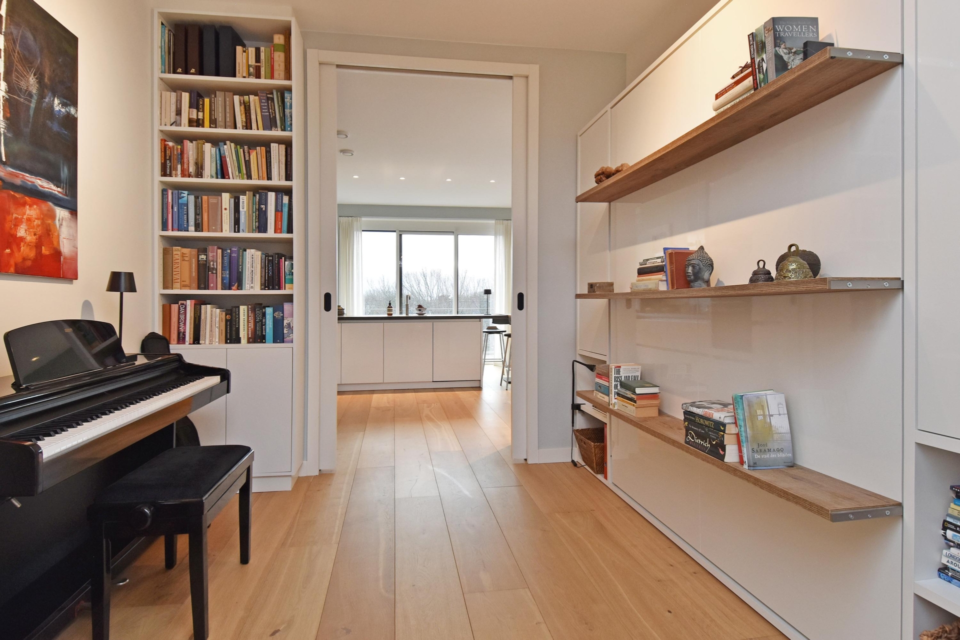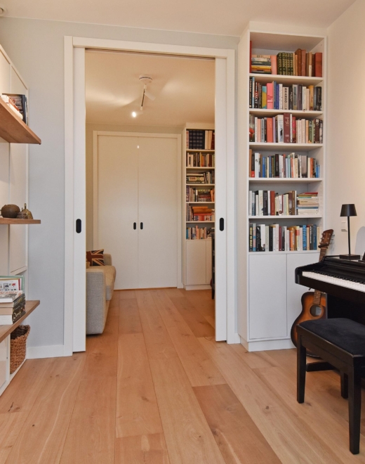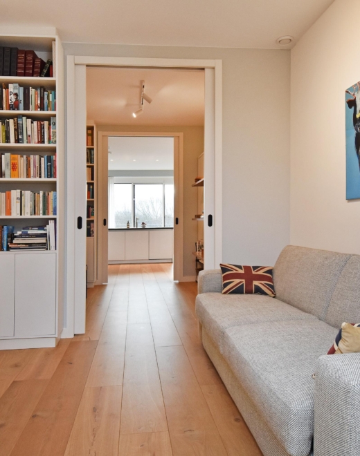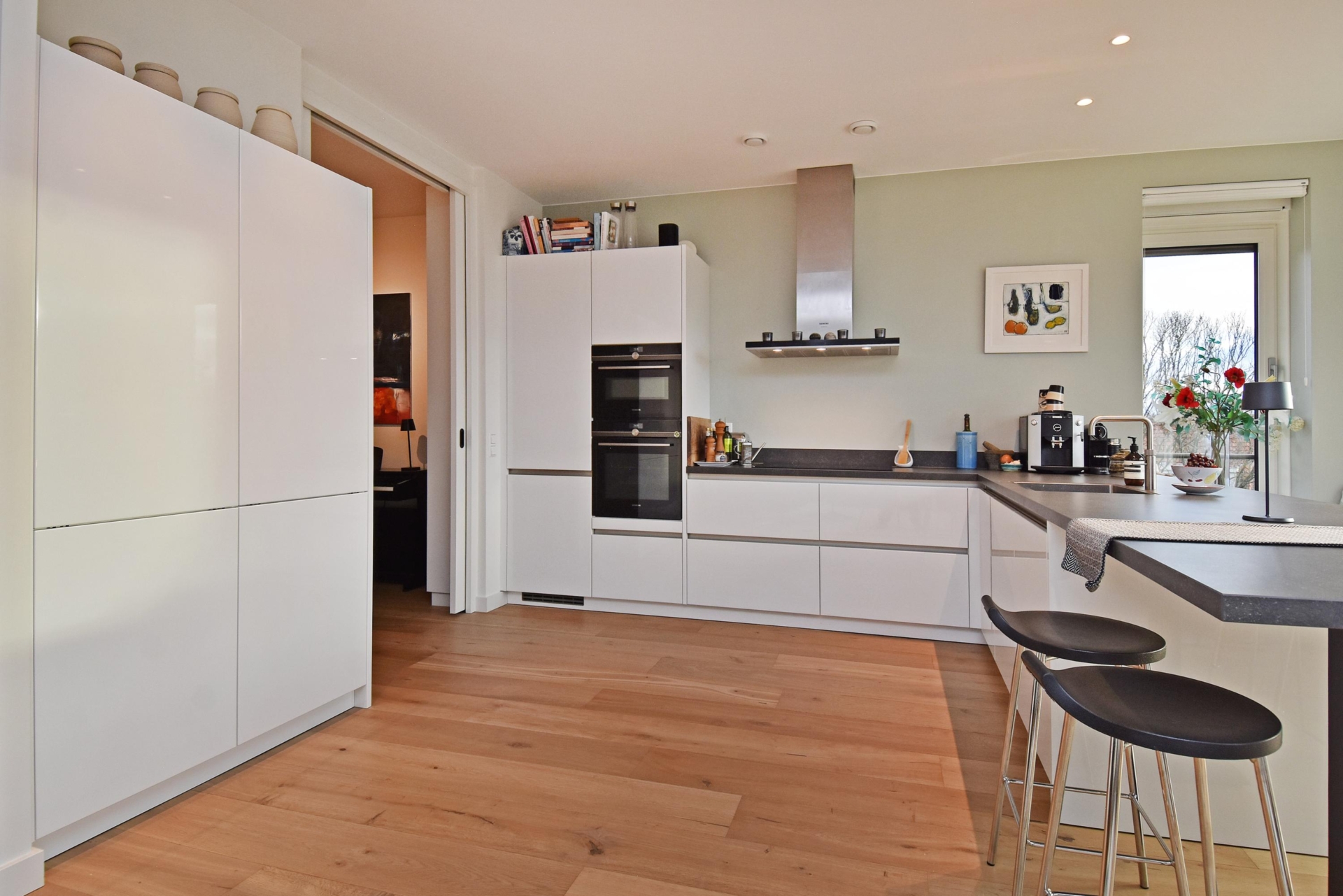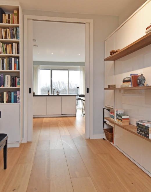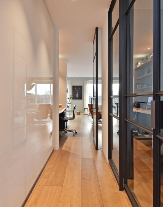 The wide hallway continues towards the kitchen and offers the possibility—by means of sliding doors—to effortlessly create separate spaces that can be used as a home office and/or guest room. When the doors are left open, these areas naturally blend into the living space, enhancing the sense of openness and light.