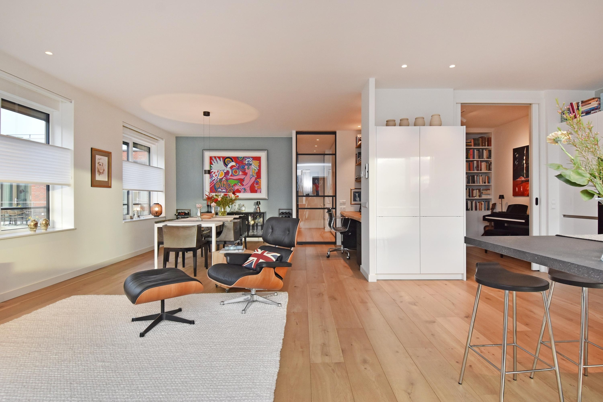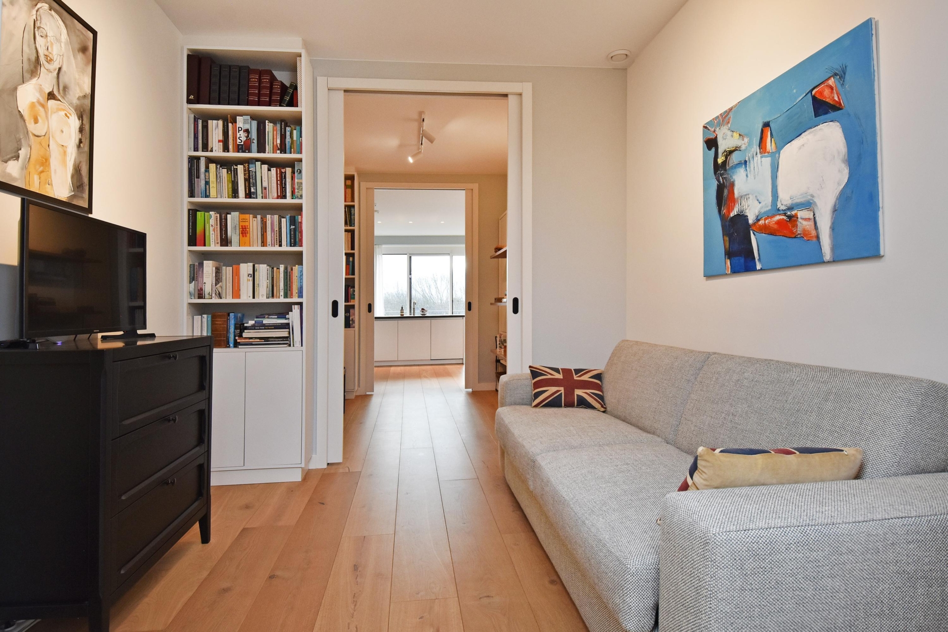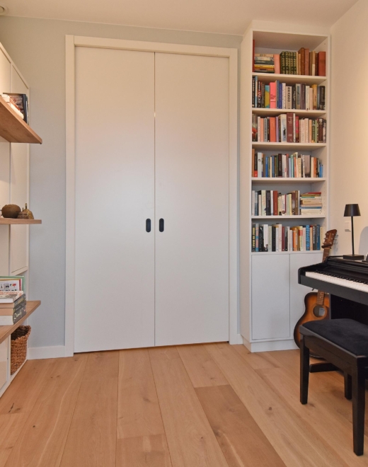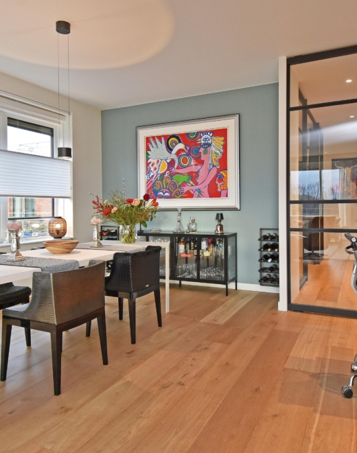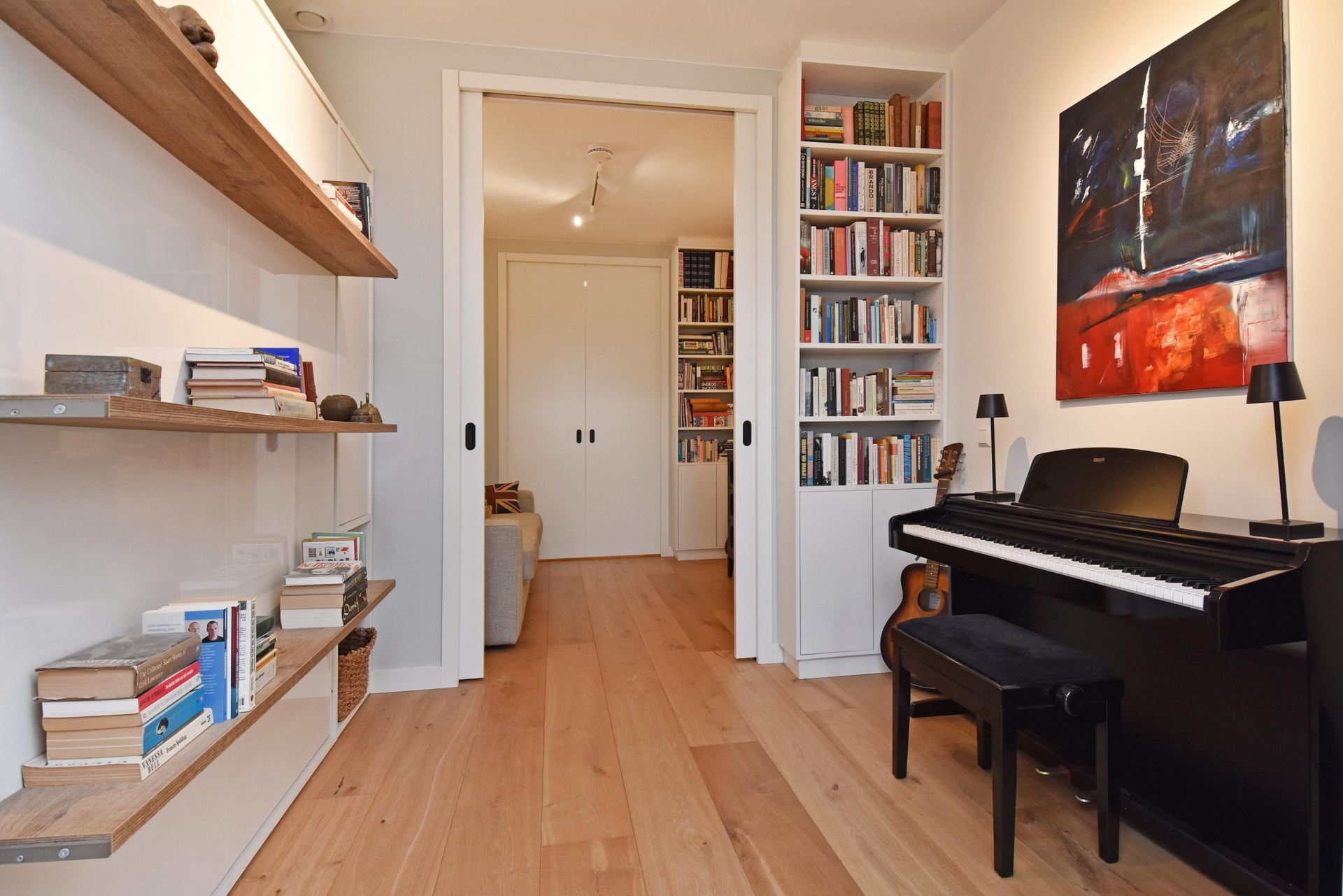 The wide hallway continues towards the kitchen and offers the possibility—by means of sliding doors—to effortlessly create separate spaces that can be used as a home office and/or guest room. When the doors are left open, these areas naturally blend into the living space, enhancing the sense of openness and light.