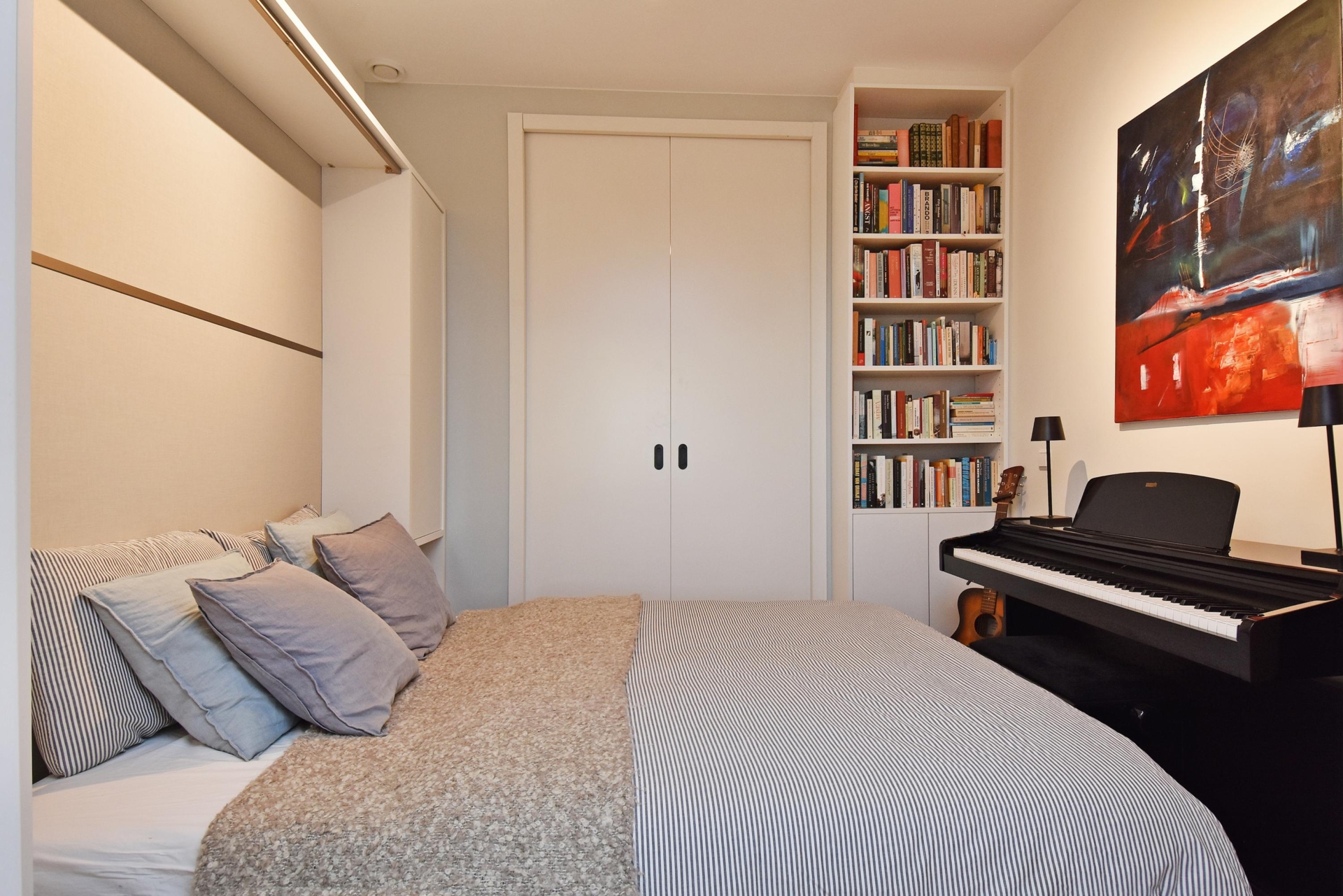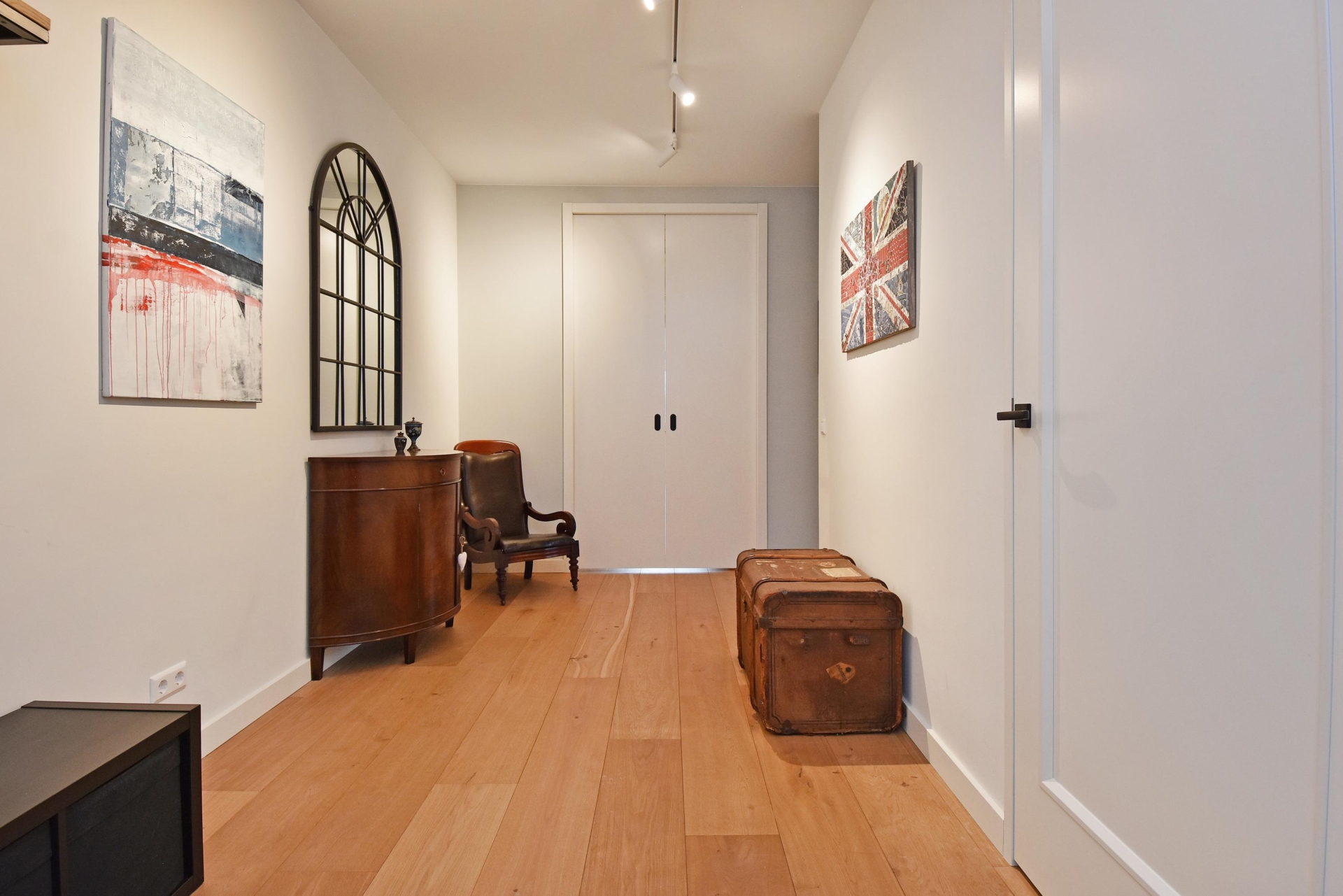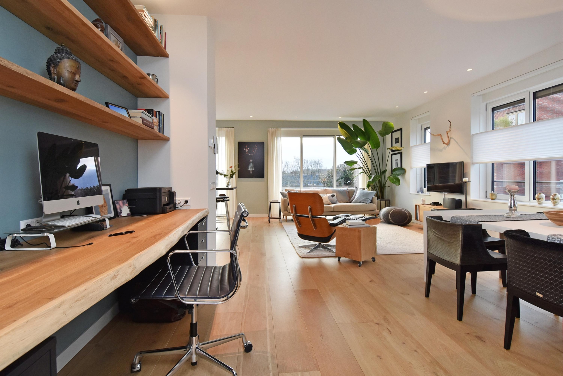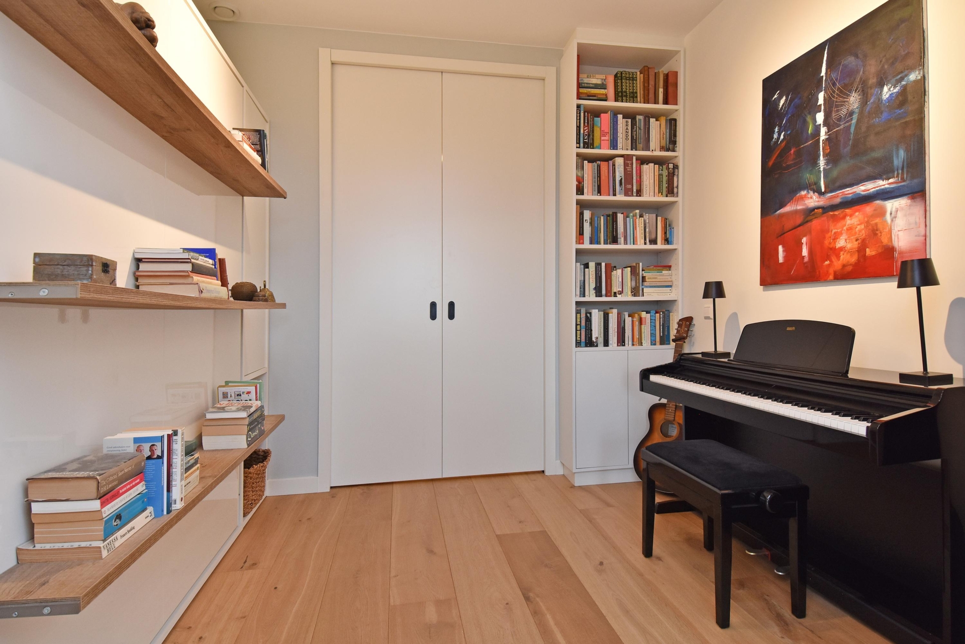 The wide hallway continues towards the kitchen and offers the possibility—by means of sliding doors—to effortlessly create separate spaces that can be used as a home office and/or guest room. When the doors are left open, these areas naturally blend into the living space, enhancing the sense of openness and light.