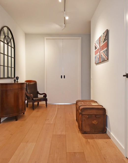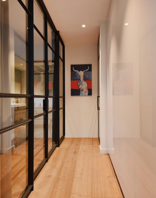 Alongside the dining area, a generous workspace has been created, which is accessed through a pivot door leading to a hallway fitted with a large, practical wall of cupboards.