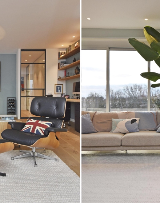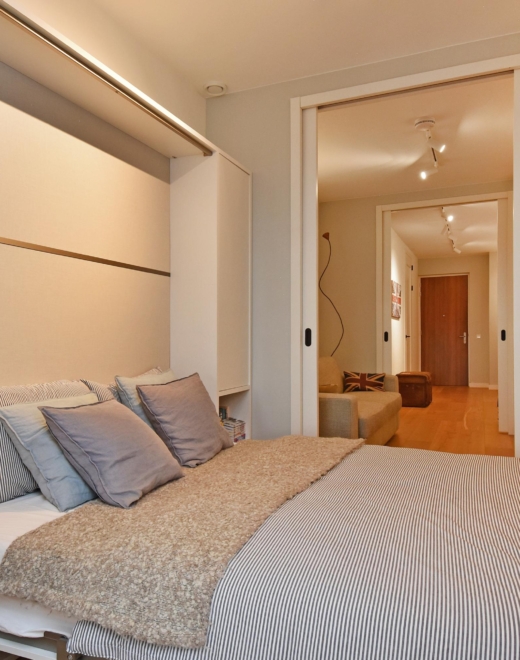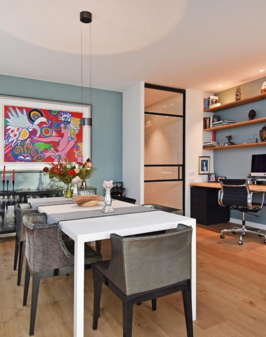 The apartment has been cleverly designed with flexible solutions, allowing the creation of two additional rooms that can serve as bedrooms and/or home offices.
