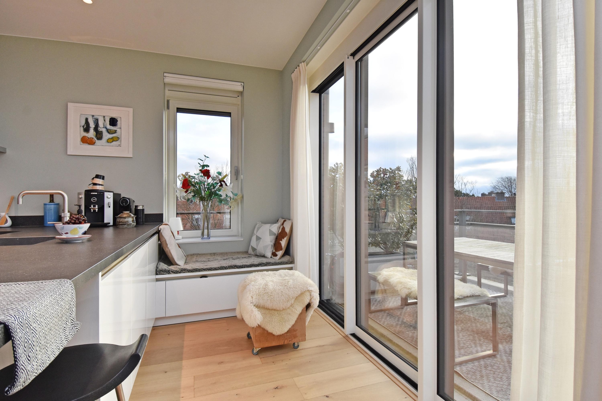 The open, luxurious kitchen is arranged in a practical L-shaped layout and is equipped with a Quooker providing sparkling and chilled water, a dishwasher, ample drawers with generous storage space, a ceramic worktop, recirculation extractor hood, induction hob, double oven and a fridge-freezer combination. Adjacent to the kitchen, a cosy seating area has been created where you can enjoy a quiet cup of coffee in the morning sun. On the opposite side, a fixed wall of cupboards offers additional storage.
