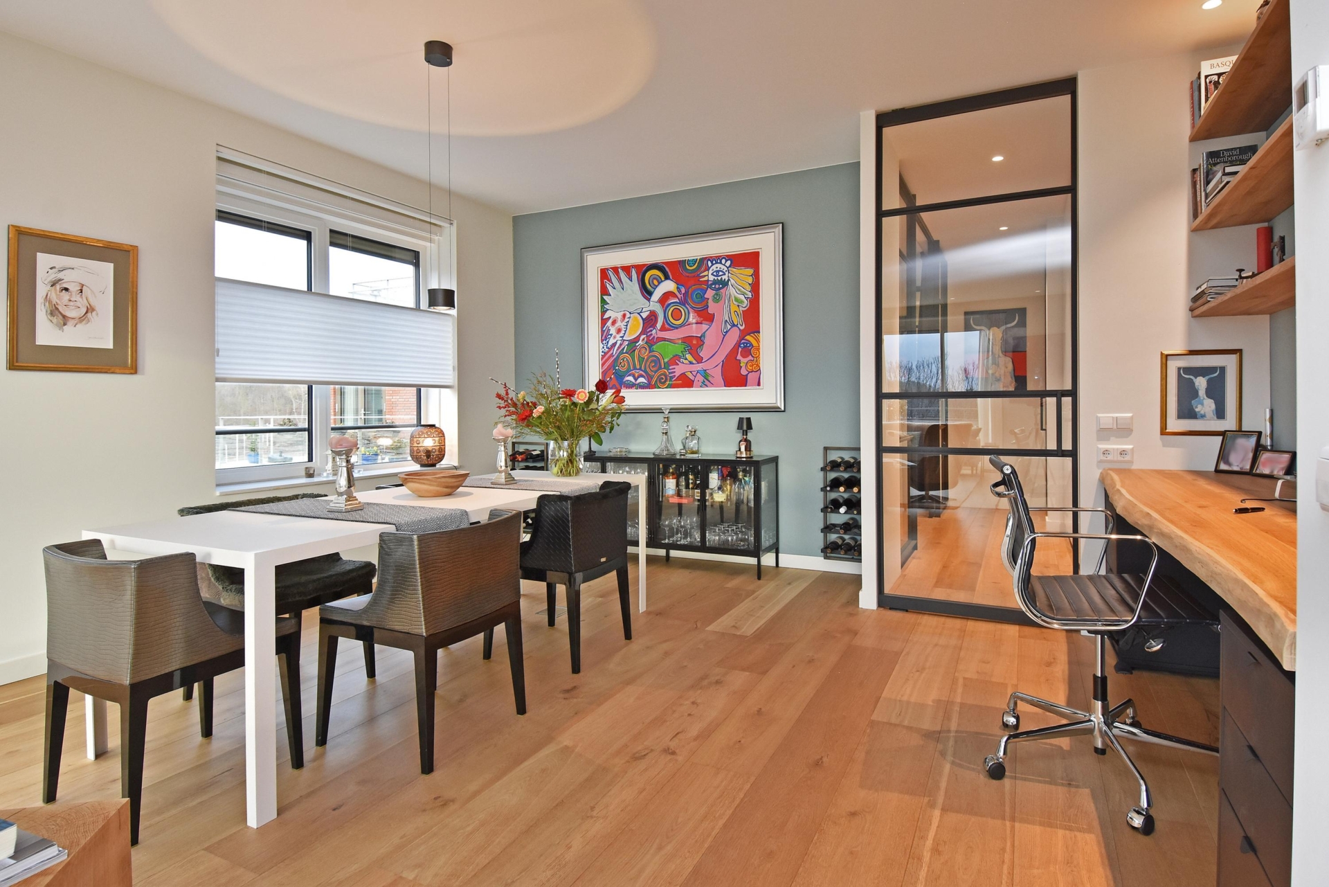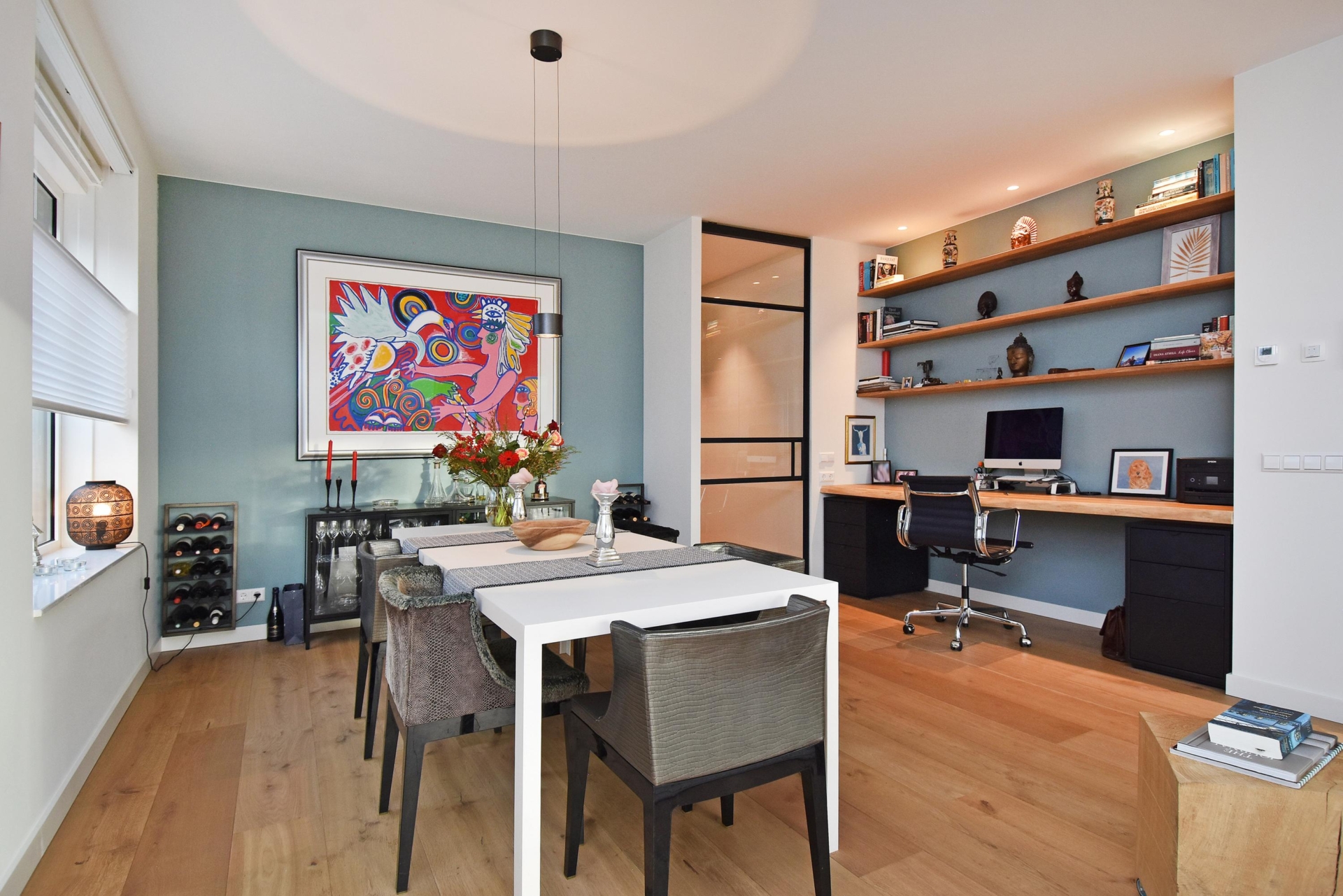Aan de zijkant van de eetkamer is een royale werkplek gecreëerd, die middels een taatsdeur toegang biedt tot de gang waar een praktische, grote kastenwand is geplaatst.