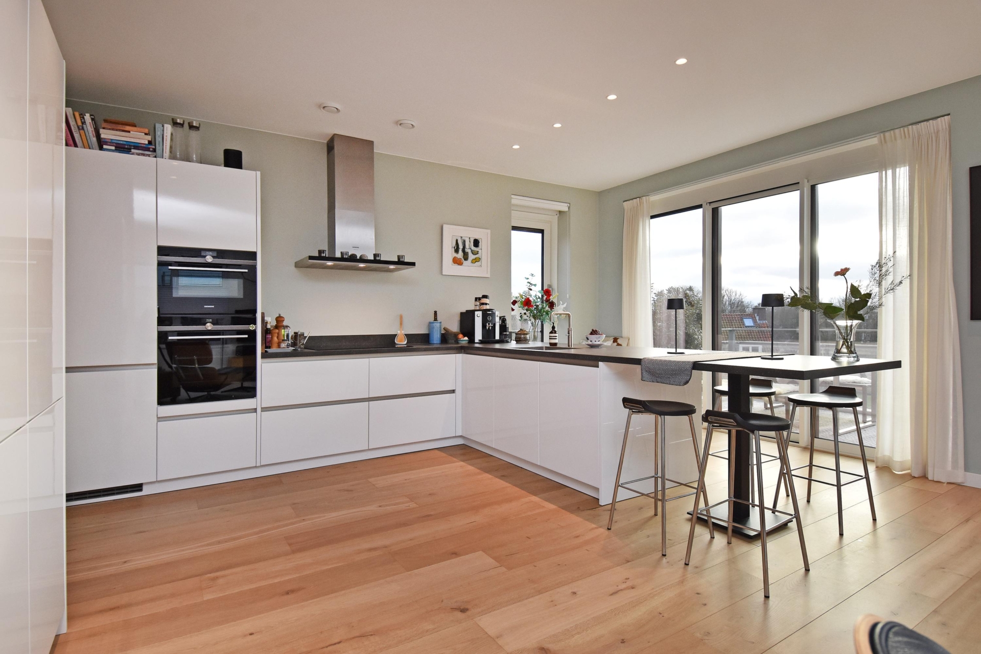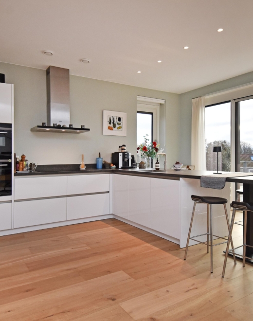 De open, luxe keuken is uitgevoerd in een praktische L-vormige opstelling en voorzien van een Cooker met bruis- en gekoeld water, een vaatwasser, veel lades met ruime bergruimte, een keramisch werkblad, een recirculatiekap, een inductiekookplaat, een dubbele oven en een koel-/vriescombinatie. Aan de keuken is een fijne zitplek gecreëerd waar je in alle rust kunt genieten van een kop koffie in de ochtendzon. Aan de andere zijde bevindt zich een vaste kastenwand die zorgt voor extra opbergruimte.