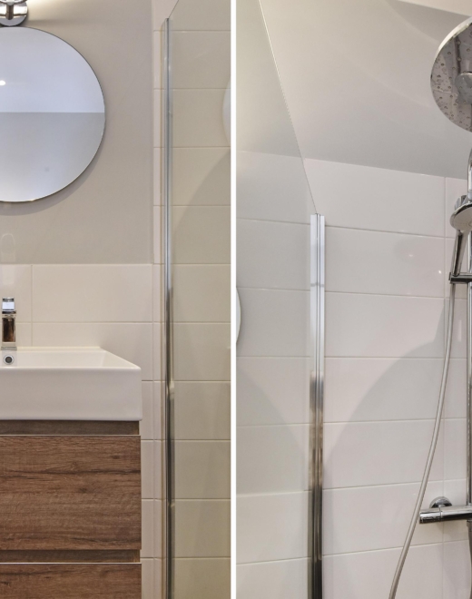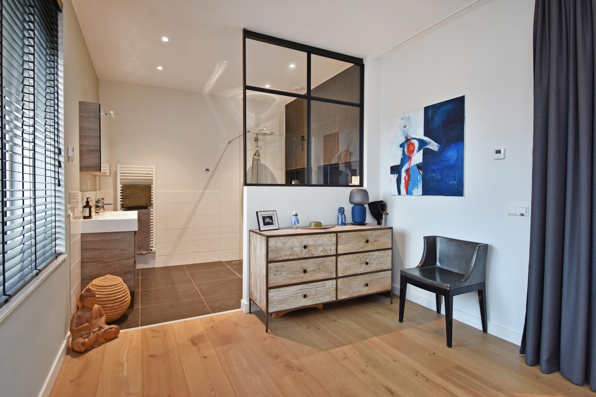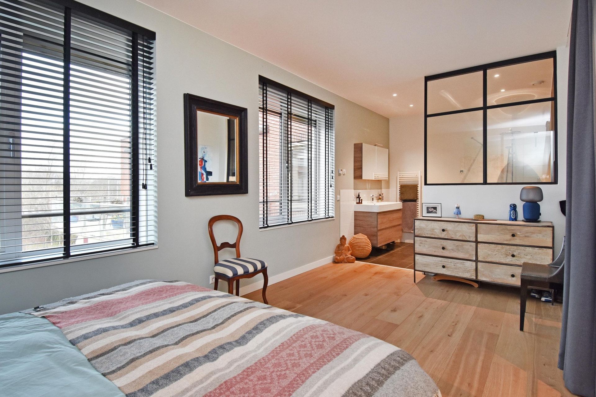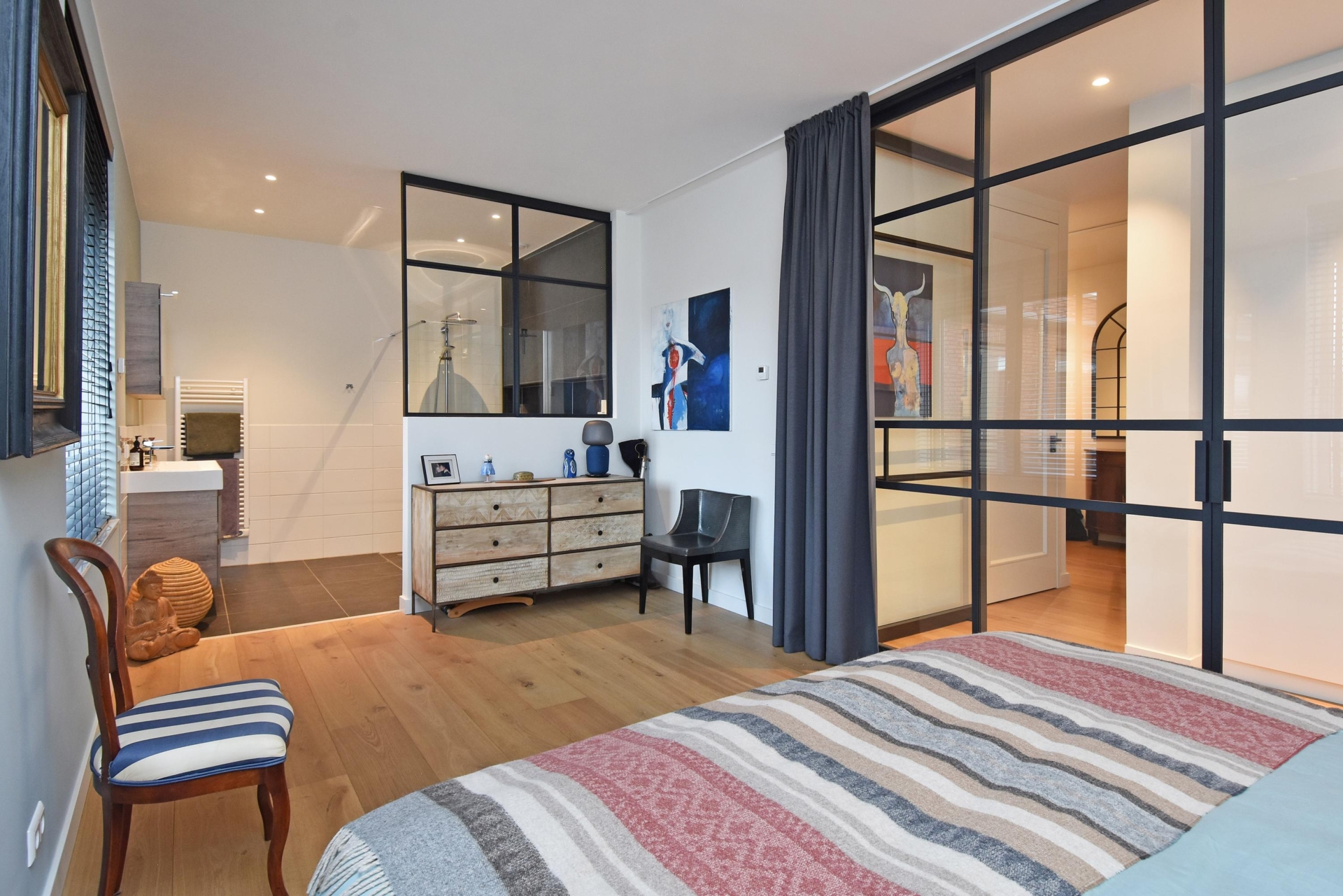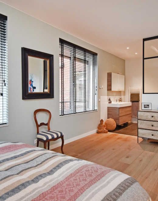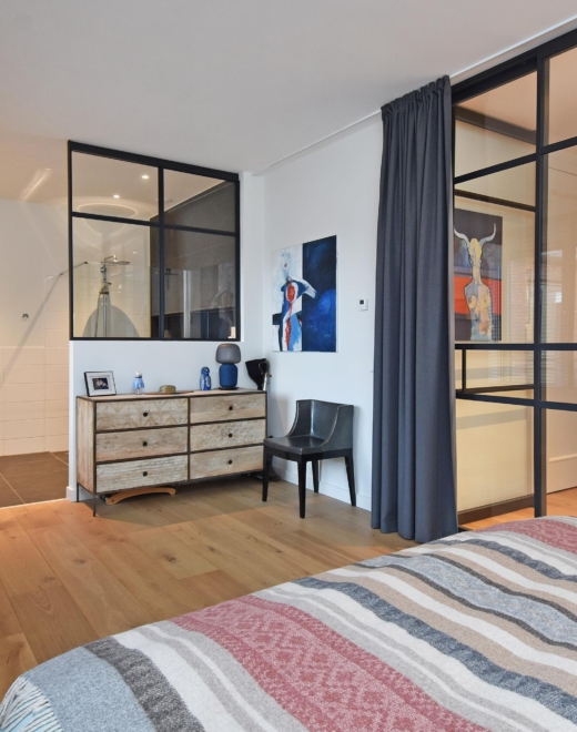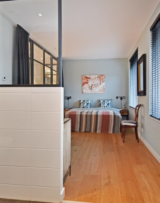 De ruime slaapkamer is toegankelijk vanaf de gang en de woon/eetkamer via stijlvolle stalen taatsdeuren en beschikt over een en-suite badkamer. Deze is uitgevoerd met een vrijhangend toilet, een royale inloopdouche, een designradiator en een groot, vast wastafelmeubel.