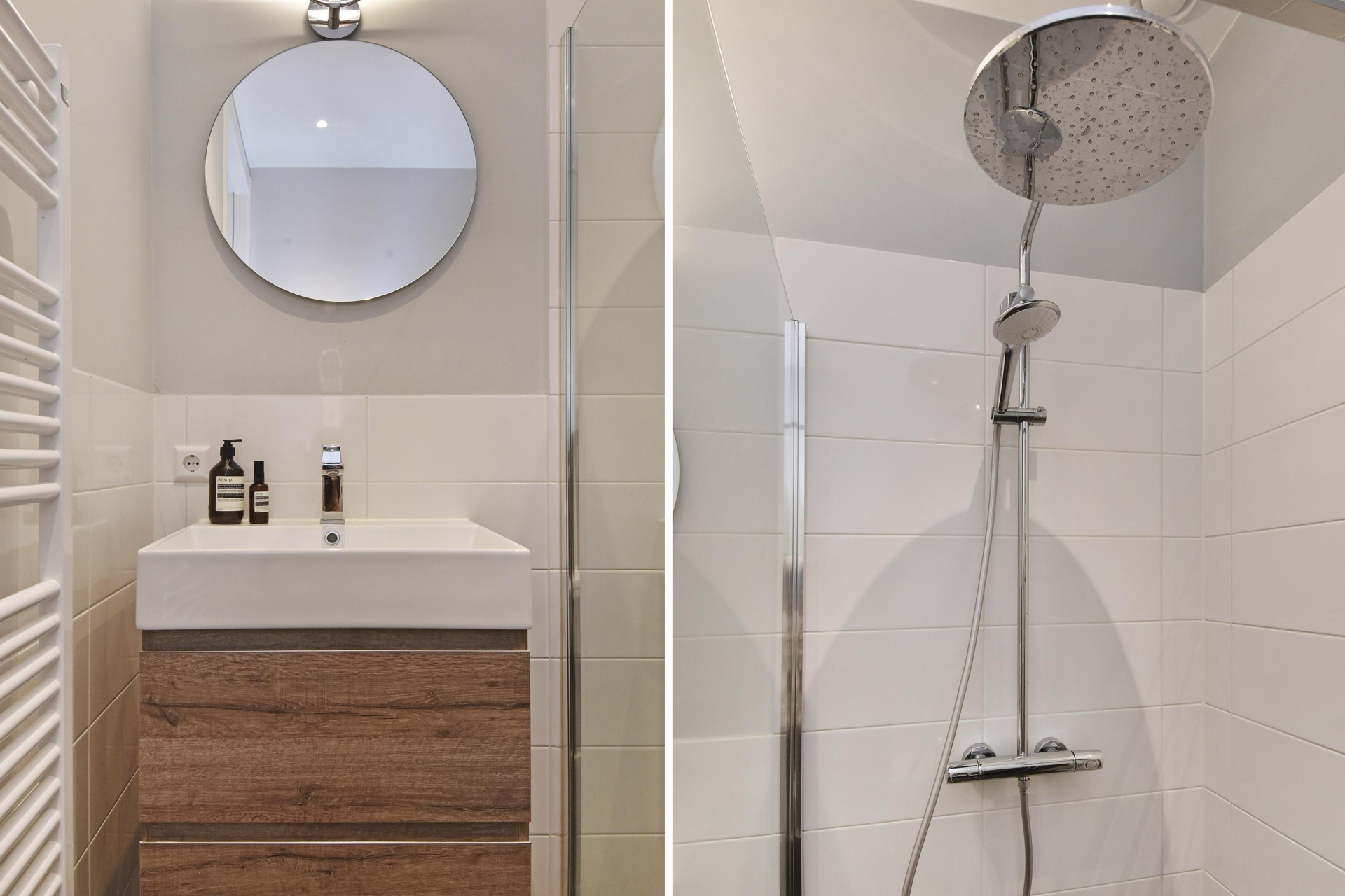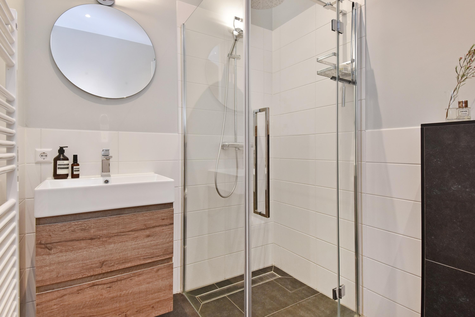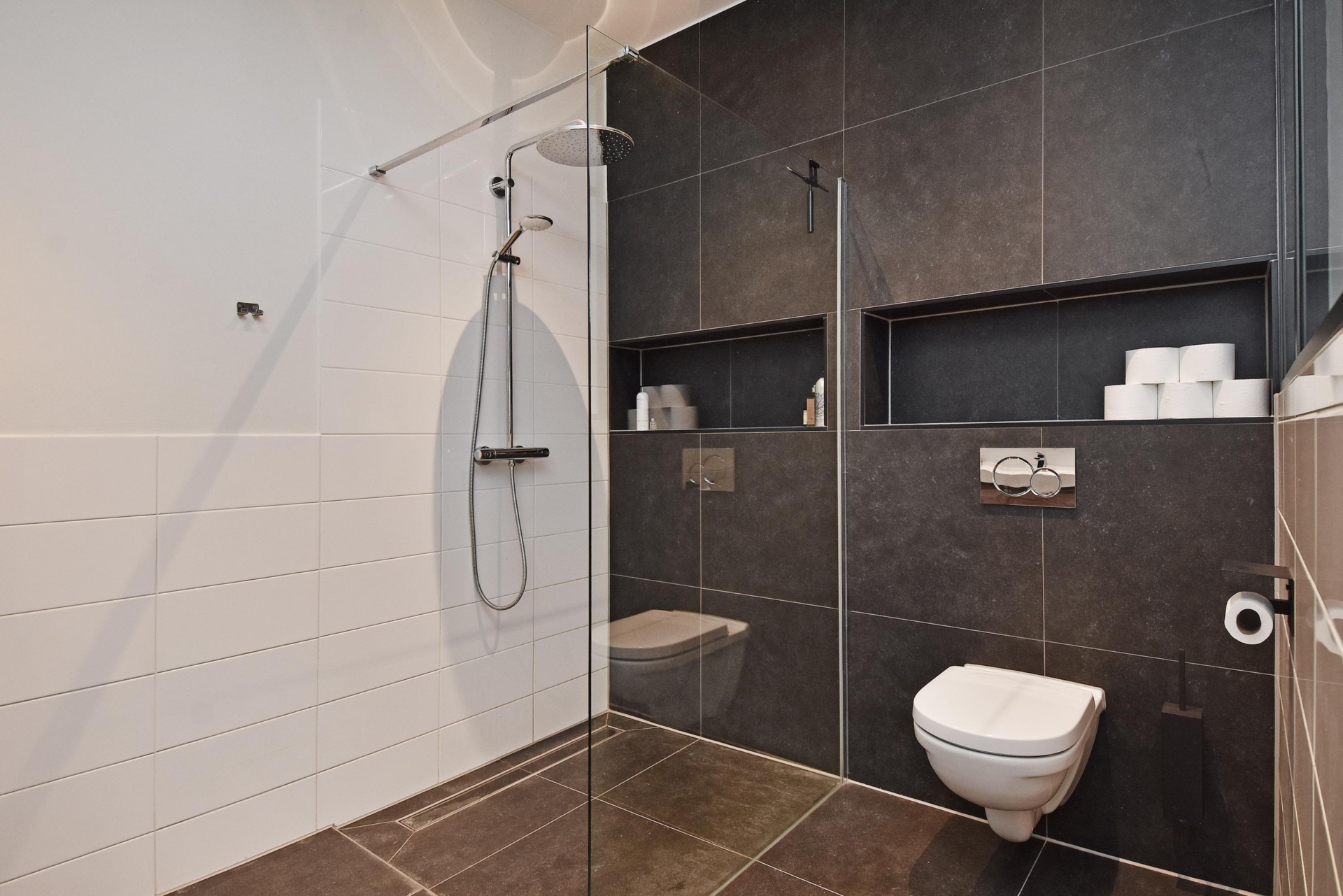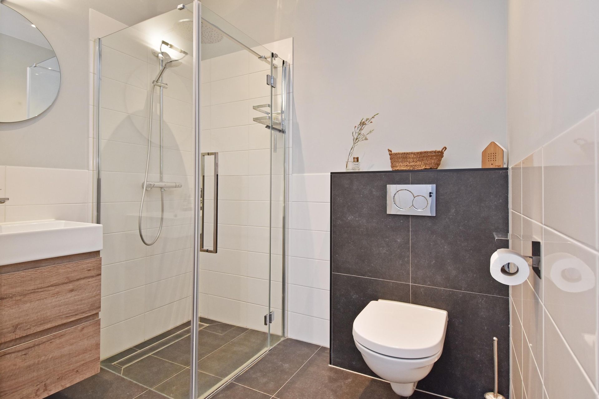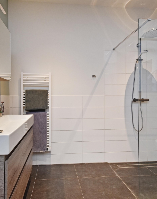De ruime hal beschikt over een praktische garderobehoek. Vanuit hier is de gasten badkamer bereikbaar, die is uitgevoerd met een vrij hangend toilet, een modern wastafelmeubel, een designradiator en een comfortabele inloopdouche.