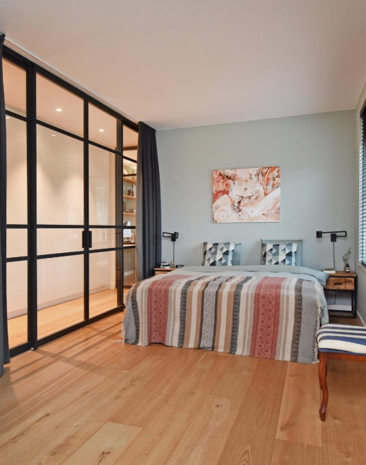 De ruime brede hal loopt door tot aan de keuken. In deze hal kunnen middels schuifdeuren in een handomdraai ruimtes worden gecreëerd als werk- en/of logeerkamers. Laat je de deuren open, dan worden deze ruimtes op natuurlijke wijze bij de leefruimte betrokken en ontstaat er een extra ruimtelijk gevoel.